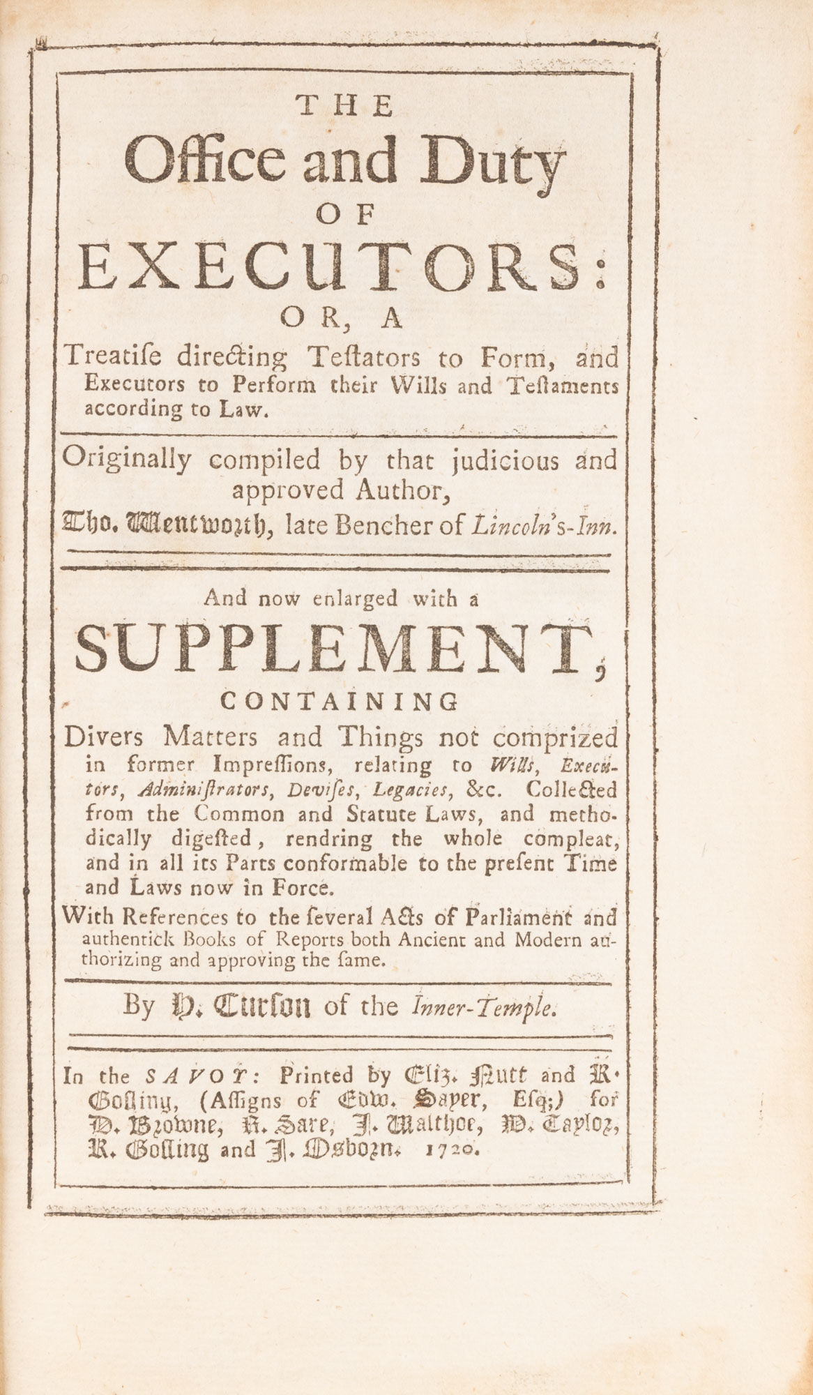 1720. The Foundation of All Similar Productions" Wentworth, Thomas [c.1568-1628]. Curson, H[enry], Editor. The Office and Duty of Executors: Or, A Treatise Directing Testators to Form, And Executors to Perform Their Wills and Testaments According to Law. Originally Compiled by That Judicious and Approved Author, Tho. Wentworth, Late Bencher of Lincoln's-Inn. And Now Enlarged with a Supplement, Containing Divers Matters and Things not Comprized in Former Impressions, Relating to Wills, Executors, Administrators, Devises, Legacies, &c. Collected from the Common and Statute Laws, And Methodically Digested, Rendring the Whole Compleat, And in All its Parts Conformable to the Present Time and Laws now in Force. With References to the Several Acts of Parliament and Authentick Books of Reports both Ancient and Modern Authorizing and Approving the Same. By H. Curson of the Inner-Temple. [London]: Printed by Eliz. Nutt and R. Gosling, 1720. [iv], vi, [10], 468, [72] pp. Octavo (7-3/4" x 4-3/4"). Contemporary calf, rebacked in period style, blind rules to boards, blind fillets along joints, blind tooling to board edges, raised bands, lettering piece, blind fillets and gilt publication date to spine, hinges mended. Minor nicks, scuffs and tiny stains to boards, moderate rubbing to board edges, corners bumped, early owner signature (Wm. Orde) to front and rear pastedowns. Moderate toning to interior, faint dampspotting to a few leaves. $400. * Later edition. First published in 1641, the "authorship of this treatise is ascribed to Mr. Justice Dodderidge, though the work is commonly Known as Wentworth's Executors. It constitutes the foundation of all similar productions of the kind, and has always been regarded as a high authority in these matters" (Marvin). This was a popular and well-received work that went through several editions and issues into the nineteenth century. Marvin, Legal Bibliography 724-725. English Short-Title Catalogue R220926.