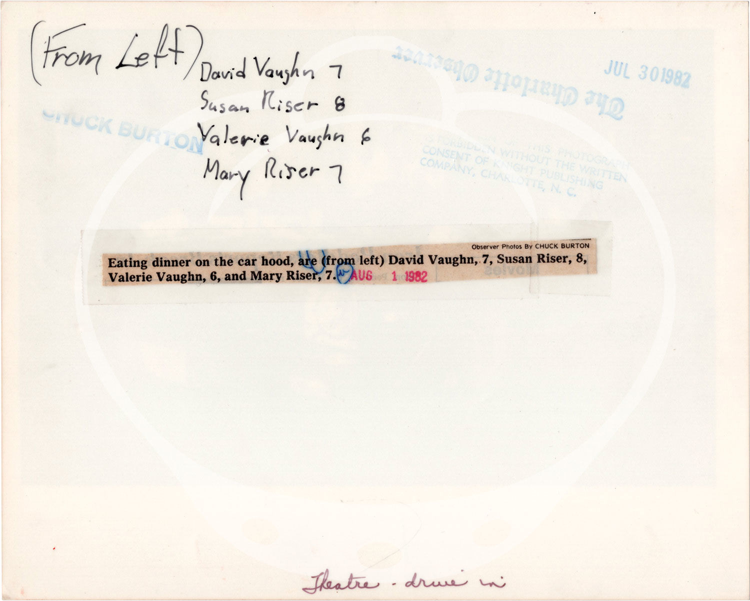 N.p.: N.p., 1991. Nine vintage photographs of drive-in theaters in the Charlotte, North Carolina region. Several photographs credit photographers Elmer Horton, Steve Perille, Chuck Burton, and Laura Mueller, and are dated variously between 1978 and 1991.