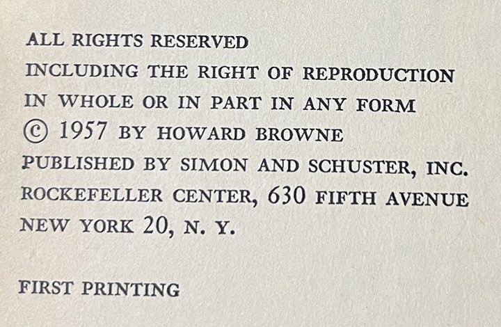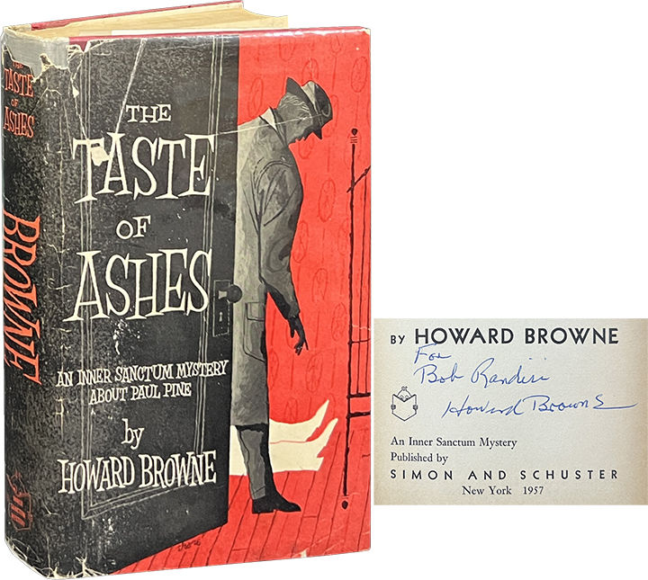 New York: Simon and Schuster, 1957. First Edition. Hardcover. Very Good/Good. Inscribed by Browne to pulp writer Robert Randisi. Very Good in a Good jacket, unclipped ($2.95), generally rubbed and creased, chips at the head and foot of the spine. Quarter grey buckram with red paper on the boards, rubbed at the corners. Square, bound with some reading wear, toned pages. The fourth Paul Pine mystery, a classic in the genre.