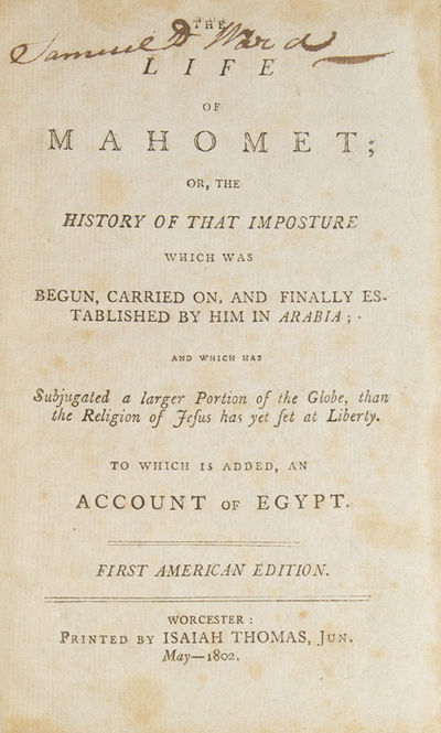 Worcester: Isaiah Thomas, Junior, 1802. First American edition. viii, [13]-154, [2, ads] pp. 1 vols. 8vo. Contemporary sheep, spine with gilt rules. Signed on flyleaf and title, Samuel D. Ward. Very good plus. First American edition. viii, [13]-154, [2, ads] pp. 1 vols. 8vo. Polemical tract on the superiority of Christianity to the imposture of Mahomet, in which “the author has, on every suitable occasion, made such moral reflection as seemed naturally to arise out of the topics before him.”