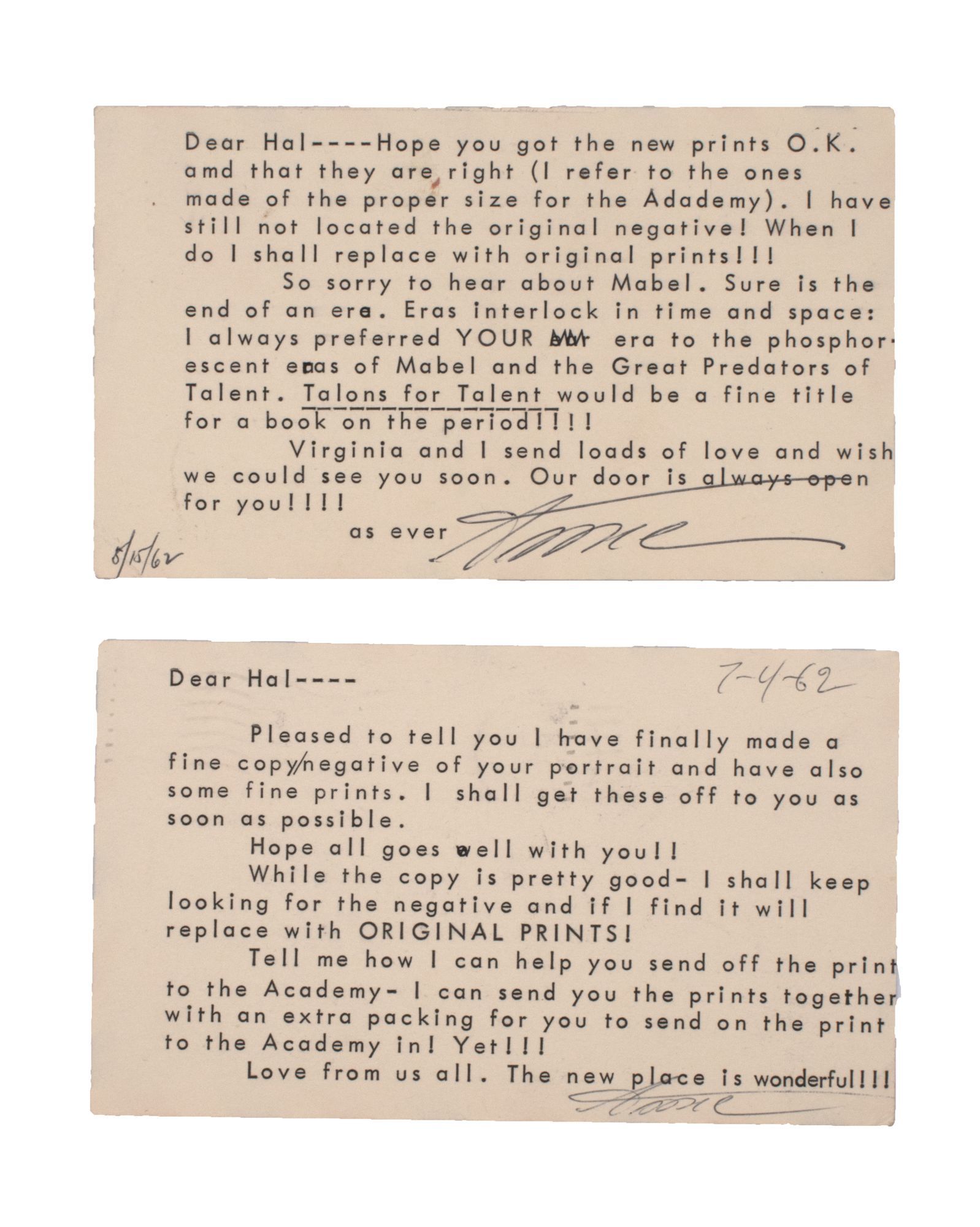 1962. Two typescript and holograph signed (both signed in the hand of Ansel Adams) postcards addressed to "Hal" (Witter Bynner) from Ansel Adams; [7/4/1962], and one regarding the death of Mabel Dodge (Luhan) Sterne, the wealthy Taos based arts patron. [8/15/1962]; near fine. Ansel Adams was one of many artists and writers that was friends with writer Witter Bynner (b.1881 - d.1968), having stayed with him and his partner Bob Hunt in Santa Fe. In this letter from the Fourth of July 1962 Adams writes to Bynner regarding a portrait the photographer had made of Bynner. In his follow-up letter the next month Adams mentions the prints and brings up the death of Mabel Dodge (Luhan) Sterne, the wealthy Taos based arts patron and subject of Bynner's play, Cake, which satirized the infamous "founder" of the Taos literary and art colony.