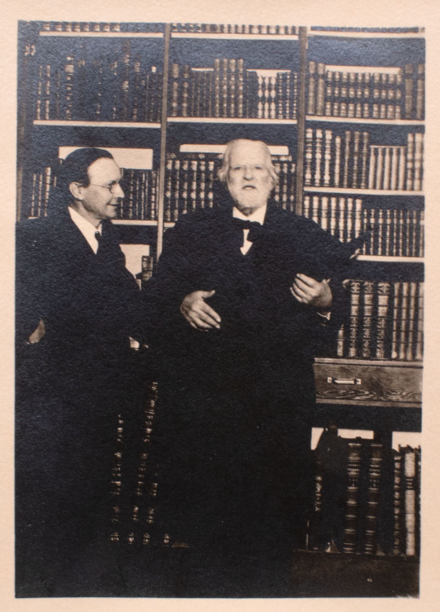 Los Angeles, 1930. 5" x 3.5. Black and white photograph, manuscript writing in unknown hand on verso. 5" x 3.5" Ernest Dawson (b.1882 - d.1947) was an antiquarian bookseller and founder of Los Angeles' legendary Dawson's Book Shop. Edwin Markham (b.1852 - d.1940) was a poet and was Poet Laureate of Oregon from 1923-1931, as well as an avid book collector.