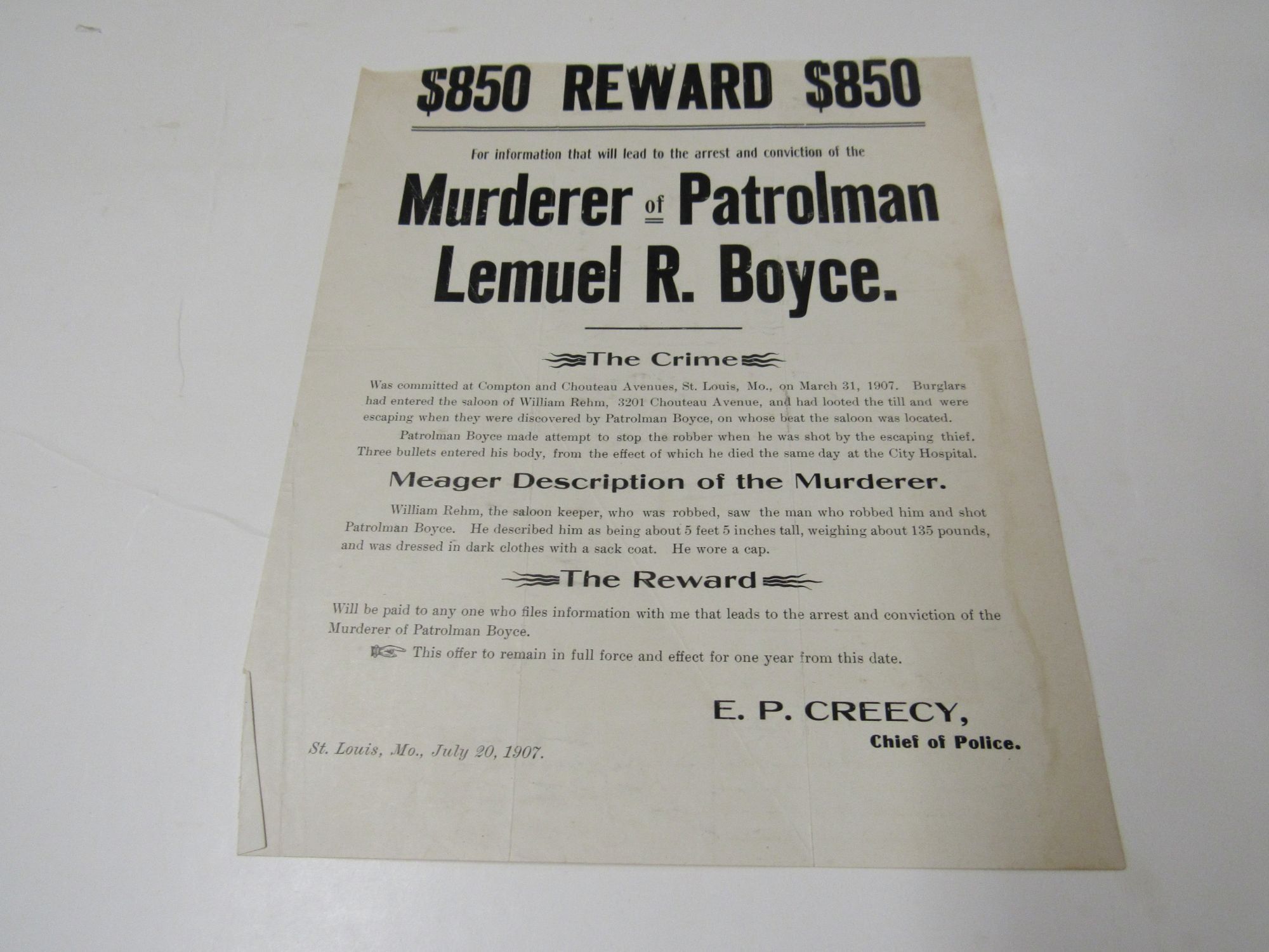 $850.00 Reward $850.00 For Information that will lead to the arrest and conviction of the Murderer of Patrolman Lemuel R. Boyce dated July 20, 1907, and signed in type by E.P. Creecy Chief of Police St. Louis, MO