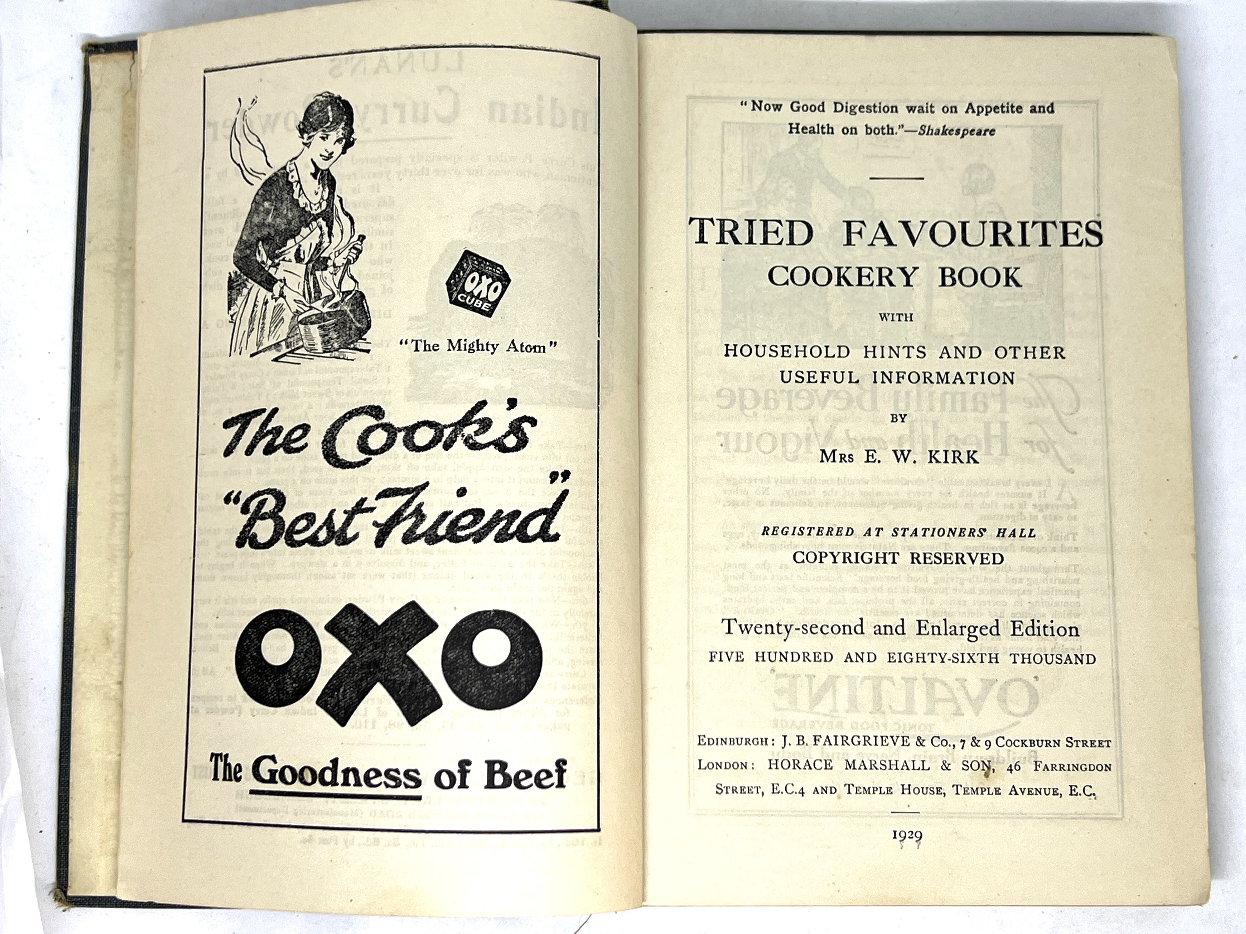 Edinburgh: J. B. Fairgrieve & Co., 1929. Twenty Second and Enlarged Edition. Hardcover. Blue cloth covered boards. Good. 314 pages. 21.5 x 15 cm. A classic cookery book from Mrs E.W. Kirk full of recipes for many different meals and ailments. Milk soup, mock turtle soup, jellied tongue, gateau of meat, hashed venison, marshmallows, and many more recipes prelude a large collection of household tips about damp beds, fur cleaning, curing sheepskin, and washing all different sorts of materials. This edition is also dotted with advertisements from the time. Ovaltine Tonic Food Beverage claims to build up the brain, nerve and body while Coults Hair Tonic claims a delightfully fresh and fragrant preparation; very pleasant to use, and invaluable for removing dandruff and promoting growth of hair. Binding is loose, minor foxing.