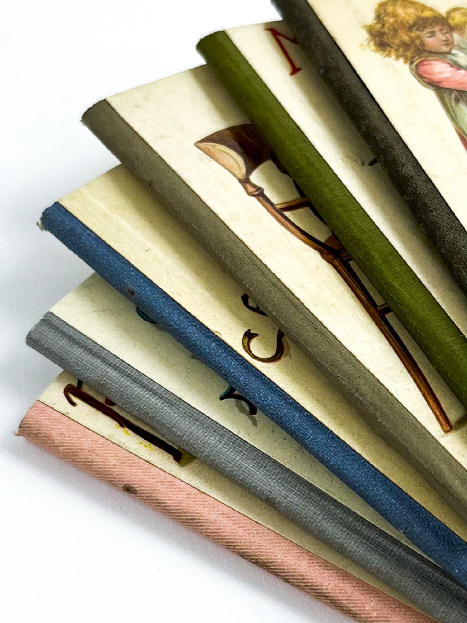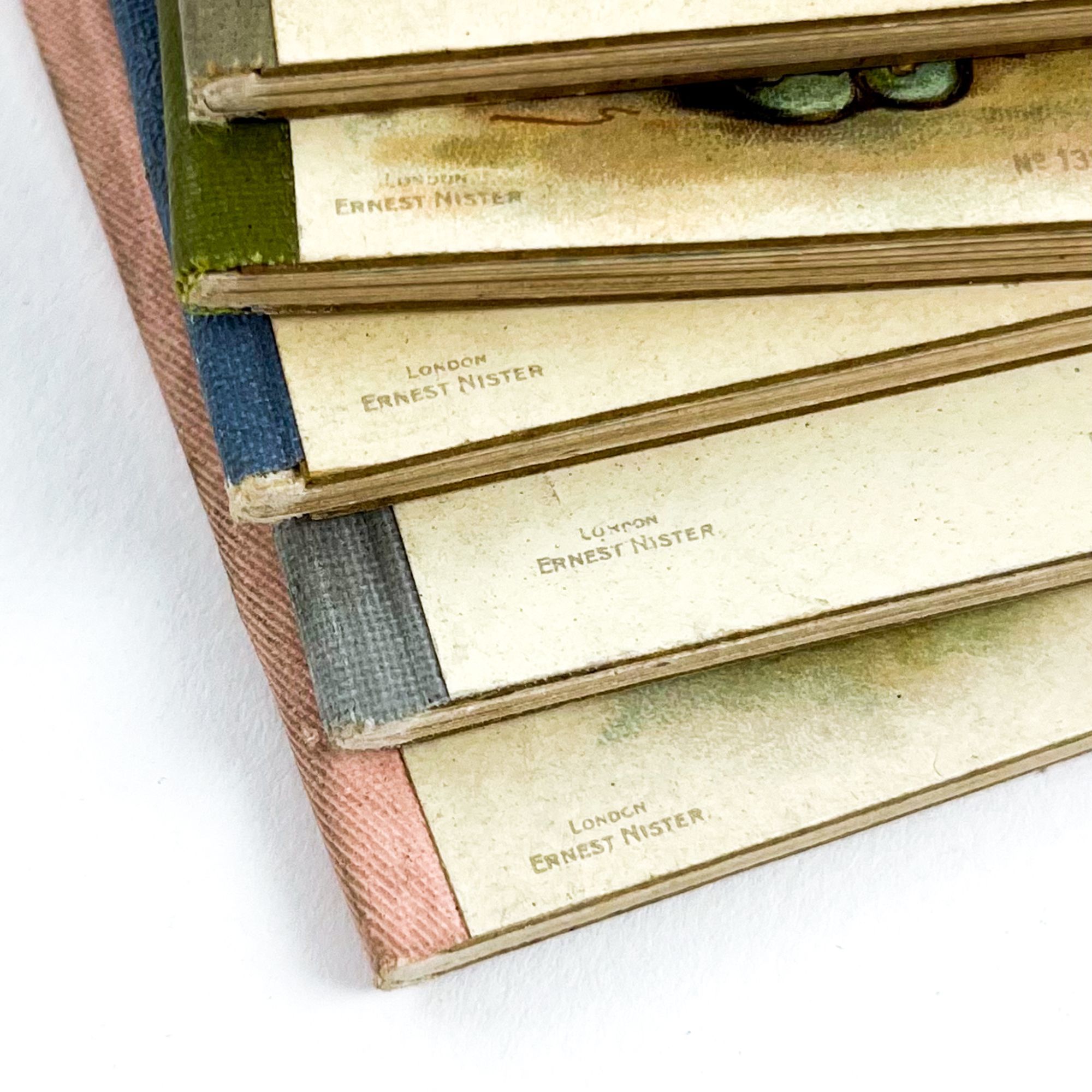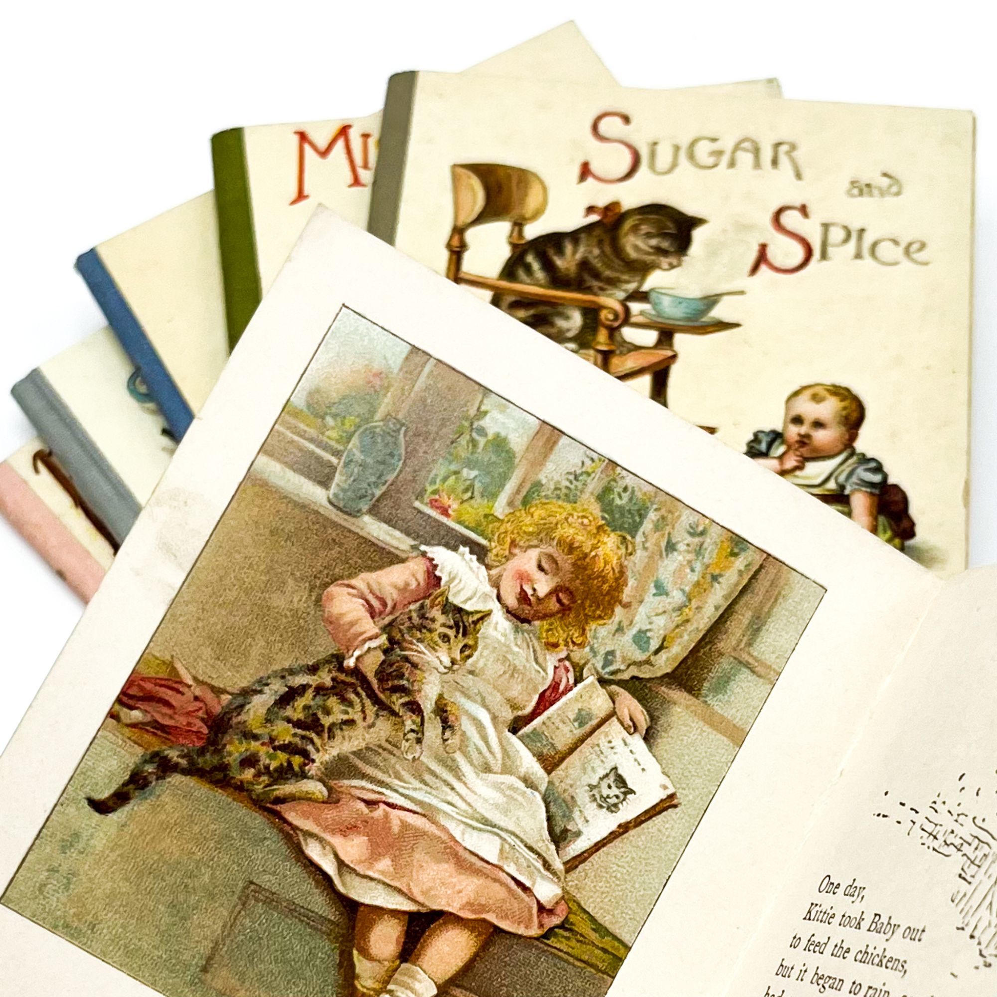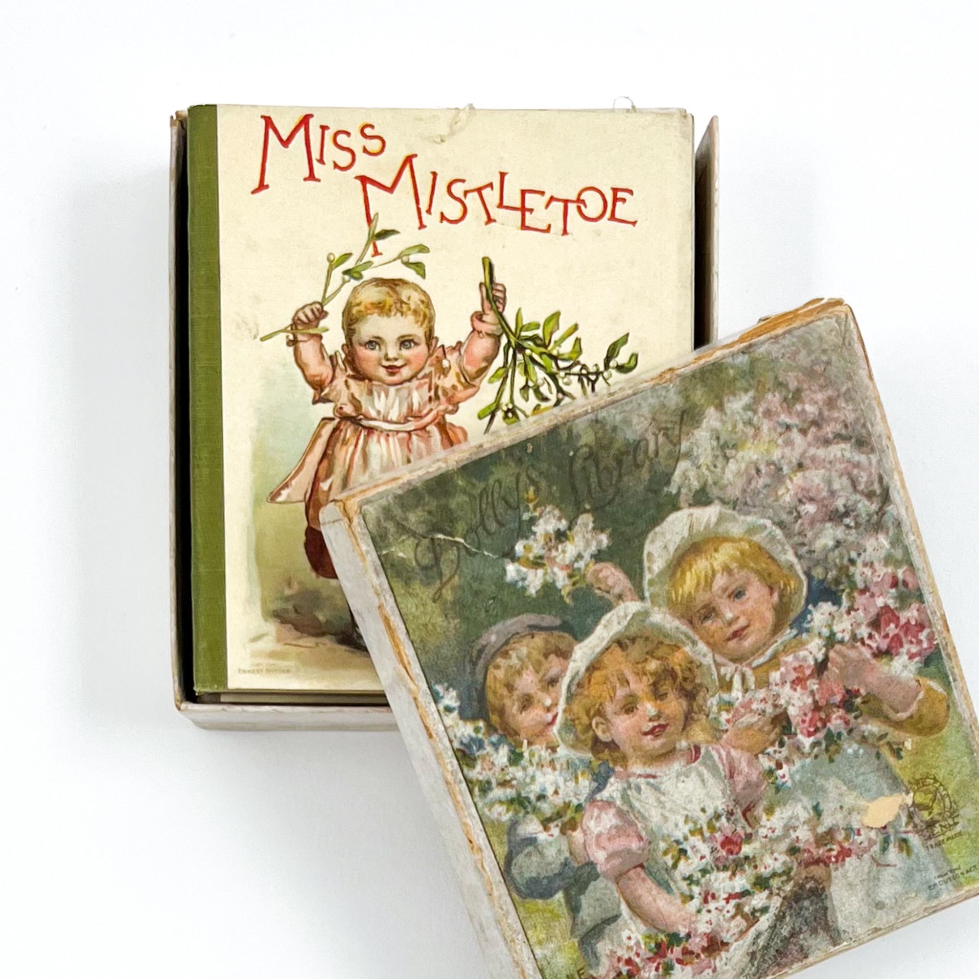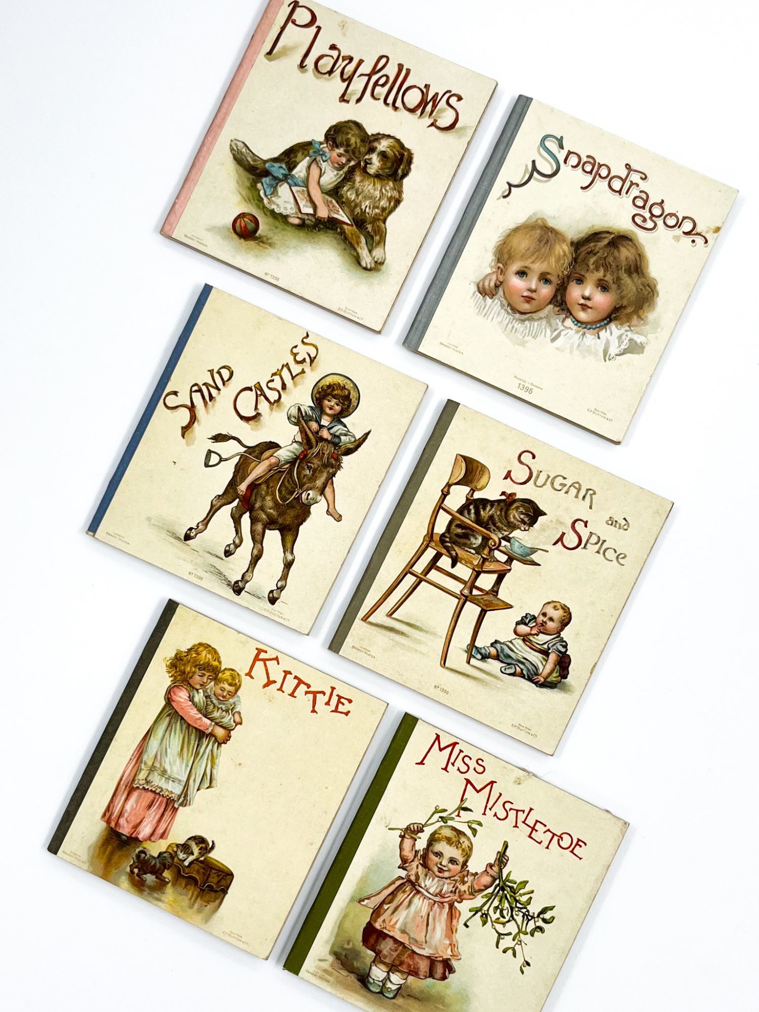 (Nuremberg / London): (E. Nister), 1895. First edition. Near fine in very good box.. Delightful late Victorian collection of six mini books for little readers, in the original publisher's box, each illustrated with four full-page chromolithographs. Individual titles include Miss Mistletoe, Kittie, Sugar and Spice, Playfellows, Sandcastles, and Snapdragon. Printed in Bavaria by publisher Ernest Nister, with no author or artist credited. Quite difficult to find with all titles in the original box. 3.5'' x 3''. Six volumes in publisher's box. Original pictorial boards with cloth spines. Each volume illustrated with four color plates and additional line drawings. Scuffing and light soil to box, with pen inscription to rear board ("To Vivian from Elizabeth Land"). Minor soil and wear to boards.