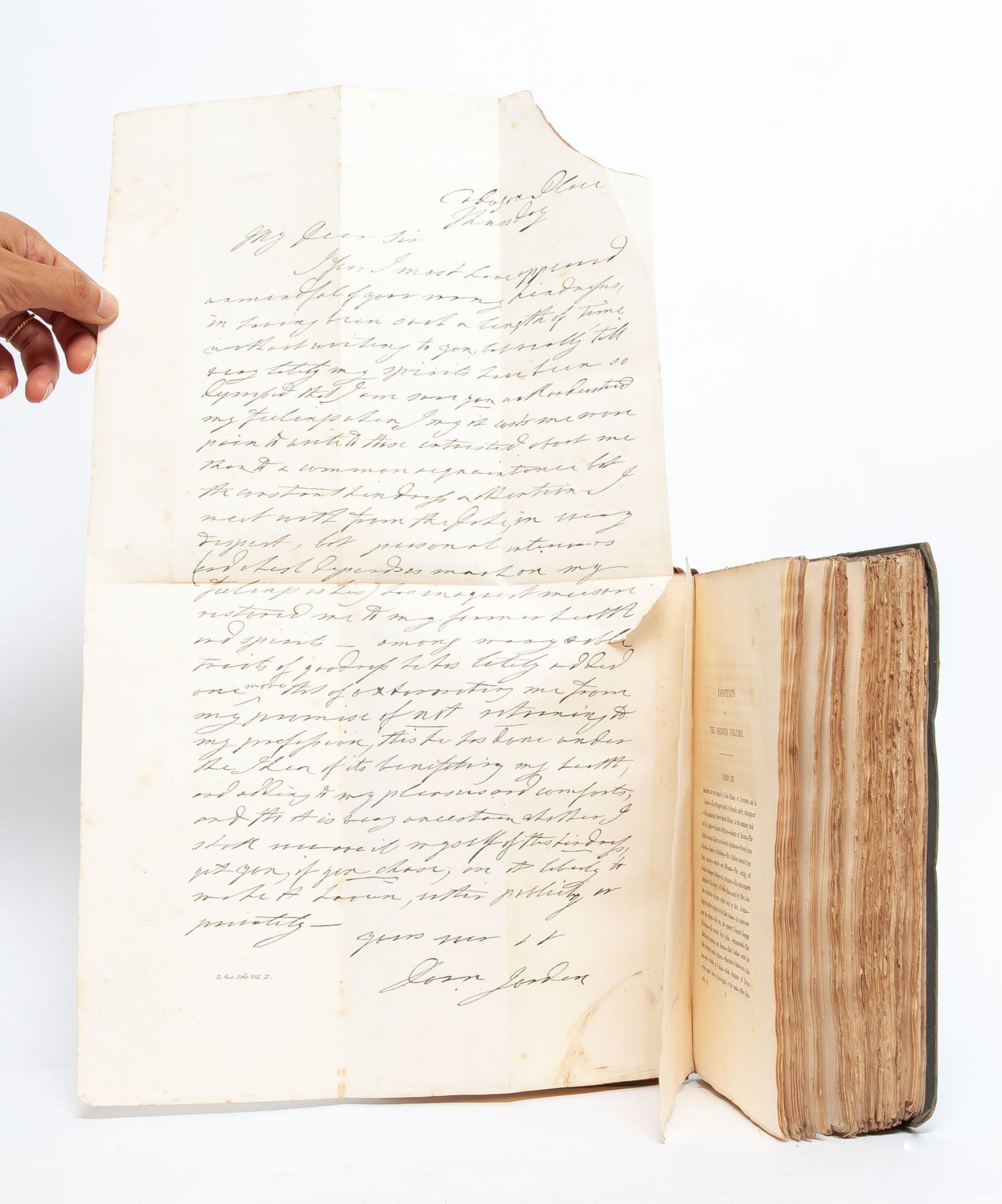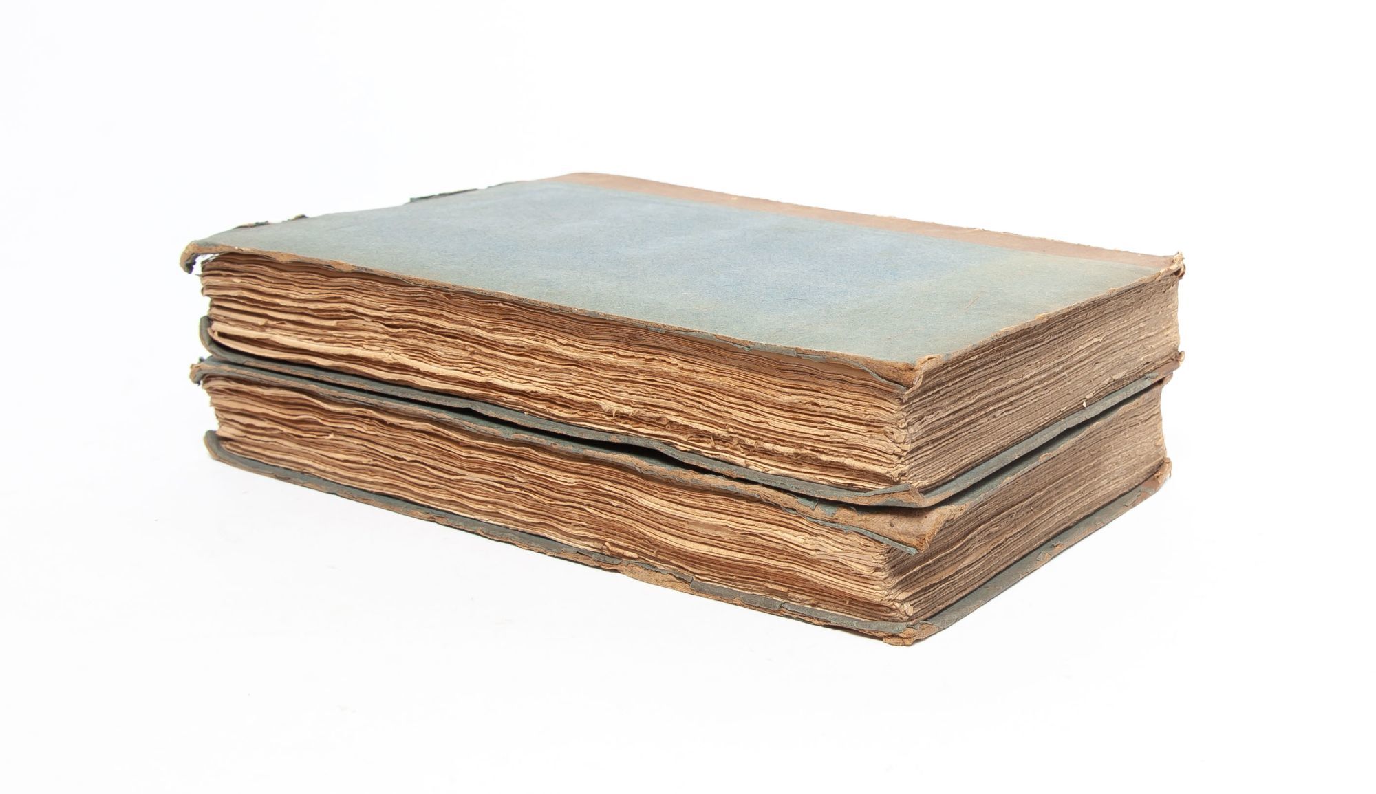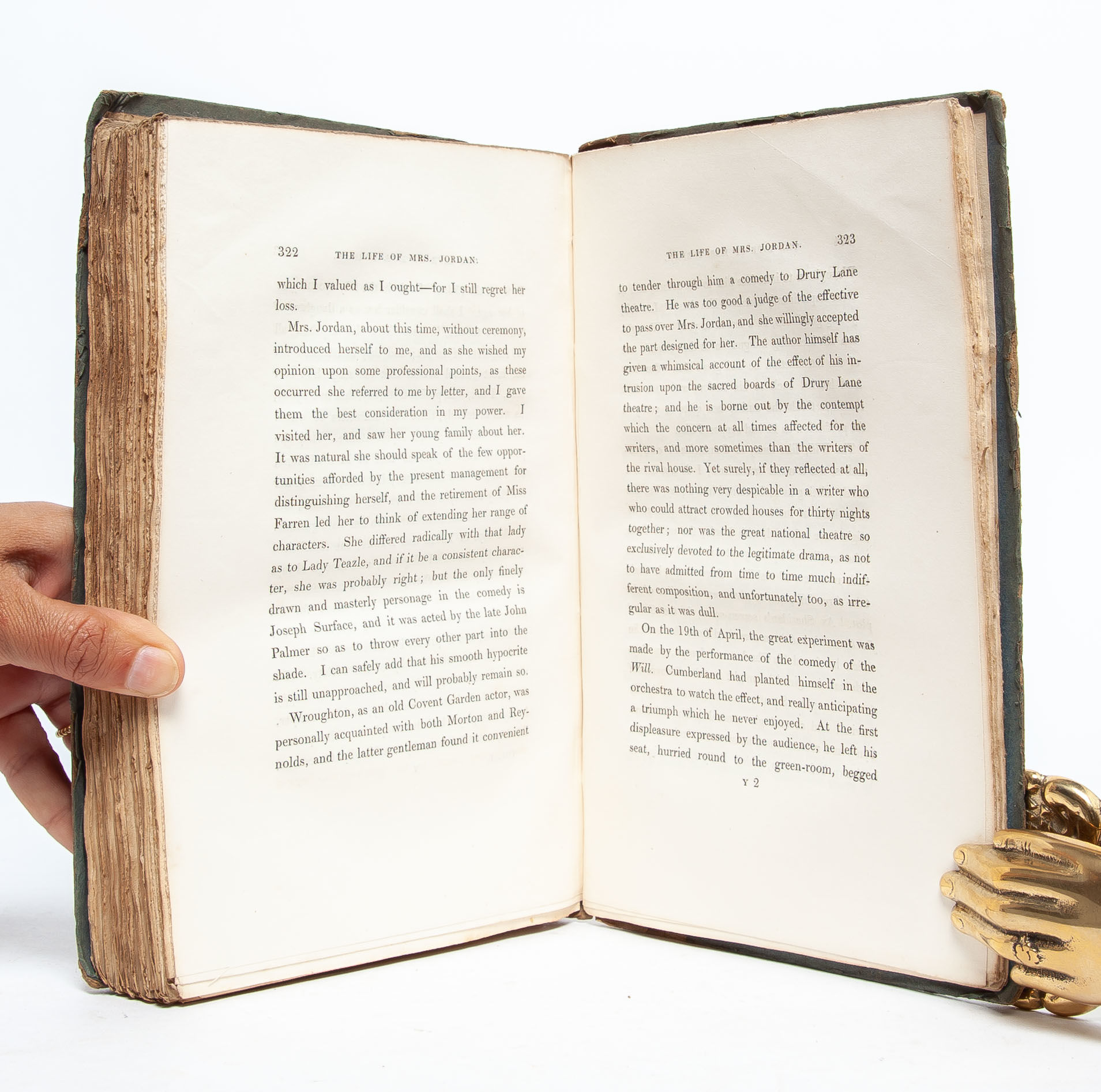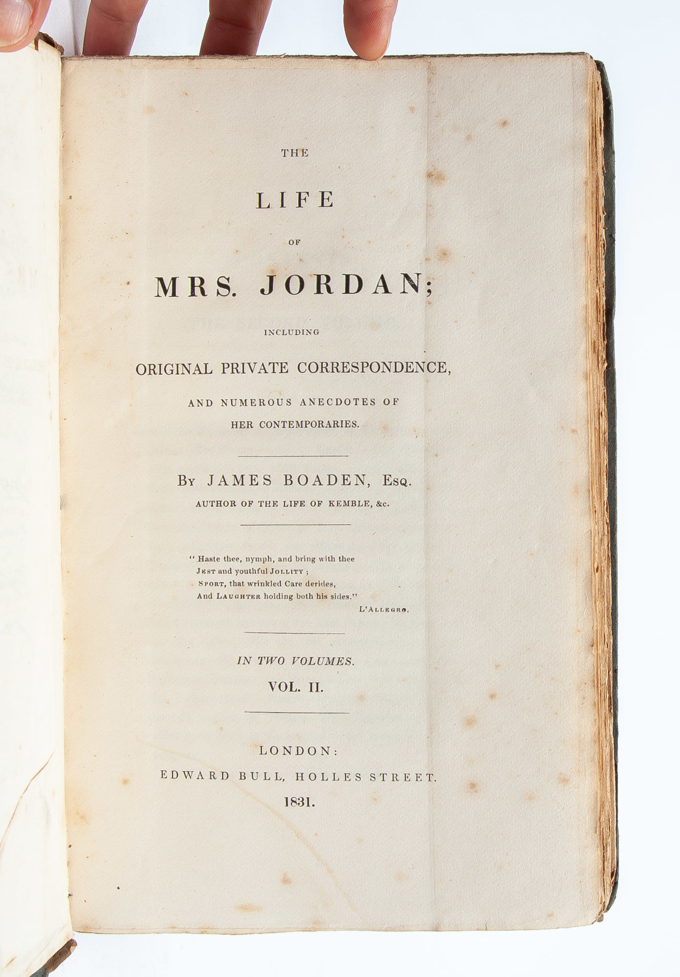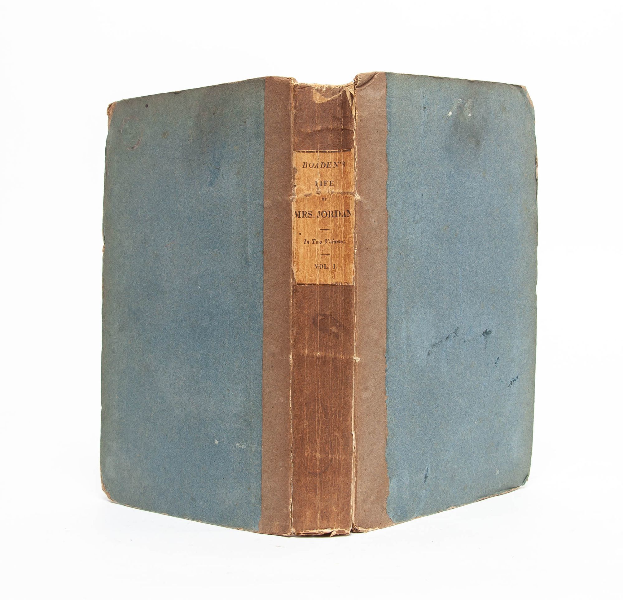 London: Edward Bull, 1831. First edition. Unsophisticated and bound in original publisher's quarter brown paper over drab boards with paper labels to spines. Measuring 220 x 140mm and collating complete including half titles to both, frontis to volume I, folding frontis to volume II, and adverts to rear of volume II: [6], xv, [1, blank], 368; [6], xiv, 364, [4, adverts]. Spines rubbed with chipping to paper labels and loss to extremities; outer joints cracked but holding well. Boards somewhat rubbed to volume I with some sunning to front board of volume II. Internally pleasing with volume I surprisingly fresh and unmarked; occasional scattered foxing to volume II. 1" closed tear and small paper loss to upper corner of folding frontis in volume II with no text loss. The only copy on the market in original boards of this stunning memoir of the life of courtesan and theatrical "comic muse" Dorothea "Dora" Jordan.
