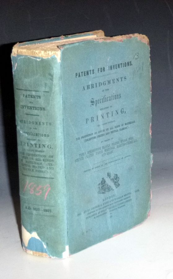 London: The Great Seal Patent office/Georger E. Eyre and William Spottiswoode, 1859.  Thick Octavo. 631pp., (8) pp. advertisements with a tipped in notice before title page referring to pages 611* and 612*. These pages are abridged meaning they do not give examples of the patents but a reference to them. Samuel Pope discusses marbling paper, for bank notes, cheques, etc. "That the practice of counterfeiting of bank and other notes, etc. at this time appears very notorious, to the great detriment of the trade and commerce of this kingdom and that the making use of paper marbled with a margent for merchant notes.... preventing of counterfeiting.....William Roberts...A method of cutting and preparing prints or moulds....and several other new inventions in printing. Bound in blue paper covered boards printed in black, joints or hinges cracked but not broken through, some loss of paper to head and foot of spine, paper loss to edges with wear to corners. A rough binding but holding quite well. A good copy.