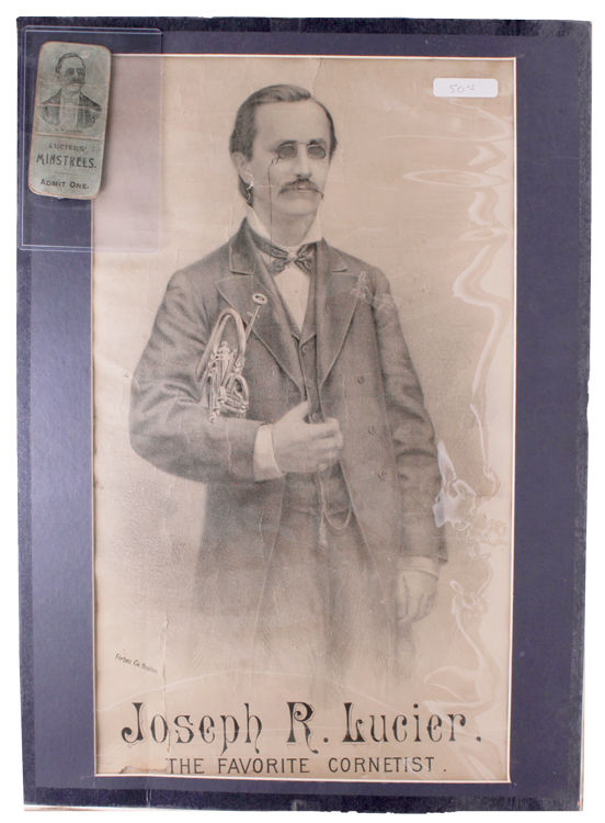 Boiston: Forbes Co. three quarters lithogrpohic portrait with cornet under his arm. With rips and tears to image. Good copy. three quarters lithogrpohic portrait with cornet under his arm. Lucier was a blind cornetist