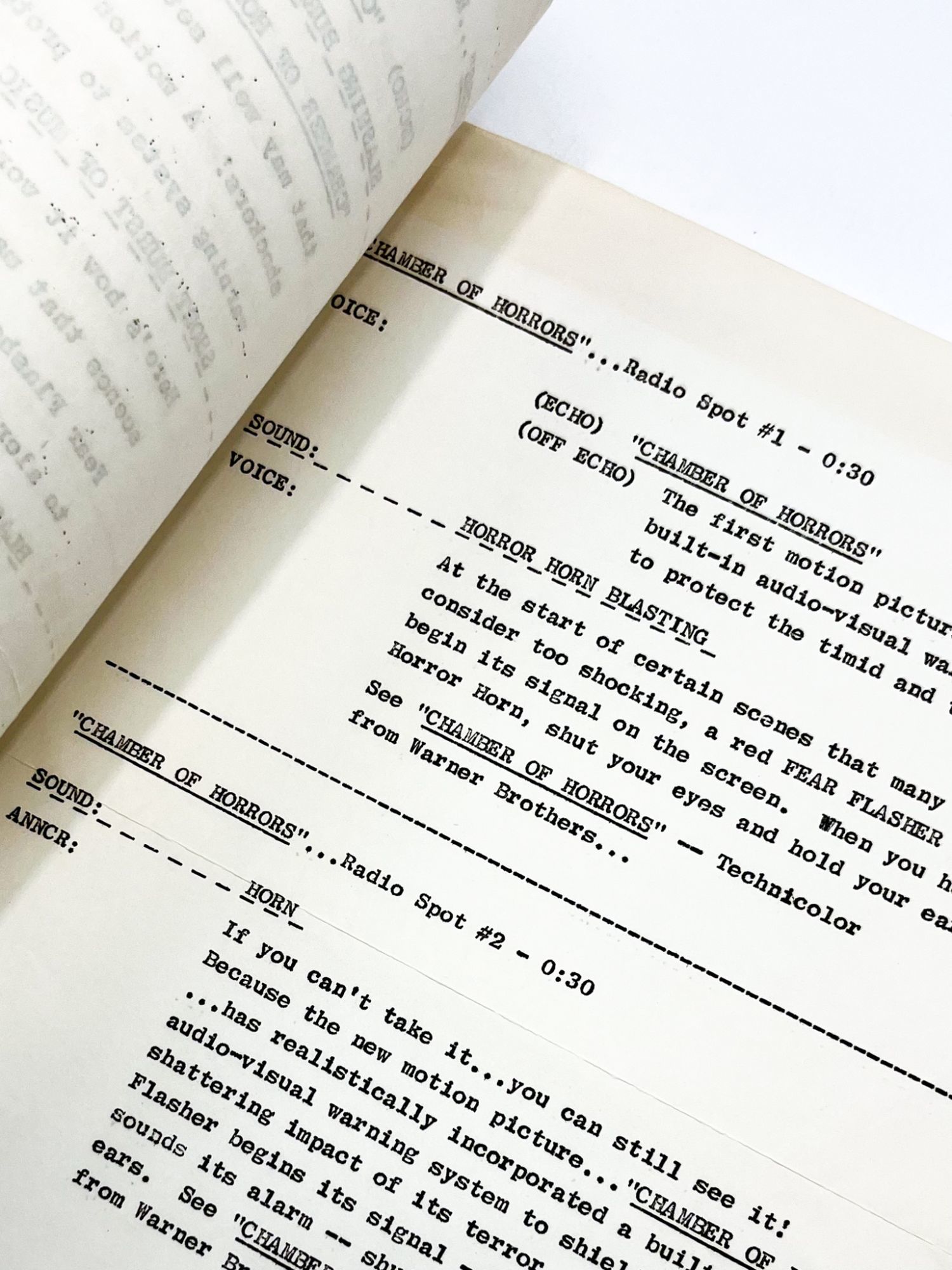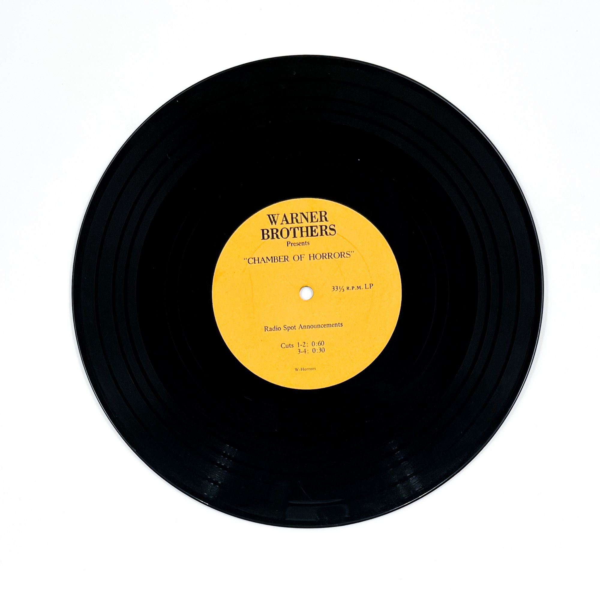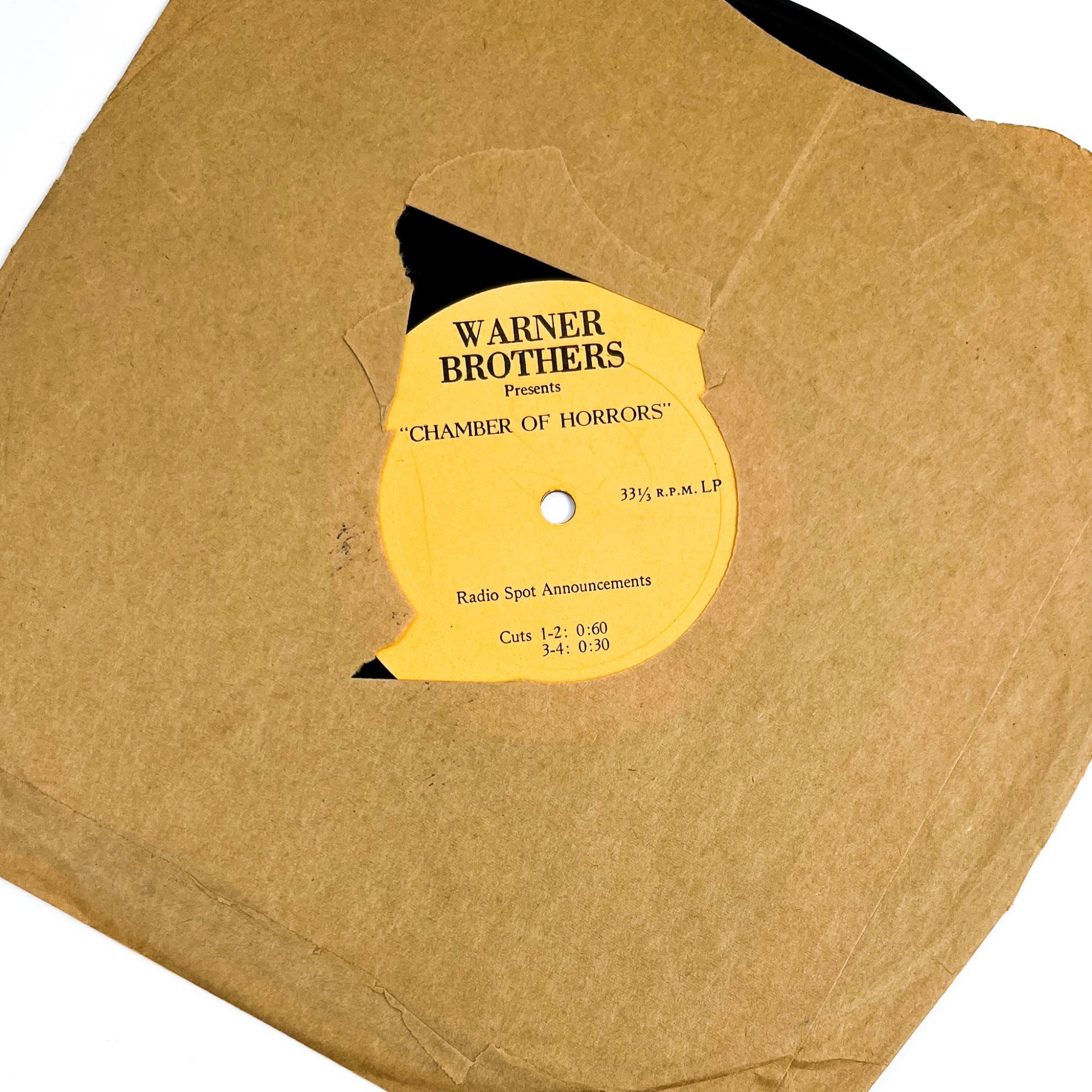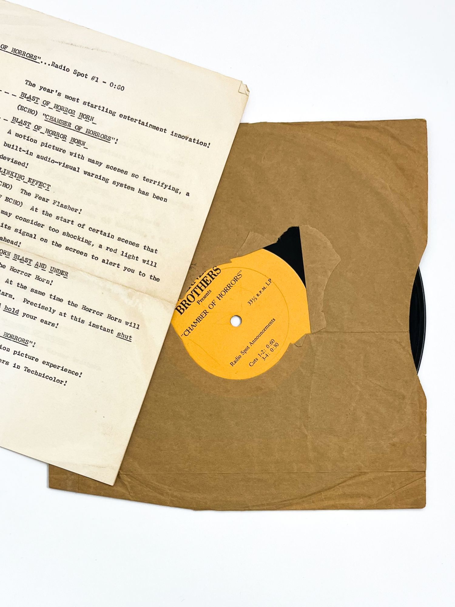 [Hollywood]: Warner Brothers, 1966. Very good.. Original vinyl record of radio spot advertisements for CHAMBER OF HORRORS, a TV movie that was spiced up for the big screen with additional gore and violence and a marketing campaign focusing on two technical "innovations" — the "Fear Flasher" and the "Horror Horn," both designed to warn the audience of impending violence. Billed as "The year's most startling entertainment innovation!", it nevertheless appears this gimmick never enjoyed widespread (or even another) use, but is an interesting example of the methods studios used to promote their films, particularly "B" movies, in the post-studio era. The LP includes four versions of the film's radio spots, all melodramatically touting the movie's supposed innovations. Unusual and ephemeral. 10'' x 10'' (sleeve). Single-side 10" 33-RPM vinyl LP record with orange label in (original?) brown paper sleeve. Sleeve edge-worn with old price penned to one side. Plays cleanly. Also includes 4 pages of mechanically reproduced script, 8.5" x 11" approx. printed recto only stapled at top left corner. Folded through center, with some light edge-wear and creasing.