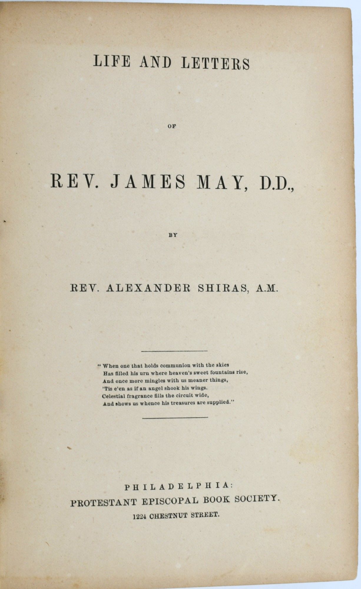Philadelphia: Protestant Episcopal Book Society, 1865. First Edition. Hard Cover. near Very Good binding. 8vo.; in the publisher's green embossed cloth; [7], 8-185 pages; with no ownership marks of any kind.~~A native of Pennsylvania, James May received a doctorate of divinity at the Virginia Theological Seminary in Alexandria, and later became a professor there.~~A pleasing and attractive copy. near Very Good binding.