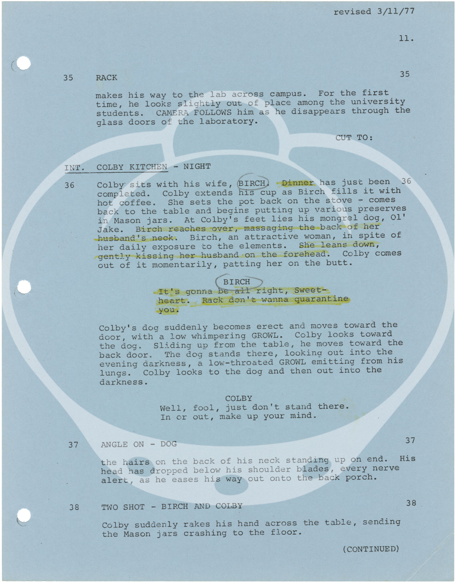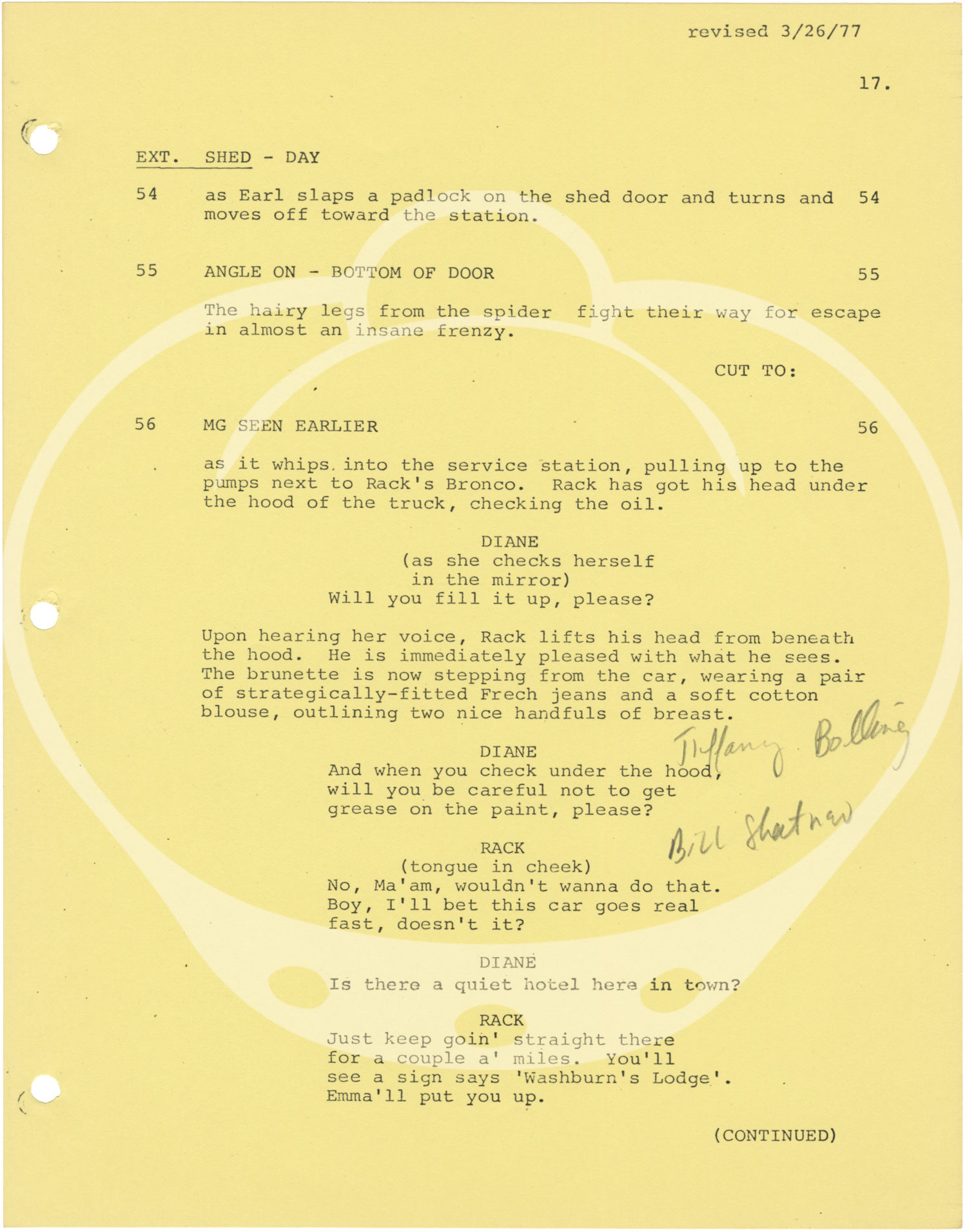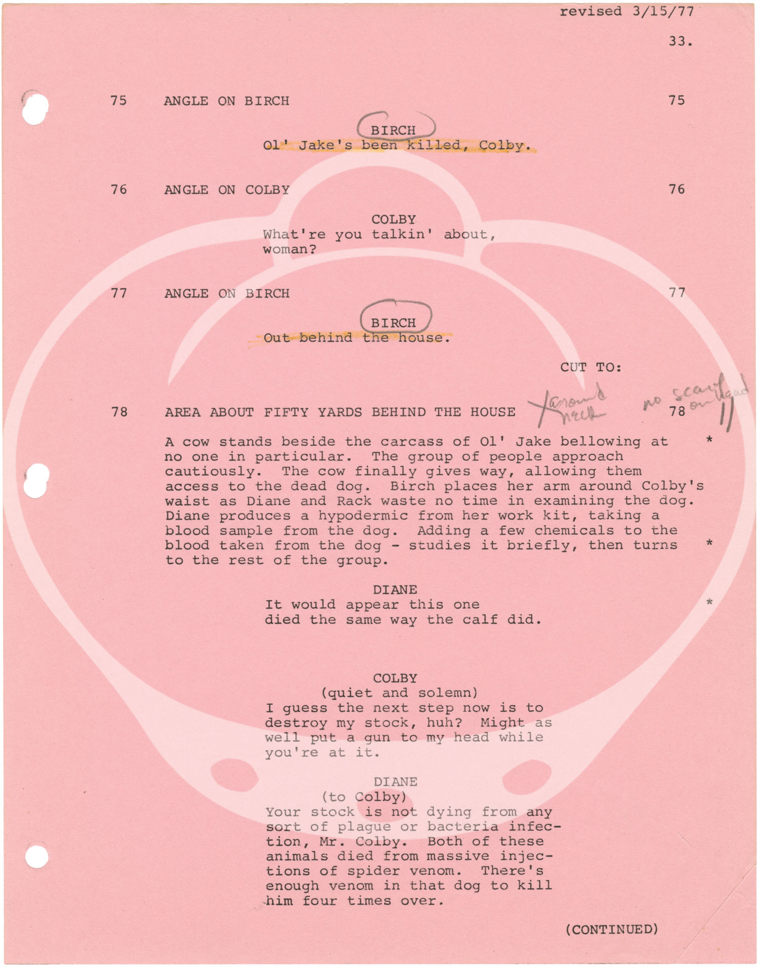 Orange titled wrappers. Title page present, with credits for screenwriters Jeffrey M. Sneller, Stephen Lodge, and Alan Caillou. 123 leaves, with last page of text numbered 108. Mimeograph duplication, rectos only, with blue, pink, and yellow revision pages throughout, dated variously between 3/11/77 and 3/26/77. Pages Near Fine, wrapper Very Good plus, bound internally with three gold brads.