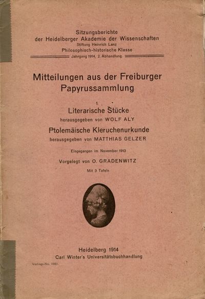 Mitteilungen aus der Freiburger Papyrussammlung. Literarische stücke herausgegeben von Wolf Aly. Ptolemäische Kleruchenurkunde herausgegeben von Matthias Gelzer ... vorgelegt von O. Gradenwitz