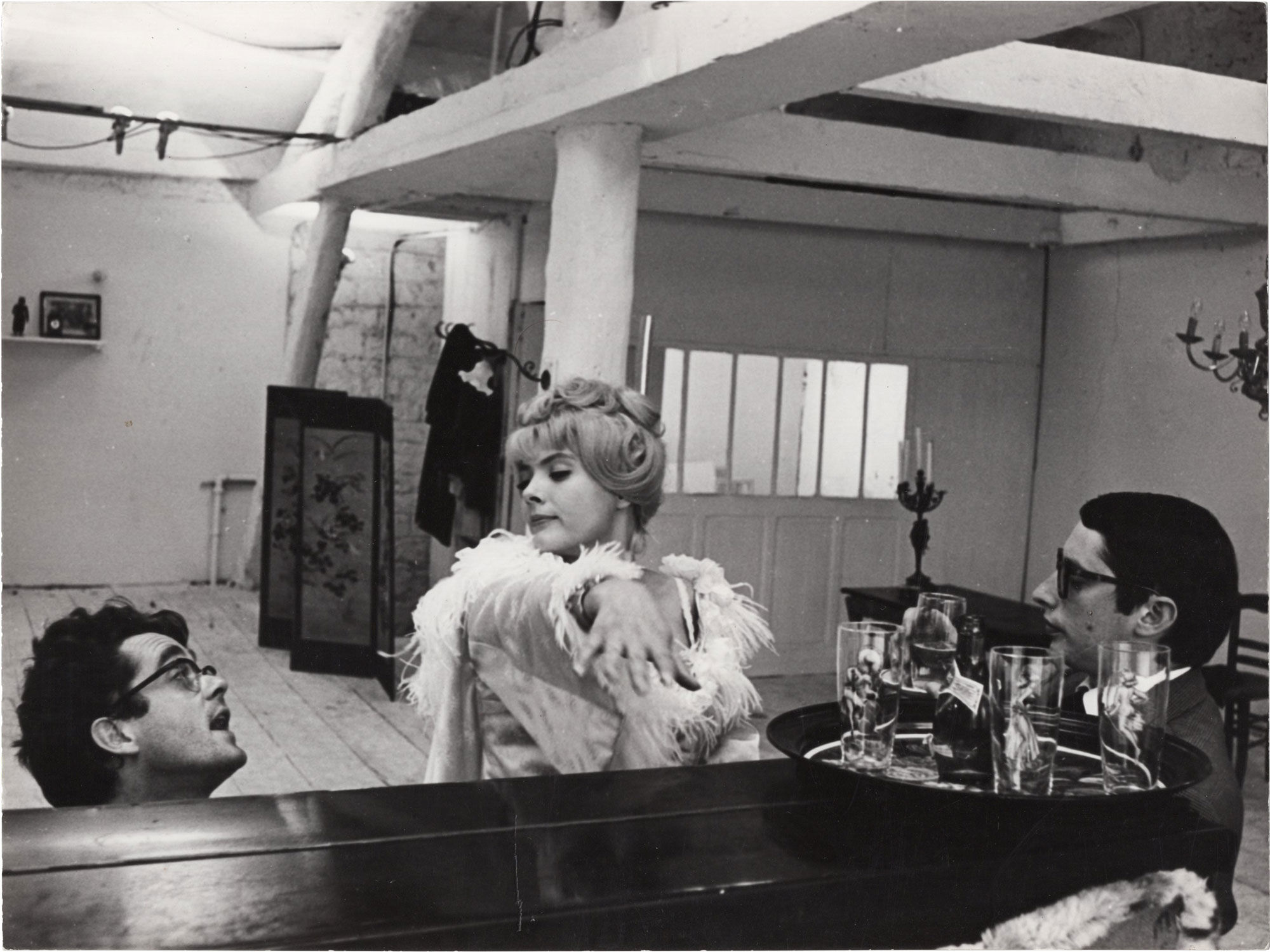 N.p.: N.p., 1962. Vintage borderless reference photograph from the 1962 French film, showing actors Michel Legrand, Corinne Marchand, and Jean-Pierre Taste—from the memorable early sequence in the film where Legrand and Taste drop in to Marchand's flat. With manuscript pencil and ink annotations on the verso.