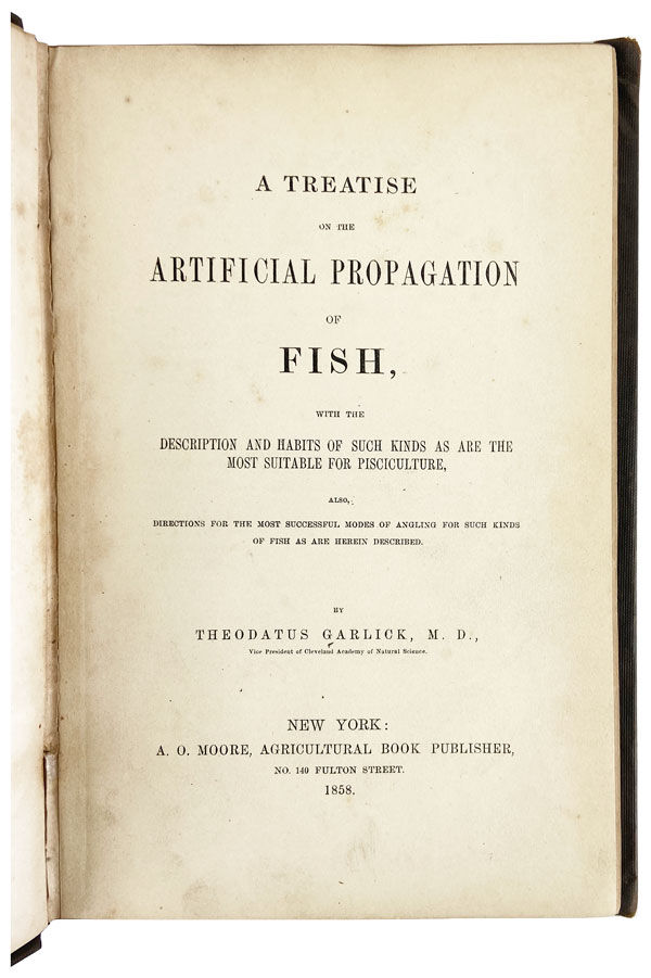 Early printing of arguably the first work on the subject. The author, Theodatus Garlick (1805-1884), was a man of many diverse interests, practicing and pioneering plastic surgery throughout his storied career; producing wax medallions of such renowned subjects as President Andrew Jackson and Chief Justice John Marshall; and creating the first daguerreotype in the city of Cleveland. The present work fully displays the author's passion for fish: the speckled trout is "charming," the black bass "noble," while the white perch is "beautiful" and "abundant." For additional information see the DAB Vol. 7, pp. 152-3.