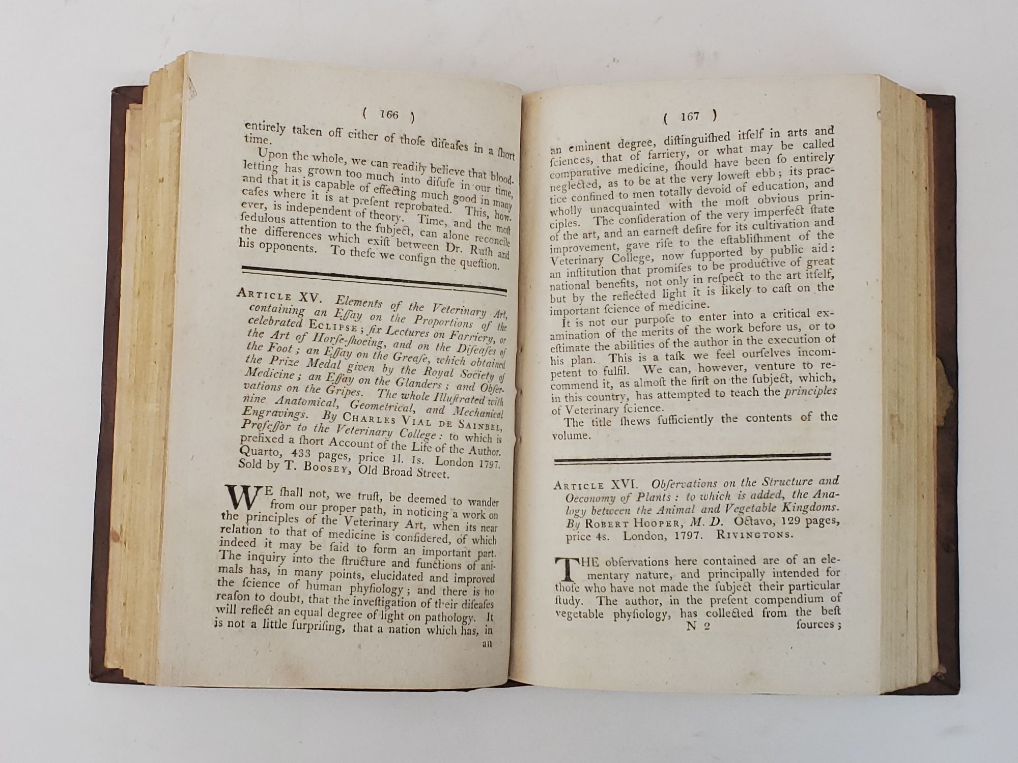 London: [N.p.], 1797. Hardcover. Octavo, 400 pp. Good; bound in contemporary leather with burgundy and gilt tooled spine label with gilt titling, some surface marks and scratches to covers, slight wear to spine edges and corners; binding tight; text block clean; slight foxing and age toning to pages; previous owner bookplates on inside front pastedown and ffep "G. Duvall, M.D.; Sam'l Claggett, M.D.;" MF consignment. 1359752. Special Collections.