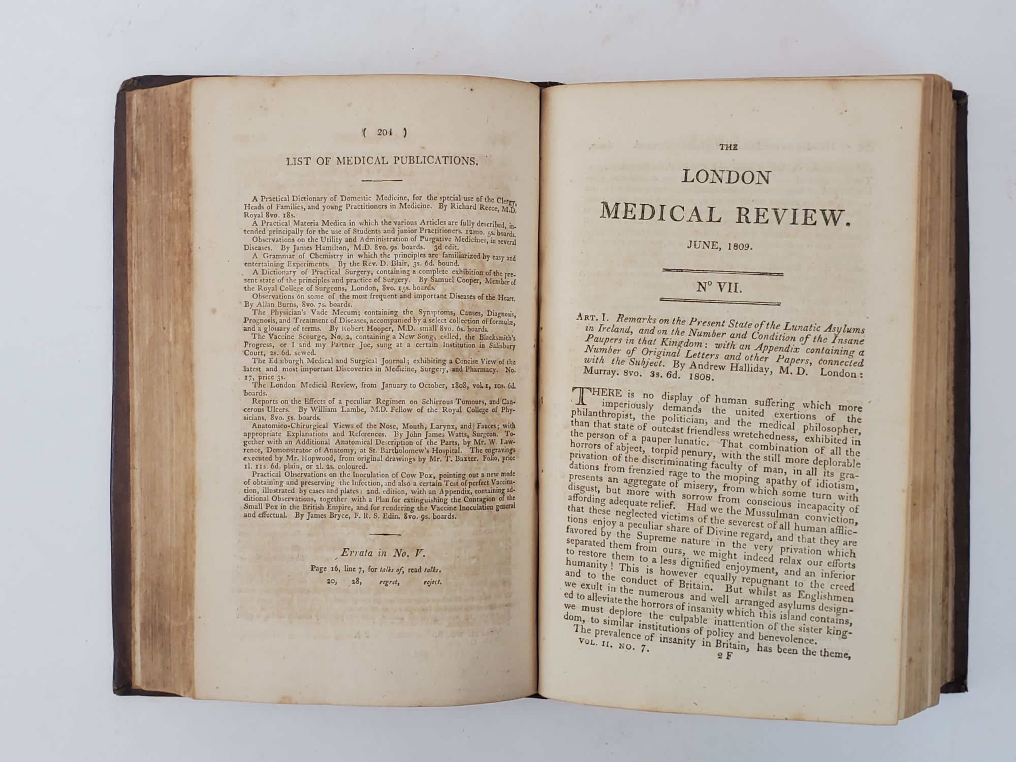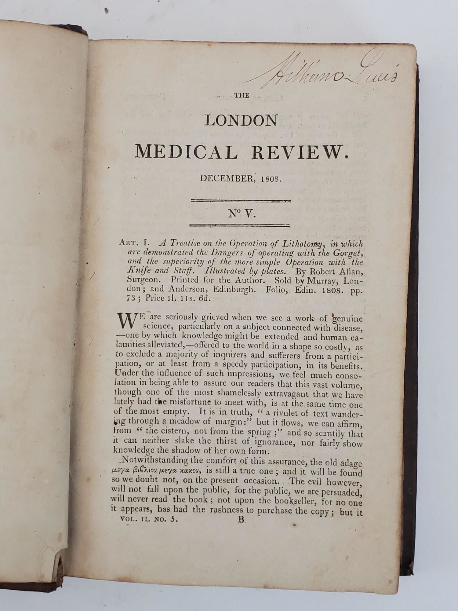 London: [N.p.], 1808. Hardcover. Octavo, 261 pp. VG; bound in contemporary leather with some slight scratches to covers and very minor wear to spine edges and corners; binding tight; text block age toned and discolored; age toning to pages throughout; previous owner bookplate on inside front pastedown "Library of Ward Lewis, M.D.;" MF consignment. Dec. 1808 No. V [with] April 1809 No. VI [with] June 1809 No. VII [with] April 1810 No. X [with] July 1810 No. XI. 1359753. Special Collections.