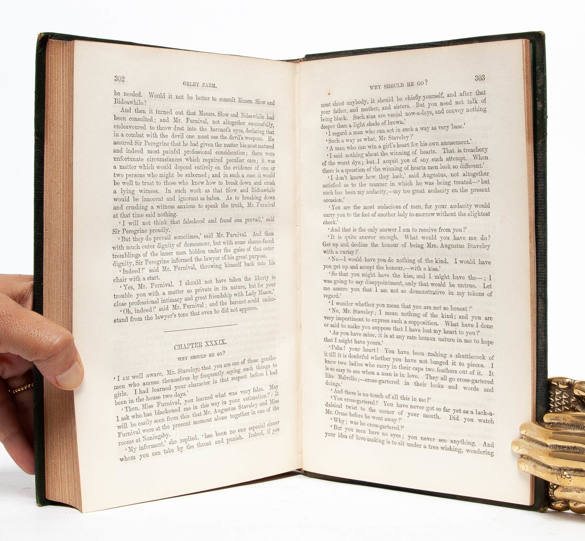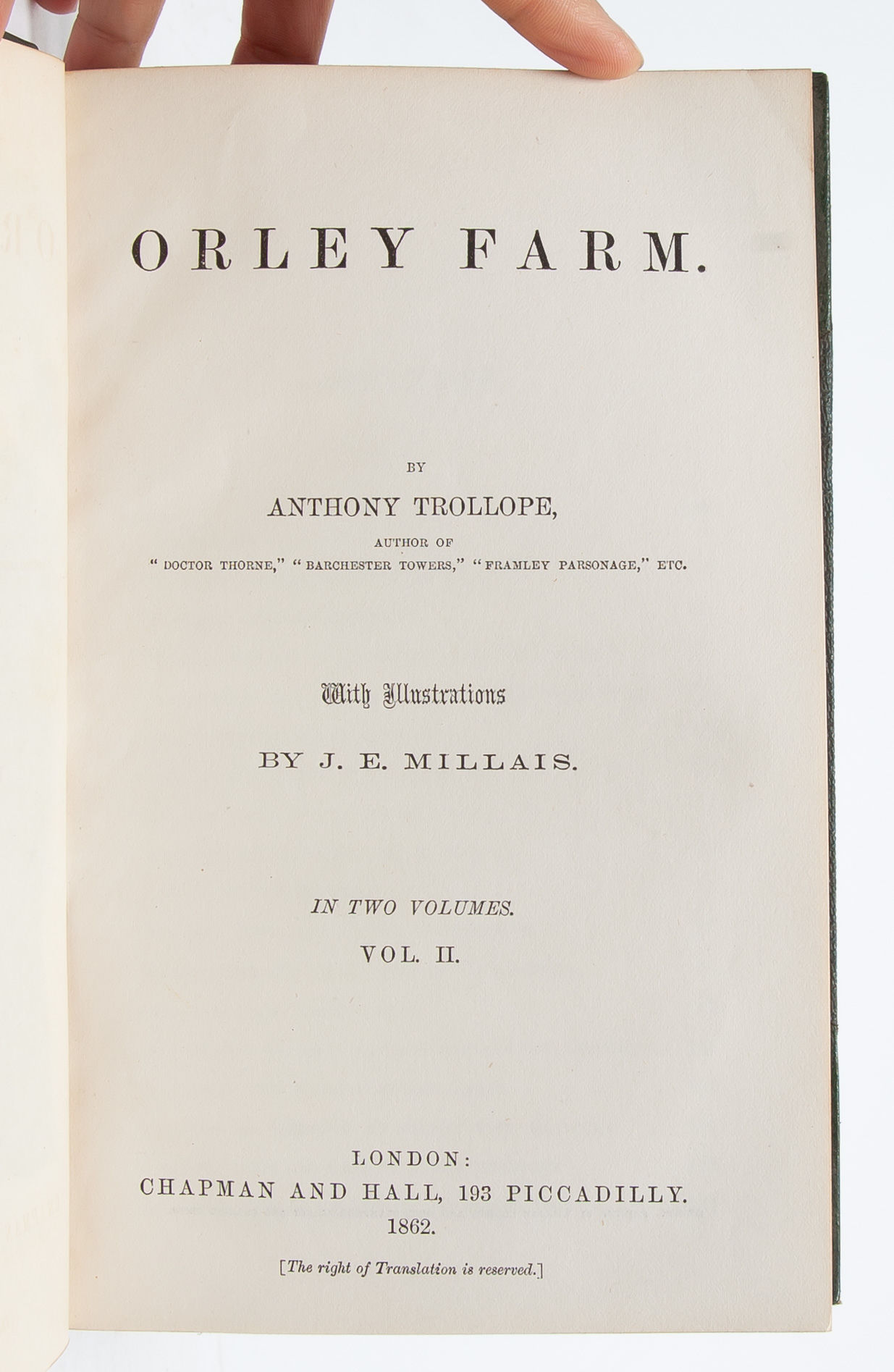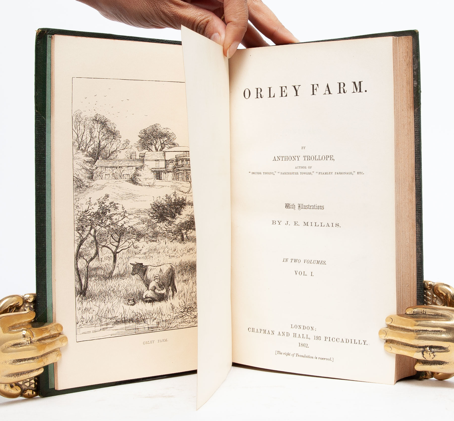 "While it is primarily a tragedy of misdirected maternal love, Orley Farm contains much of the best Trollopian humor and includes the portrait of his finest gentleman, Sir Peregrine Orme" (Trollope Society). Noted for its complex bibliography, resulting in part from the two volumes being printed and released ten months apart, the novel also presents a complex legal plot in which Sir Joseph Mason attempts to bequeath Orley Farm to his second son Lucius. In addition to the legal implications of overstepping an eldest son, Sir Mason's estate is further embroiled in conflict as Lucius takes over management and begins to cancel and break leases, raising the ire of neighbors. This anger leads to accusations that Sir Mason's will was forged, that Lucius is not the true heir, and that Lady Mason is the culprit. Near Fine.