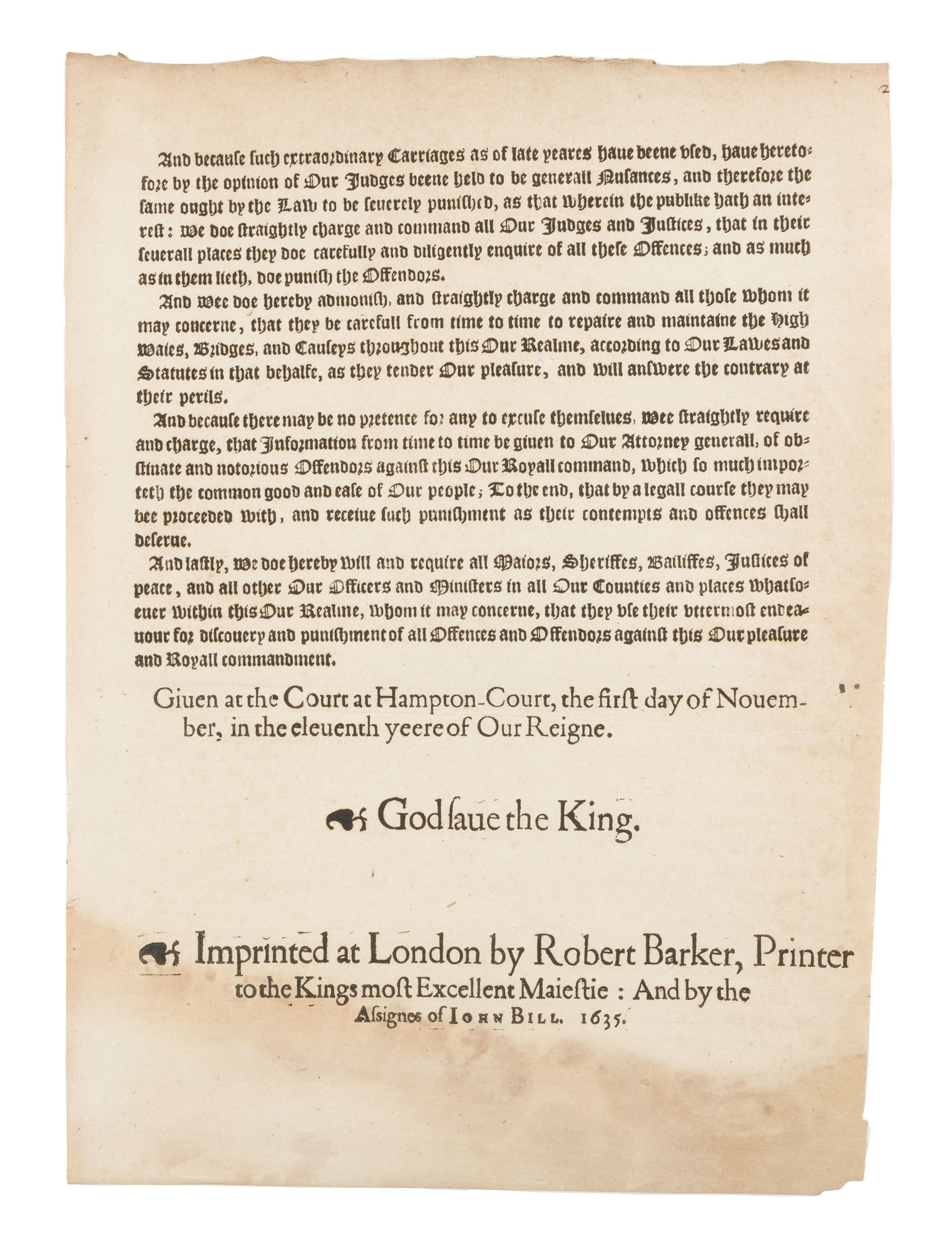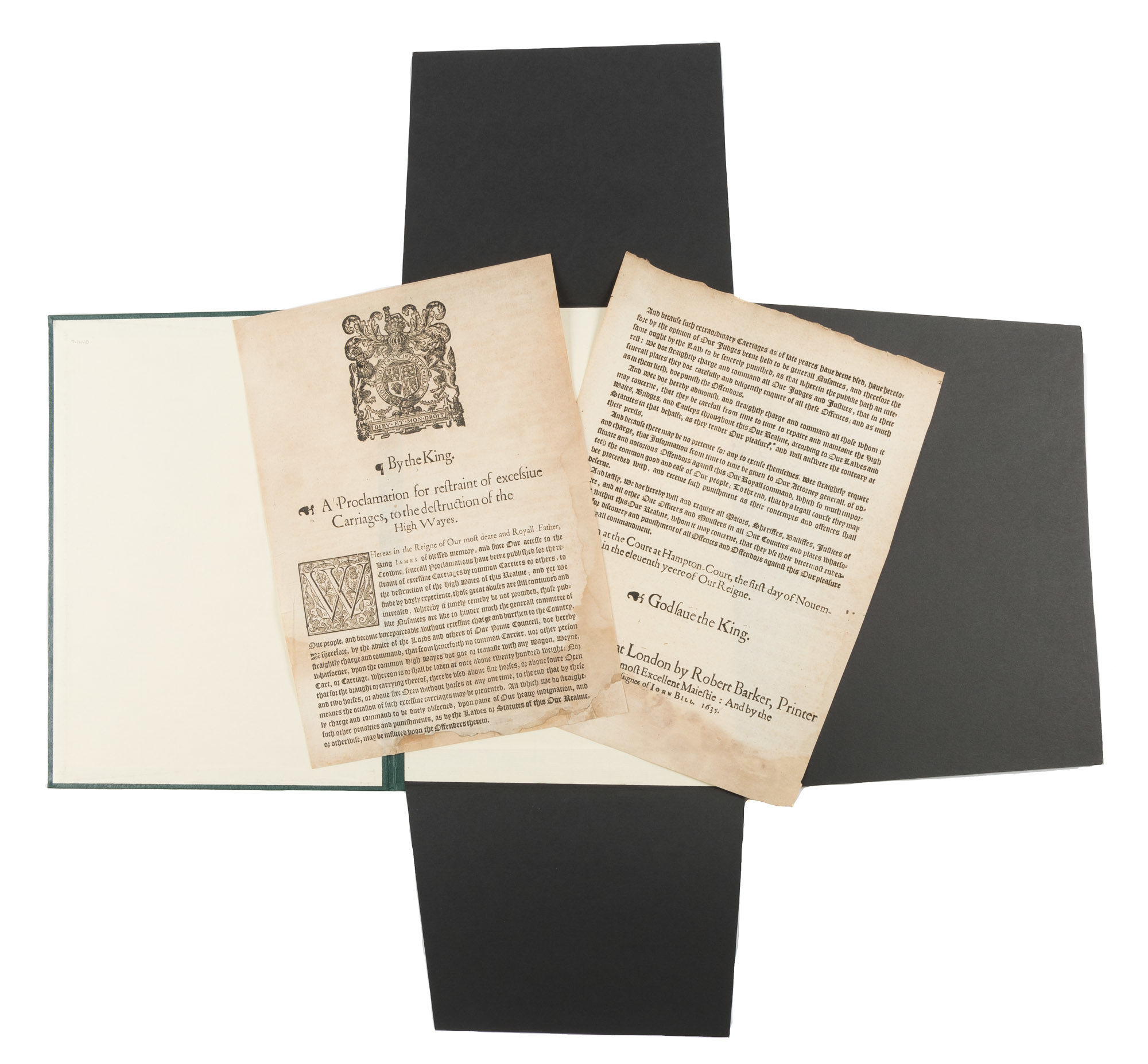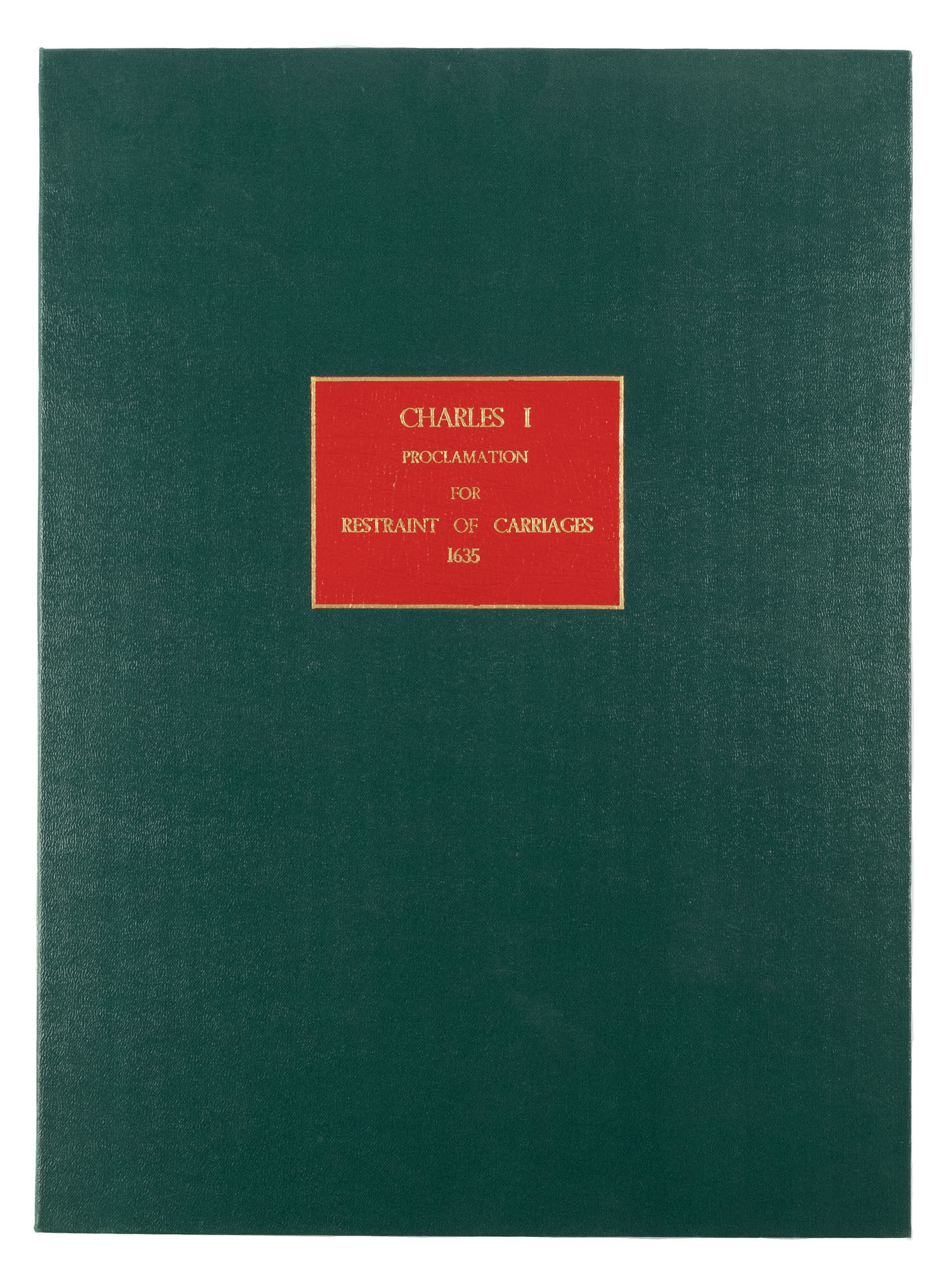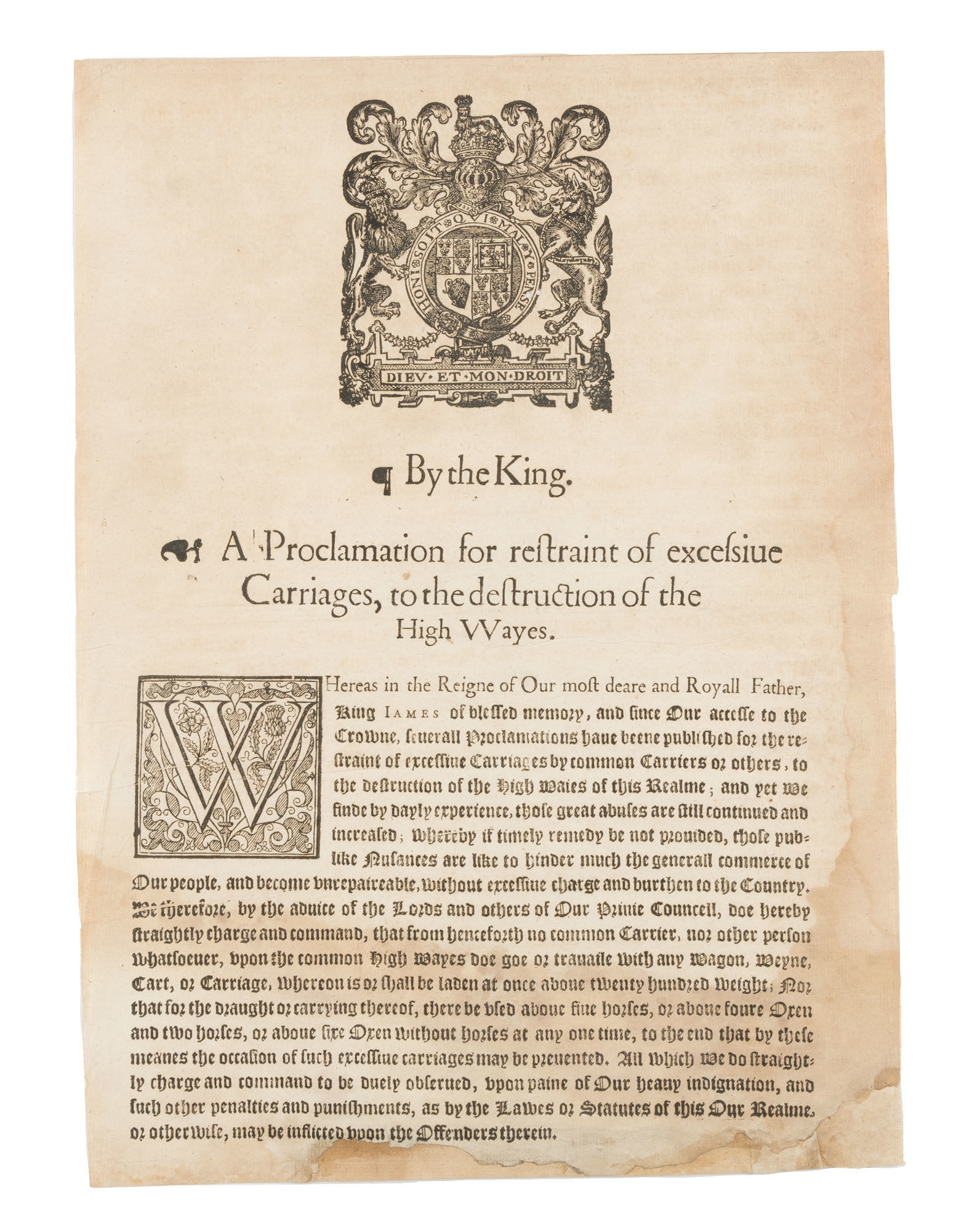 1635. Carriages Over One Ton Banned "Upon Pain of Our Heavy Indignation" [Broadside]. [Highways]. Charles I [1600-1649], King of England. By the King. A Proclamation for Restraint of Excessive Carriages, To the Destruction of the High Ways. London: Imprinted...by Robert Barker and by the Assignes of Iohn Bill, 1635. 14-1/4" x 10-1/4" 2 ff. broadside, text in single column below headline and large woodcut royal arms, 8-line woodcut initial. Moderate toning, very light foxing and soiling, slight horizontal fold lines, faint dampstain to bottom and two small worm holes near top of both sheets, minor loss to woodcut but no loss to text, crease to left edge of first sheet, which is mended at bottom edge just touching a few letters of text without loss. Housed in attractive 15" x 11" green buckram folder with red morocco lettering piece to front. $2,000. * Despite previous attempts to regulate excessively heavy carriages, the king and his people still found "by dayly experience" that "those great abuses" were "still continued and increased." This two-page proclamation restricts carriages to "twenty hundred weight" (one ton) and imposed limits of either five horses, five oxen or four oxen and two horses. It also encourages local officials to keep up with highway maintenance and "answere the contrary at their perils." Offenders were duly reported to the attorney general as a public nuisance, where they would receive "such punishment as their contempts and offences shall deserve." OCLC and the ESTC locate 1 copy of this scarce broadside in North America (Huntington Library). English Short-Title Catalogue (ESTC) S122973.