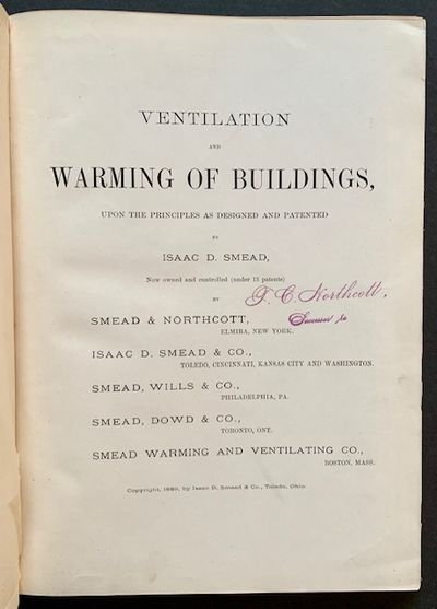 Toldeo, Ohio: Isaac D. Smead & Co, 1889. Cloth. Very Good +. The uncommon 1889 original printing, including a 66 pg. booklet ("A Partial List of Buildings Warmed and Ventilated by the Smead System -- With Some Official Reports from Boards of Education, Committees, Etc."). Solid and VG+ in its dark-green cloth, with just a hint of light soiling to the panels and discreet former owner stamps (one at the title, one at the half-title) and signature (at the front pastedown). 13 lovely chromolithographed plates --in vivid color-- complementing the text as well as a number of striking steel engravings. Quarto, very impressive late 19th century company catalogue and history.