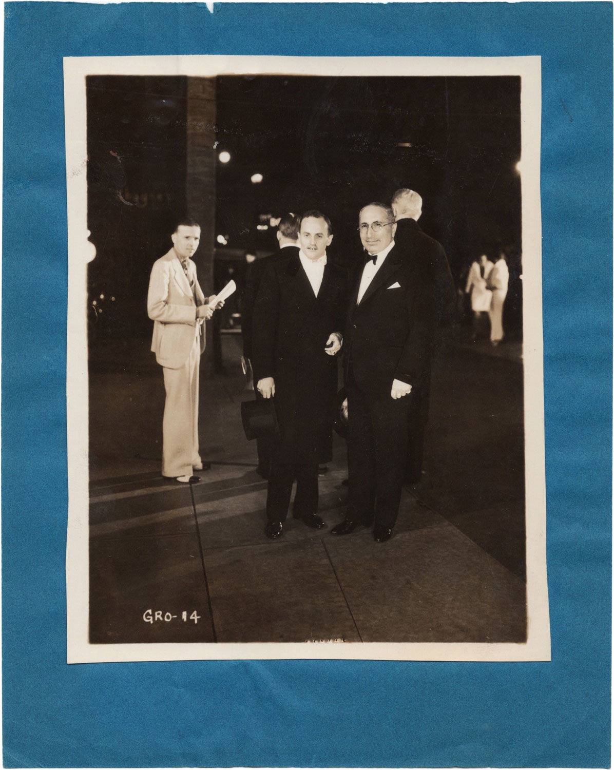N.p.: N.p., 1930. Vintage candid photograph of Hollywood producers Darryl F. Zanuck and Louis B. Mayer attending a formal event, circa 1930s. With a mimeo snipe on the verso, along with the provenance stamp of collector Lester Glassner.
