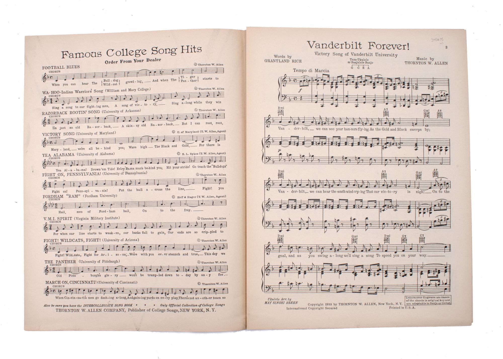 - New York City: Thornton W. Allen Company/ Publisher of College Songs and Song Books, 1933