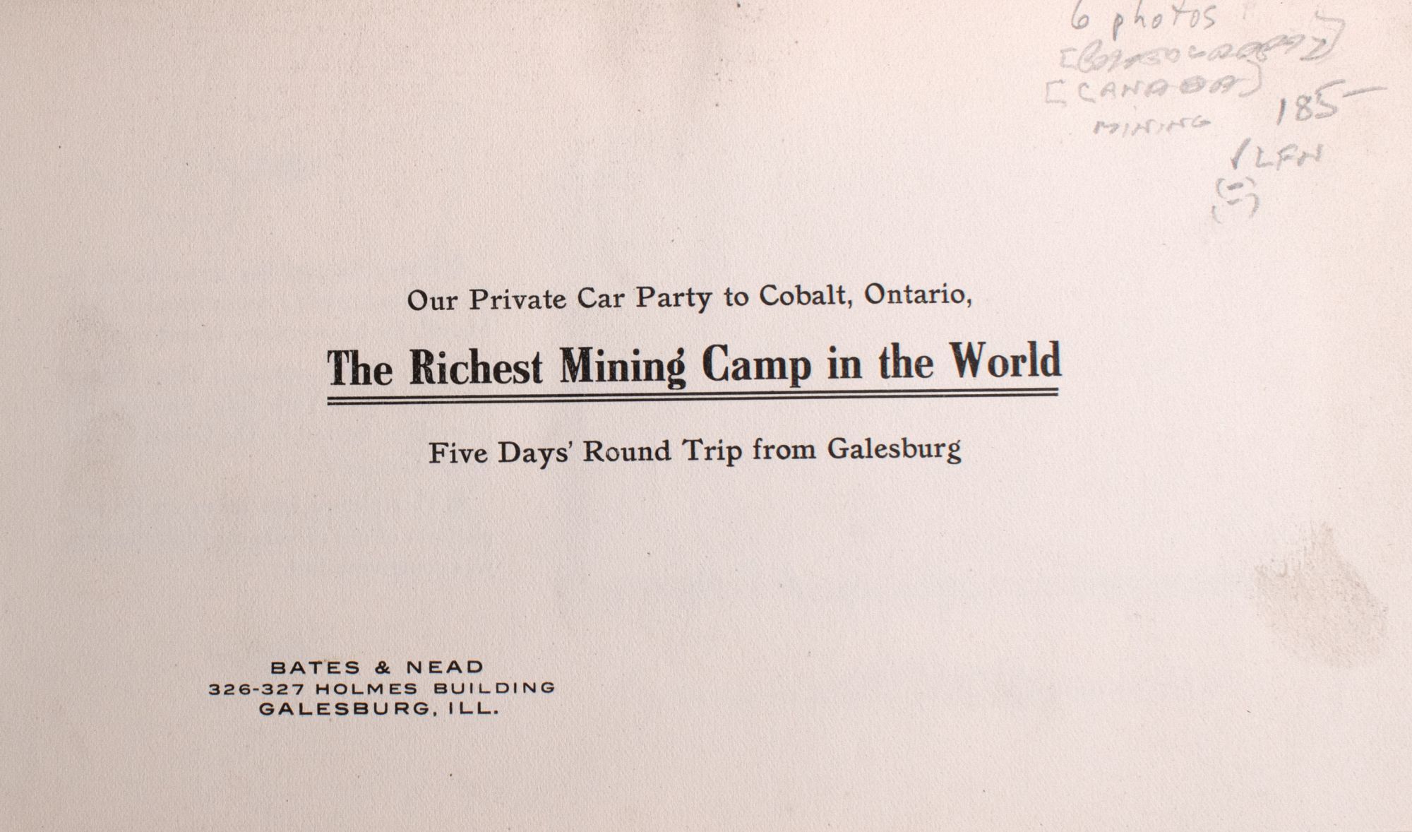 Our Private Car Party to Cobalt, Ontario The Richest Mining Camp in the World. Five Days' Round Trip from Galesburg