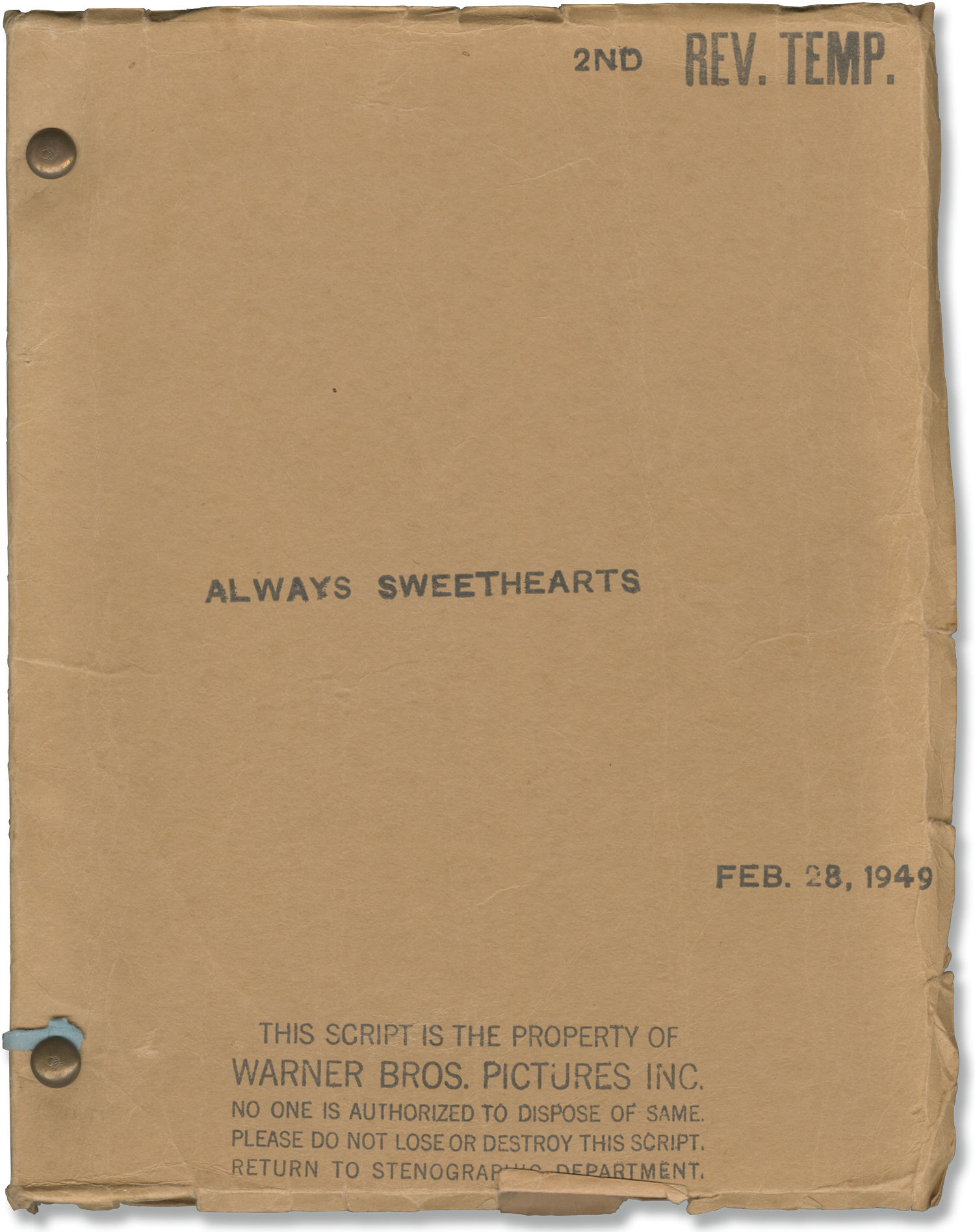 Burbank, CA: Warner Brothers, 1949. Second Revised Temporary script for the 1949 film, seen here under the working title "Always Sweethearts."