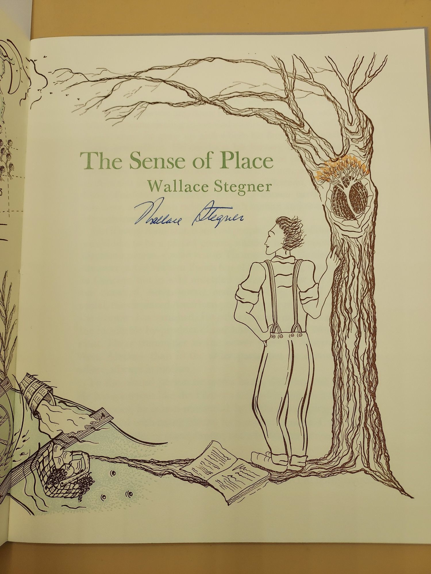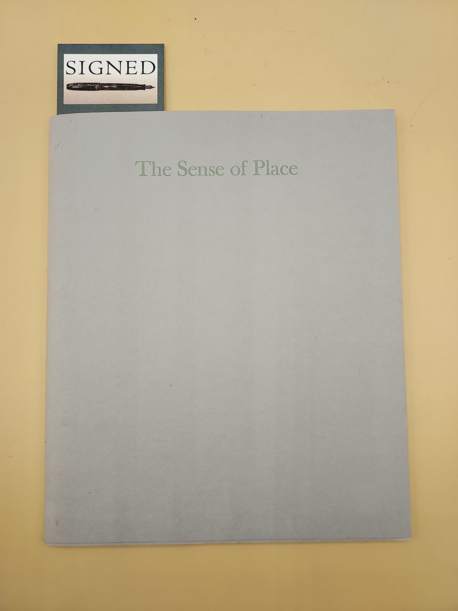 Wisconsin Humanities Council, 1986. Limited Edition. Near fine. Katherine Kuehn. 9pp. Slim square octavo [22 cm] Gray wraps sewn with a single strand of white thread. With a matching dust wrapper printed in light green. Faint shelfwear. Colberg A32. "To encourage reading and discussion on the relationship of myth, story and history, the Wisconsin Humanities Committee has selected a theme: A Sense of Place in History and Literature. The choice of Wallace Stegner to keynote this theme was a natural consequence. Throughout his career, Mr. Stegner has explored the mythical, literary and historical dimensions of the human psyche. The sense of place has been central to his search."