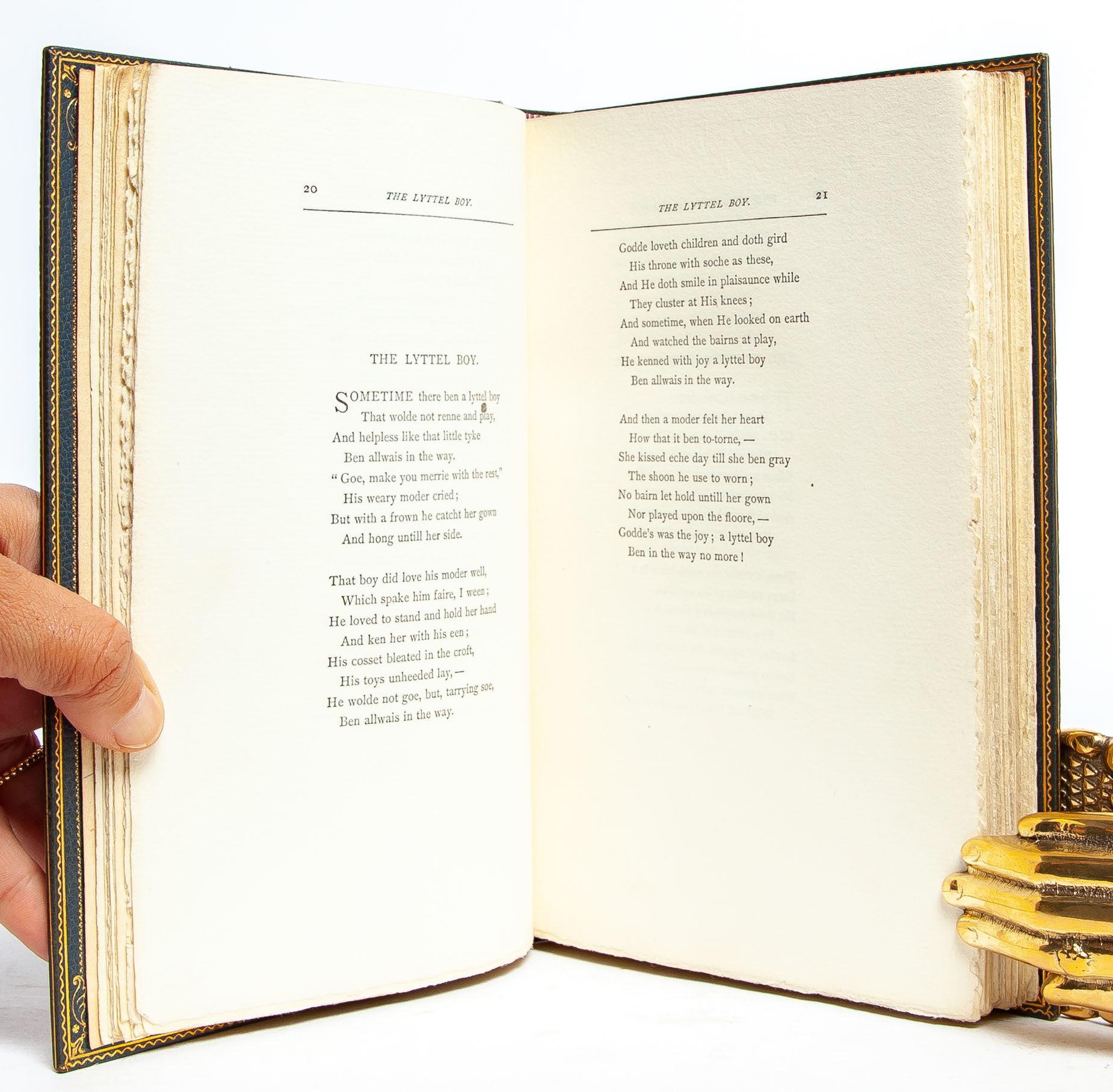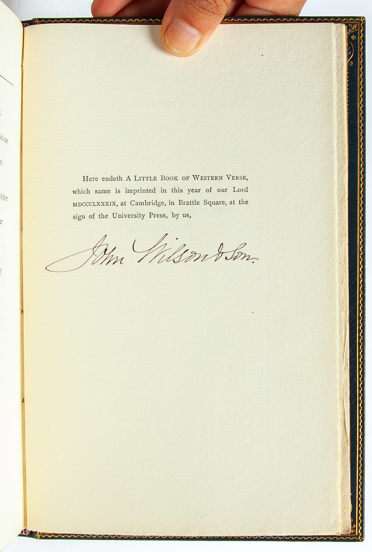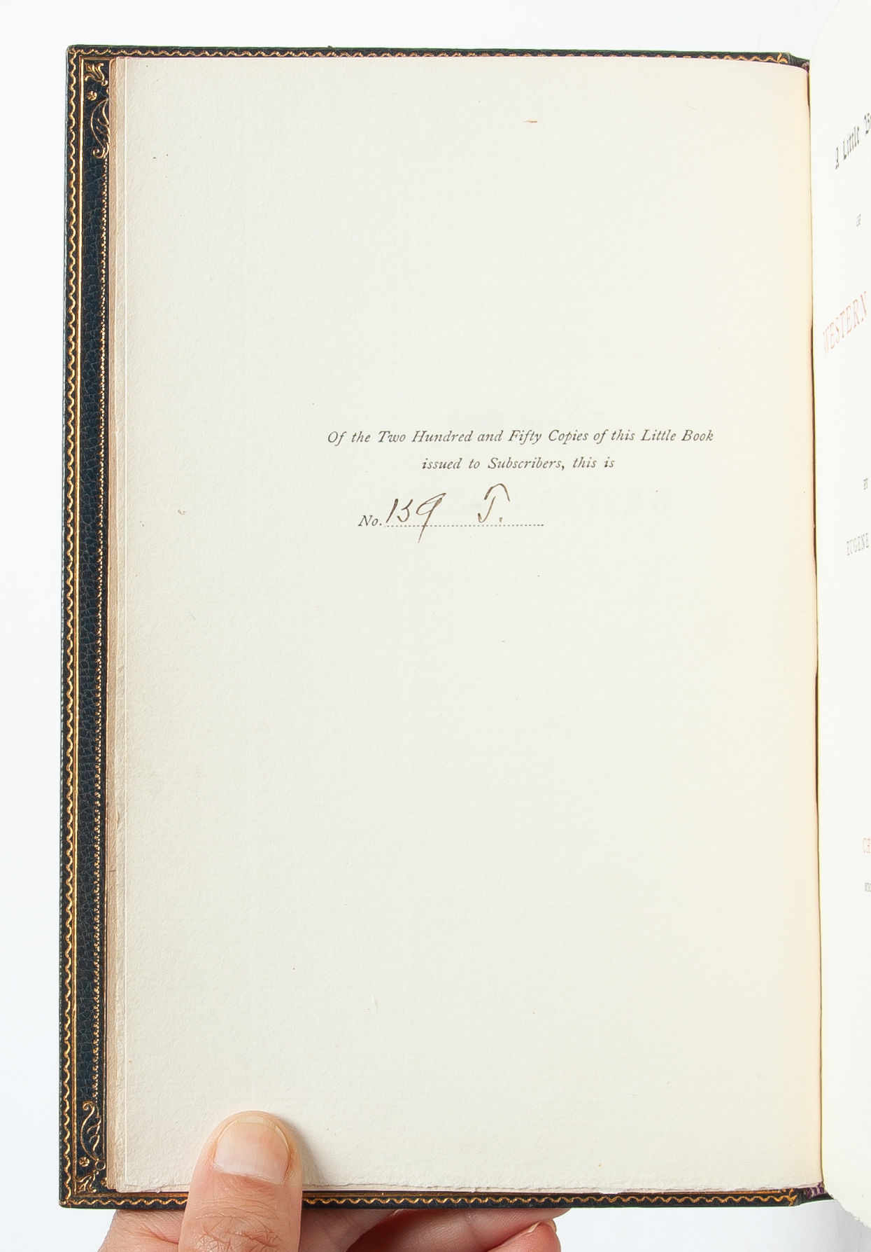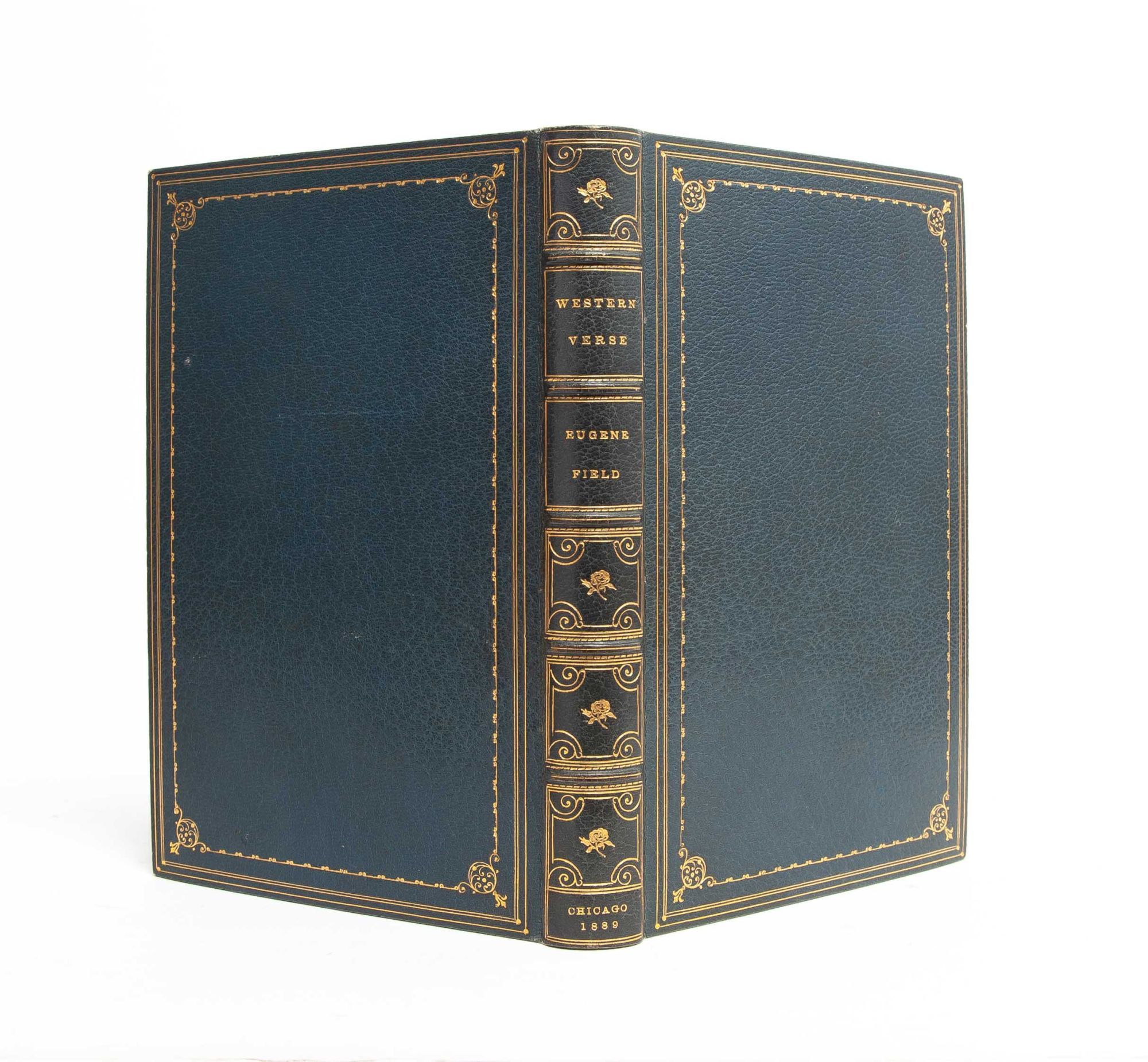 Chicago: [self published], 1889. First edition. Fine. One of 250 copies printed for subscribers, this number 139. Signed by the printer, John Wilson & Son before the list of subscribers. Exquisitely bound by Ringer Bindery (Chicago) in full crushed blue morocco, marbled end papers, top edge gilt. Ruled in gilt with raised bands, gilt titles to spine and decorations in the spine compartments. The author has written out the final stanza of "Buttercup, Poppy, Forget-Me-Not" on the front black, decorated in red and gold ink and signed by Eugene Field.