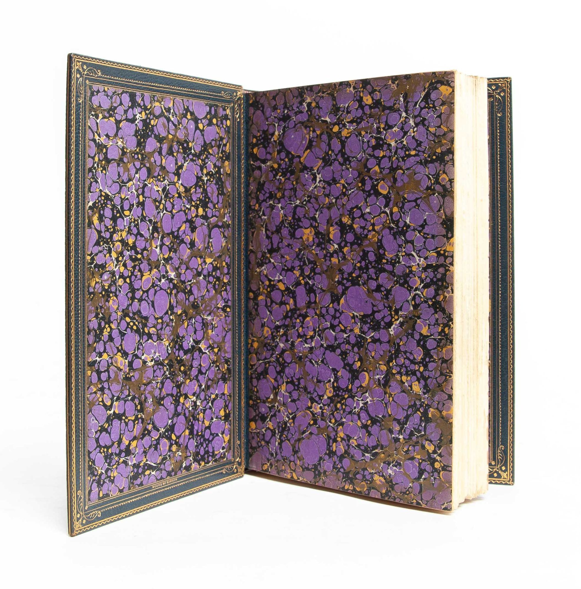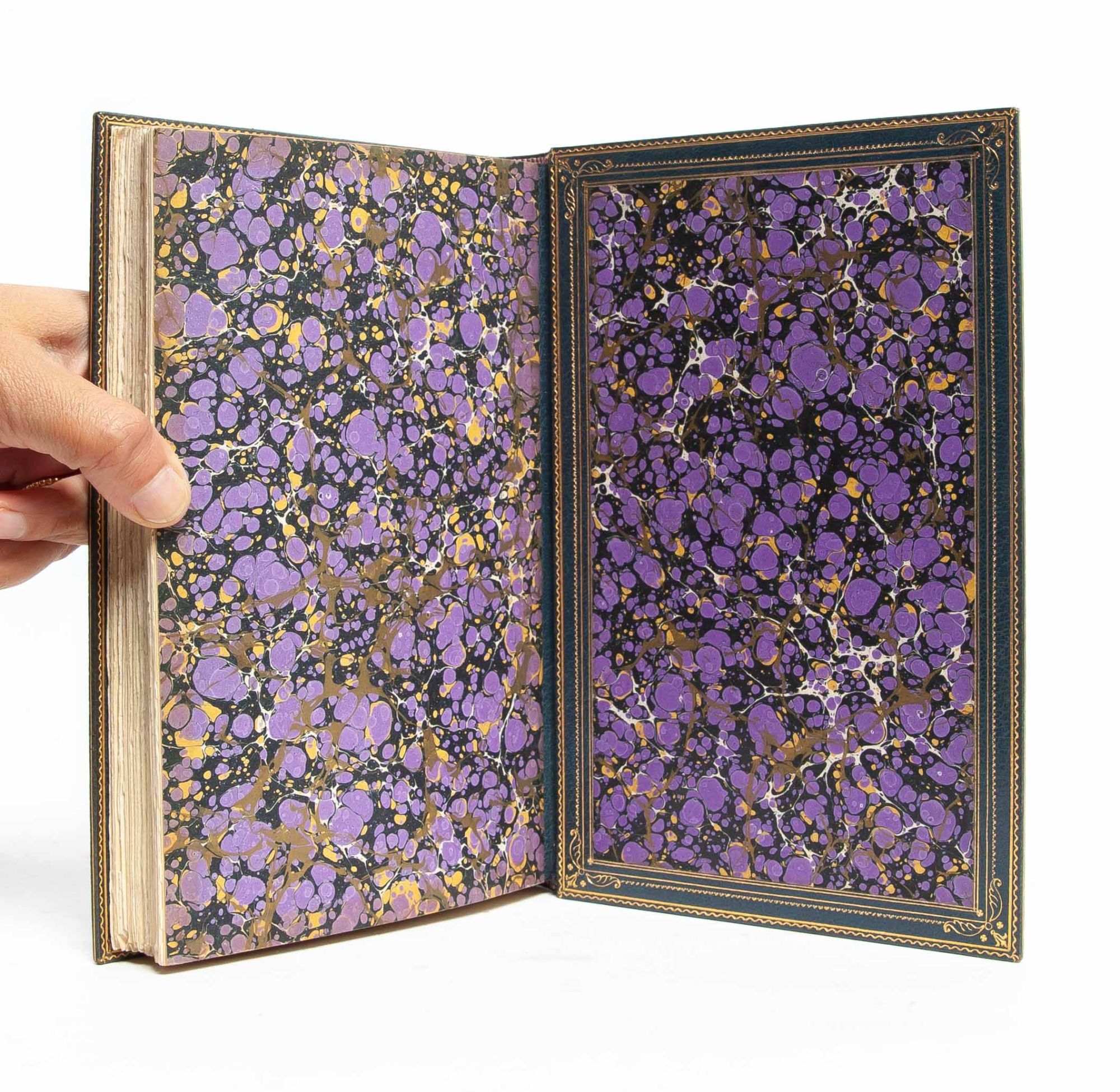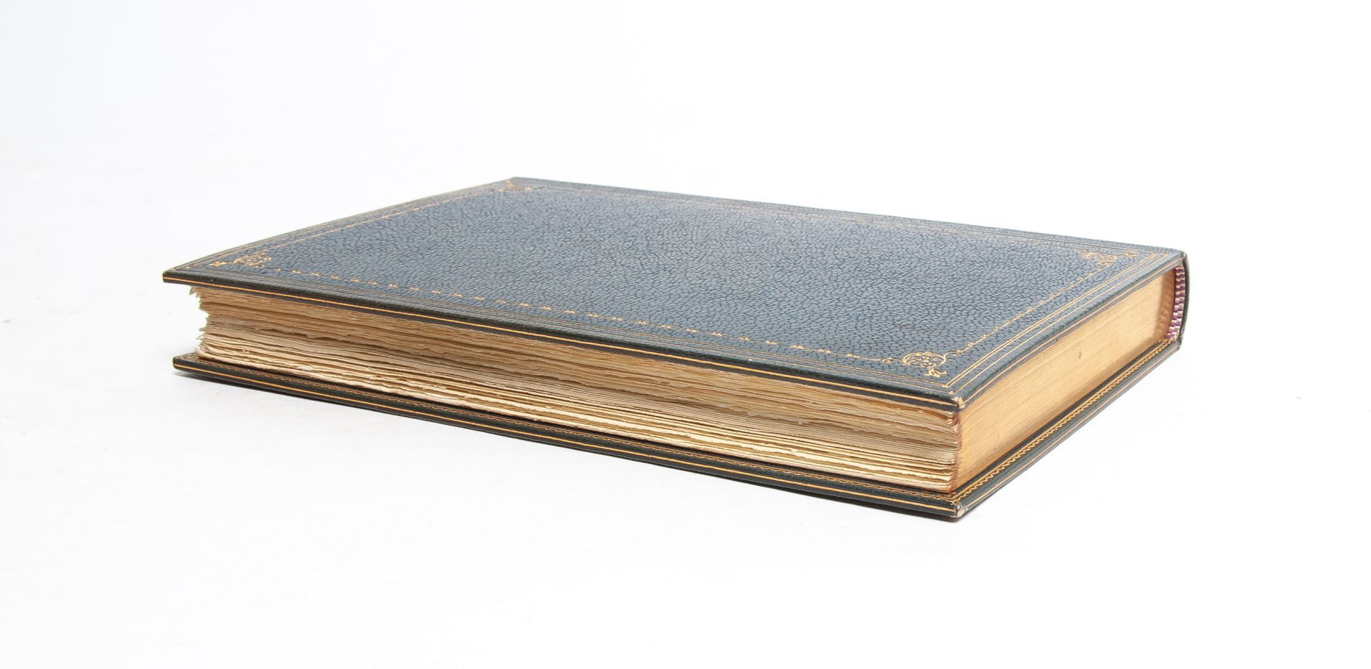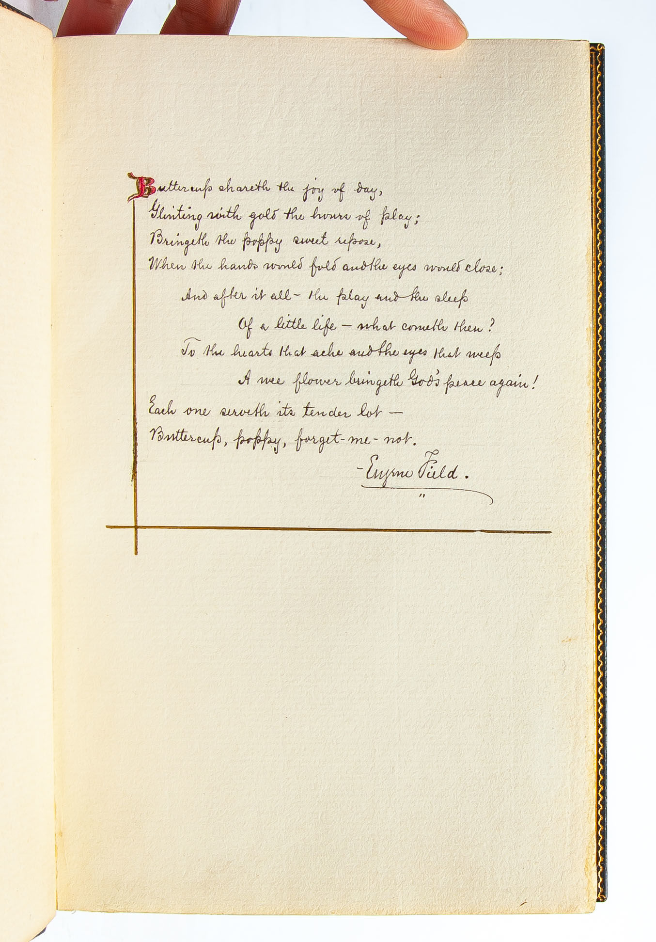 Chicago: [self published], 1889. First edition. Fine. One of 250 copies printed for subscribers, this number 139. Signed by the printer, John Wilson & Son before the list of subscribers. Exquisitely bound by Ringer Bindery (Chicago) in full crushed blue morocco, marbled end papers, top edge gilt. Ruled in gilt with raised bands, gilt titles to spine and decorations in the spine compartments. The author has written out the final stanza of "Buttercup, Poppy, Forget-Me-Not" on the front black, decorated in red and gold ink and signed by Eugene Field.