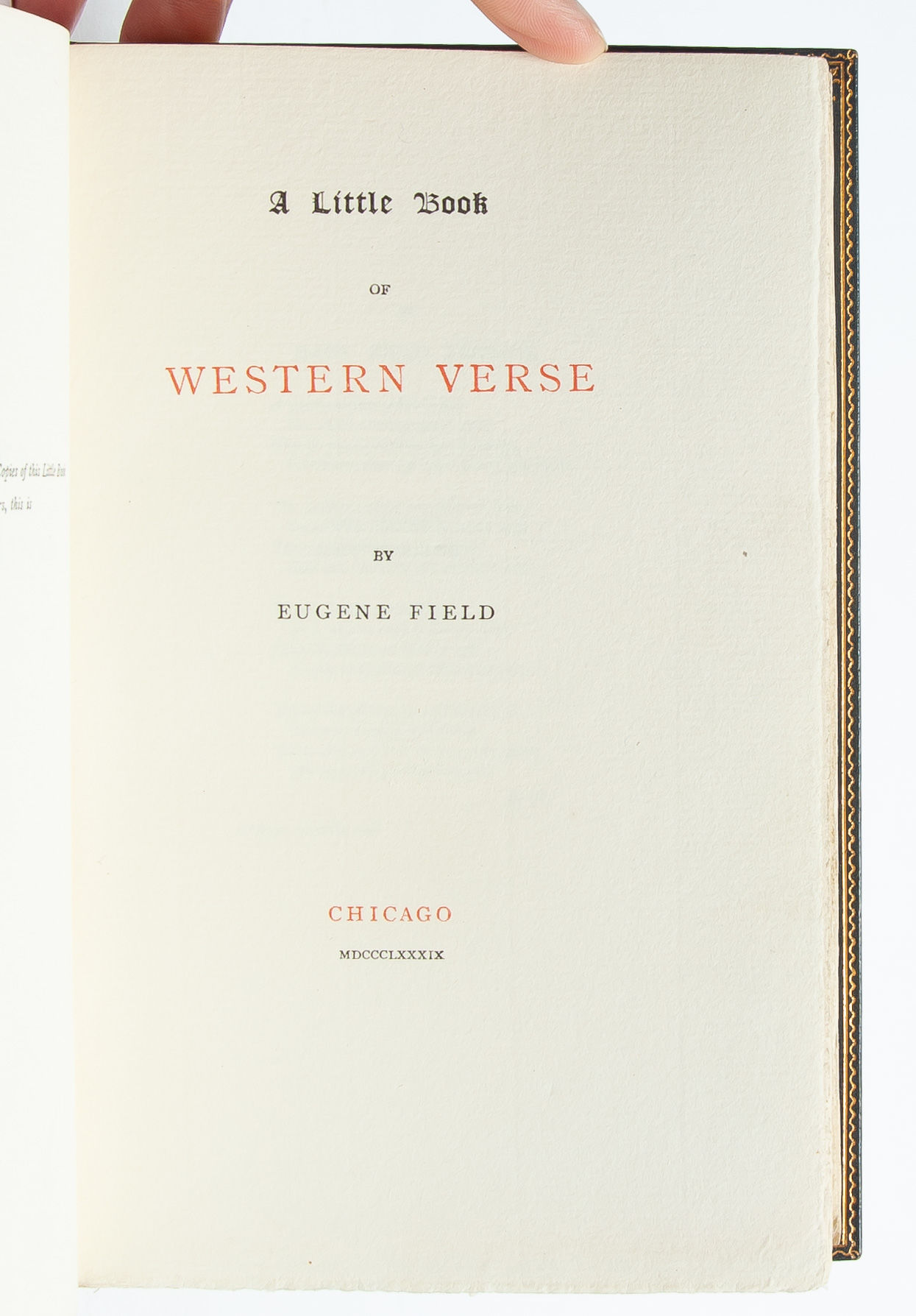 The second book published by the author, and a major factor in Eugene Field's rise to literary celebrity. Though he'd been known in the Midwest as a journalist and editor, A Little Book of Western Verse drew attention to his skill and wit as a lyricist. Most of his poems were about childhood and children -- with inspiration coming directly from his own. Works such as Little Boy Blue and Wynken, Blynken, and Nod, which were written for their amusement, resulted in his being known as "The Poet of Childhood" (Denver Library). Fine.