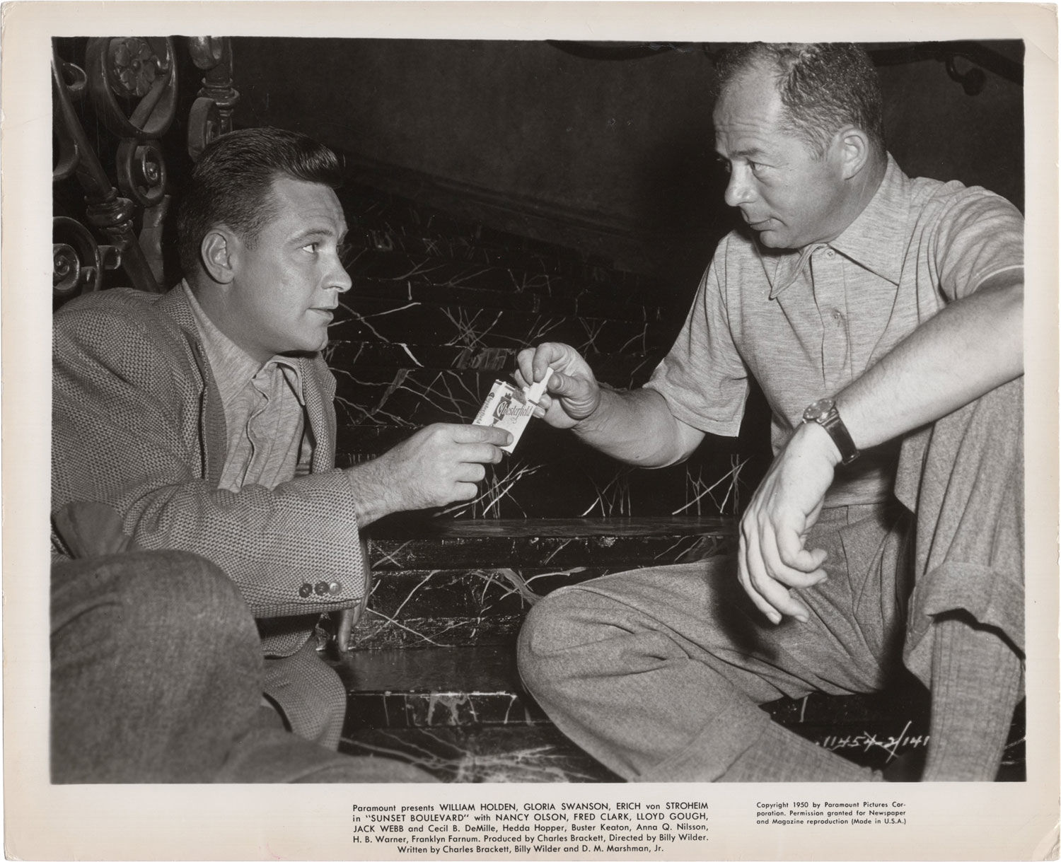 Hollywood: Paramount Pictures, 1950. Vintage studio still photograph from the 1950 film, showing director Billy Wilder smoking a cigarette with actor William Holden between takes. Annotations in manuscript pencil on the verso, along with the stamp of Cinéma magazine.