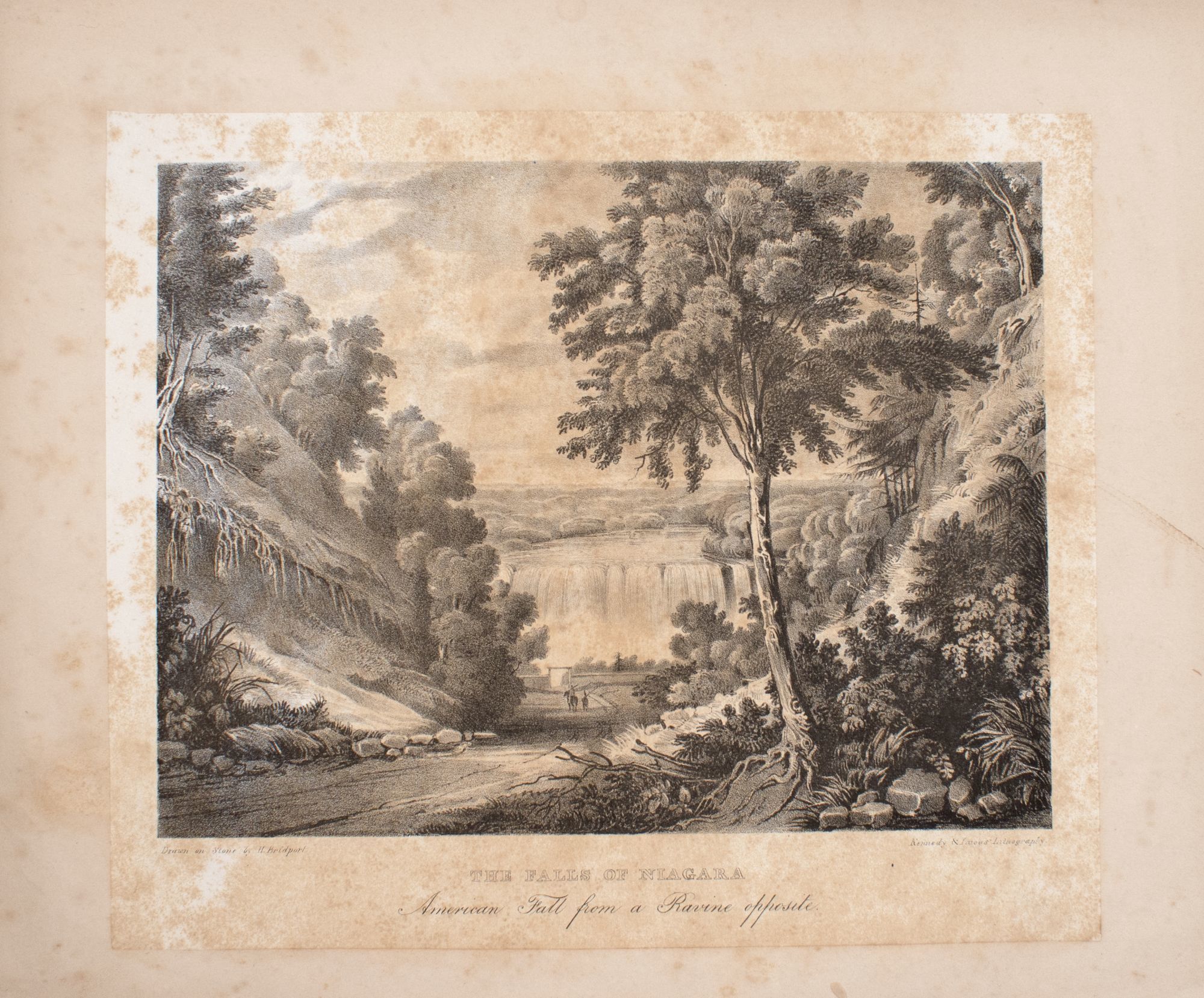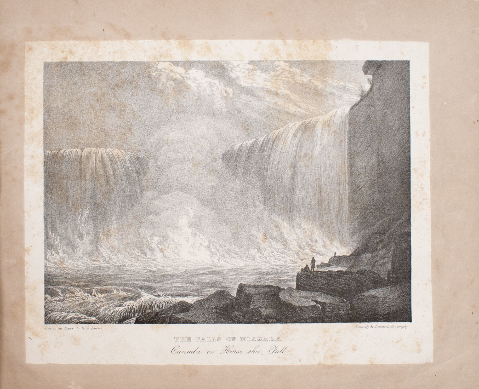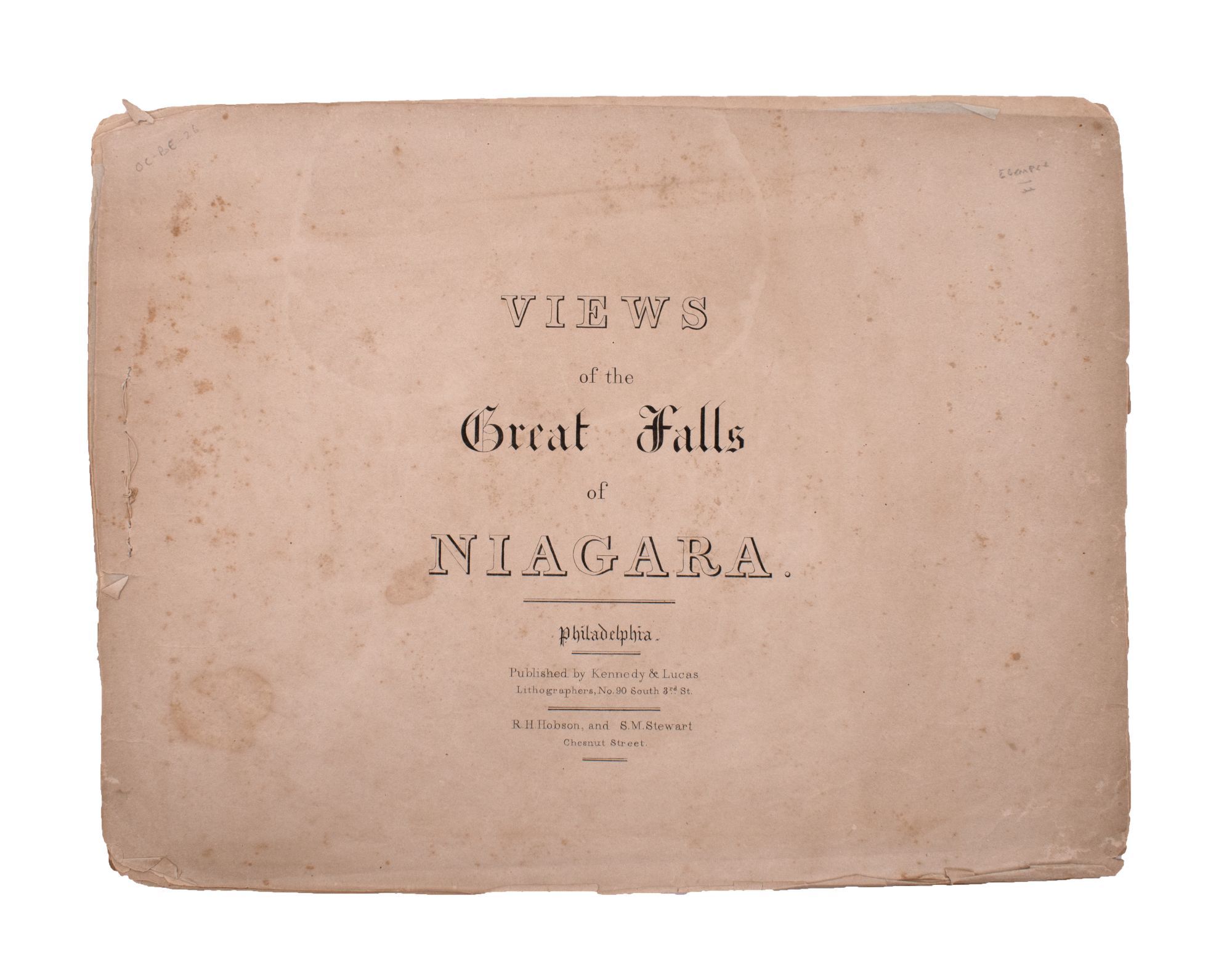 Philadelphia: Published by Kennedy & Lucas Lithographers ... R. H. Hobson and S. M. Stewart, 1830. First American edition. 5 lithographed plates printed on chine collé and mounted, as issued. With the original tissue guards. Oblong small folio (11-1/2 x 15 inches). Stitched lettered wrappers, minor foxing, minor chips at edges. Housed in a cloth box. First American edition. 5 lithographed plates printed on chine collé and mounted, as issued. With the original tissue guards. Oblong small folio (11-1/2 x 15 inches). The exceptionally rare American edition of this series of lithographic view of Niagara Falls, pirated from the British edition published in London by Ackermann circa 1827, is among the earliest lithographic view books produced in the United States. Printed by Kennedy & Lucas, one of the first lithographic firms to operate in Philadelphia, three of the five plates were drawn on stone by Hugh Bridport (c. 1794-1868) and the other two by Willam B. Lucas, one of the partners in the firm. Peters, in his comprehensive America on Stone, notes the firm in operation from 1829-1835 and describes their work as "above the average" in this early period, but was unaware of the present views. The booksellers/printsellers/stationers noted below the Kennedy & Lucas imprint were independently active on Chesnut Street only from 1829-1831.
