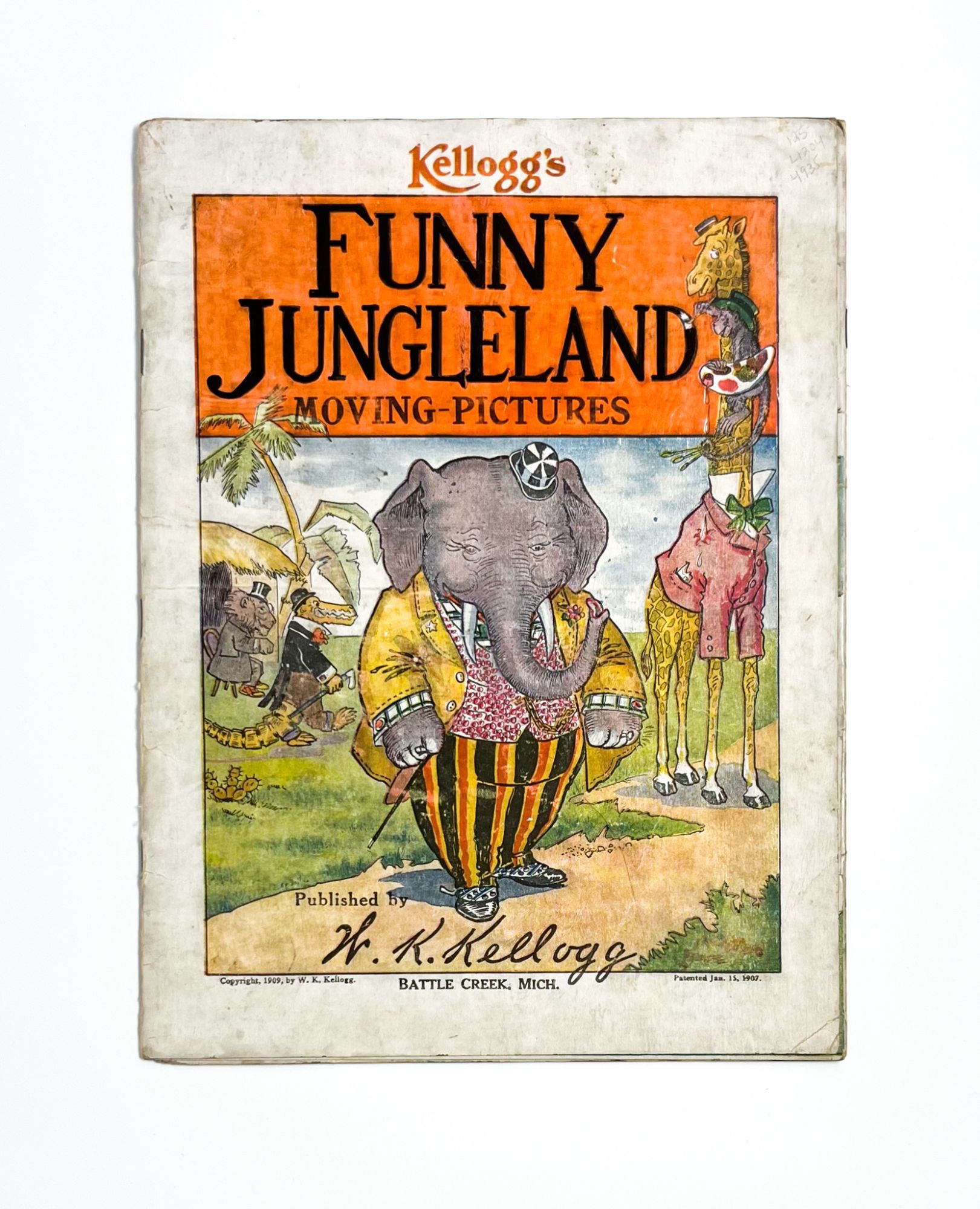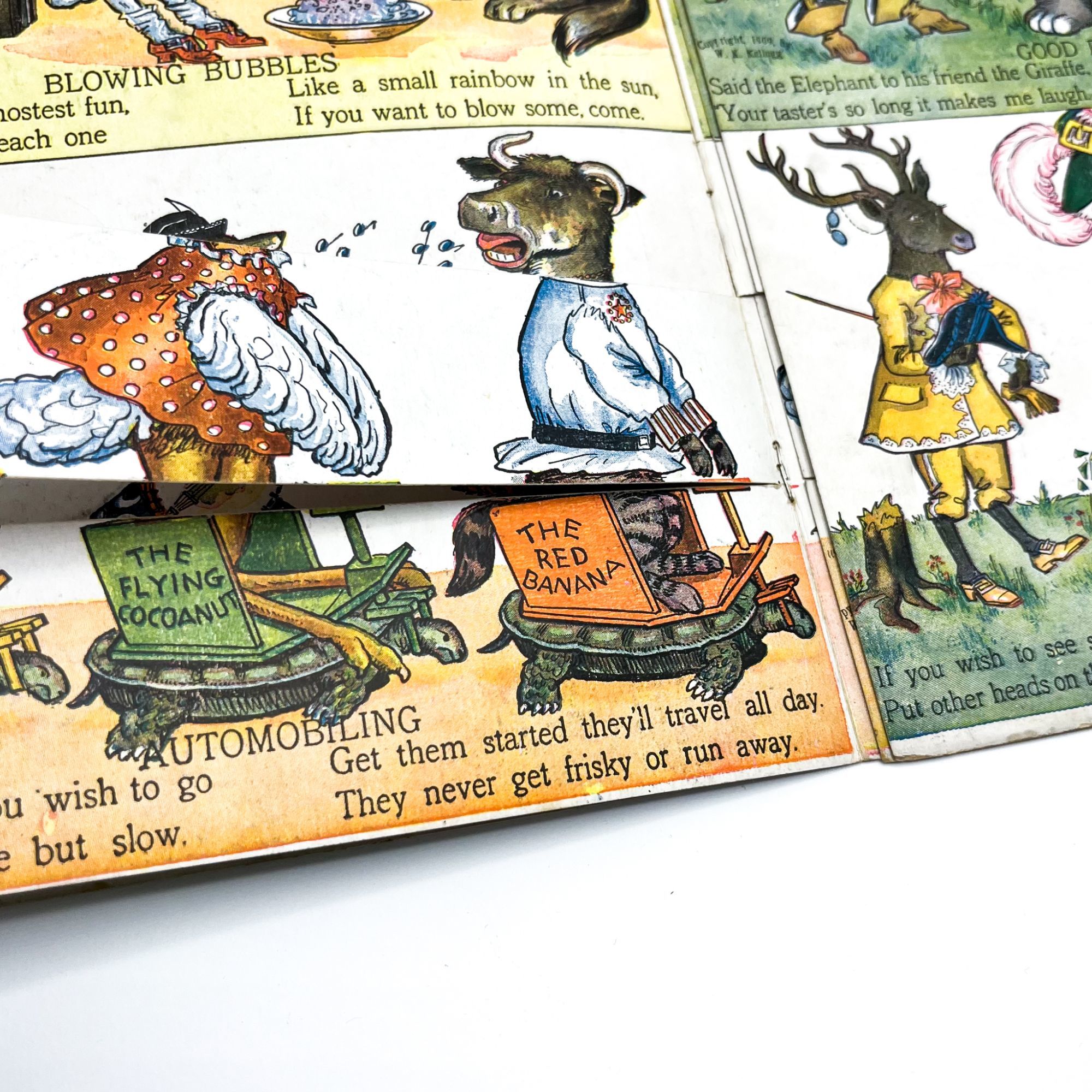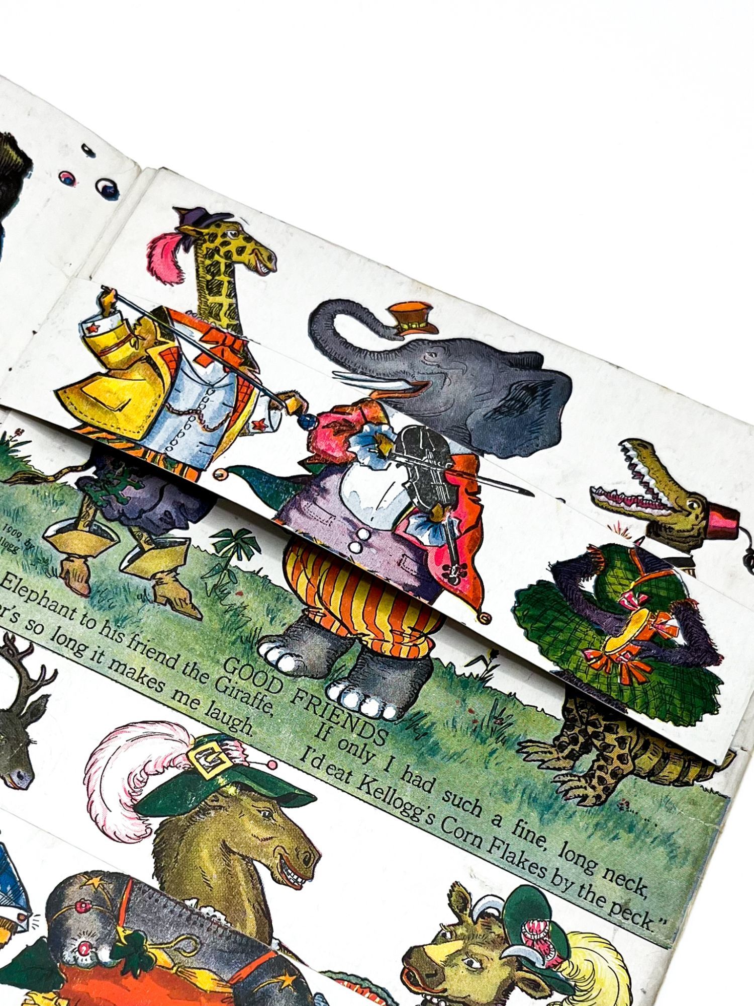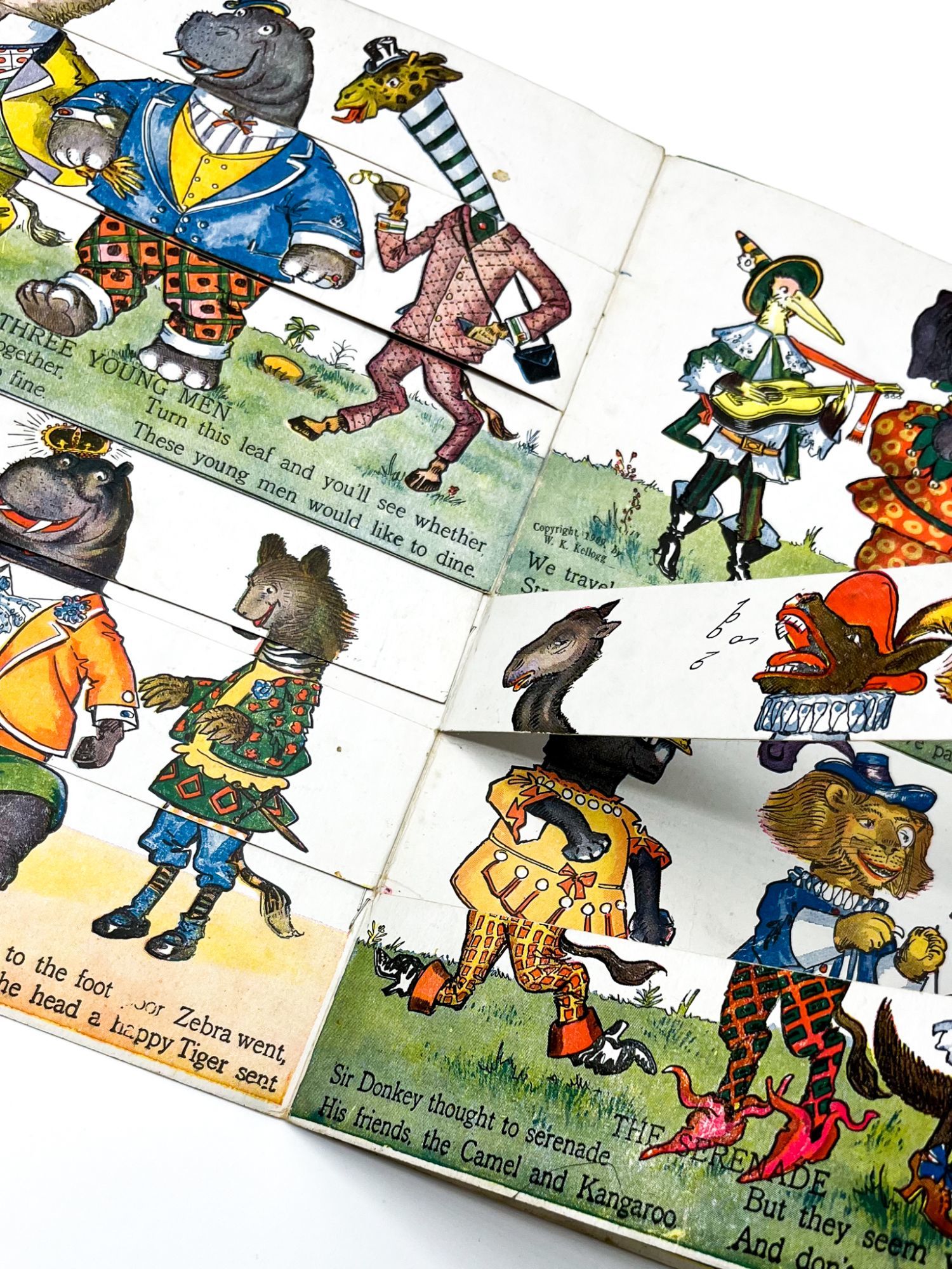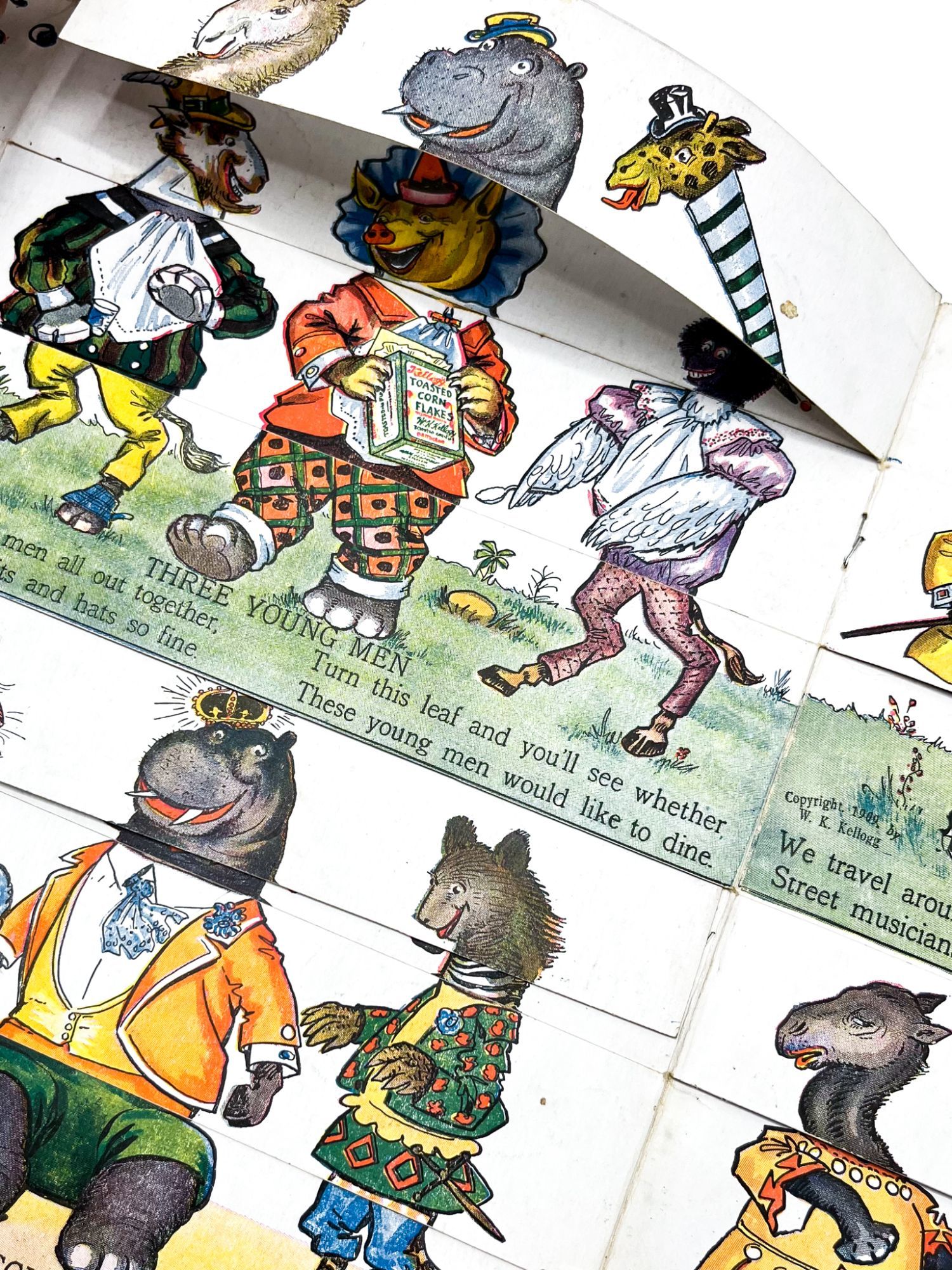 Battle Creek, Michigan: W. K. Kellogg, 1909. Very good.. Exuberant transformation book with moveable flaps that allow the user to dress anthropomorphized animals in various costumes. 10.75'' x 8''. Original stiff pictorial wrappers. Two leaves folded into three sections each; two sections of interior leaf cut into moveable flaps. Brightly illustrated in color throughout. Outer leaf somewhat soiled; title neatly traced by previous owner.