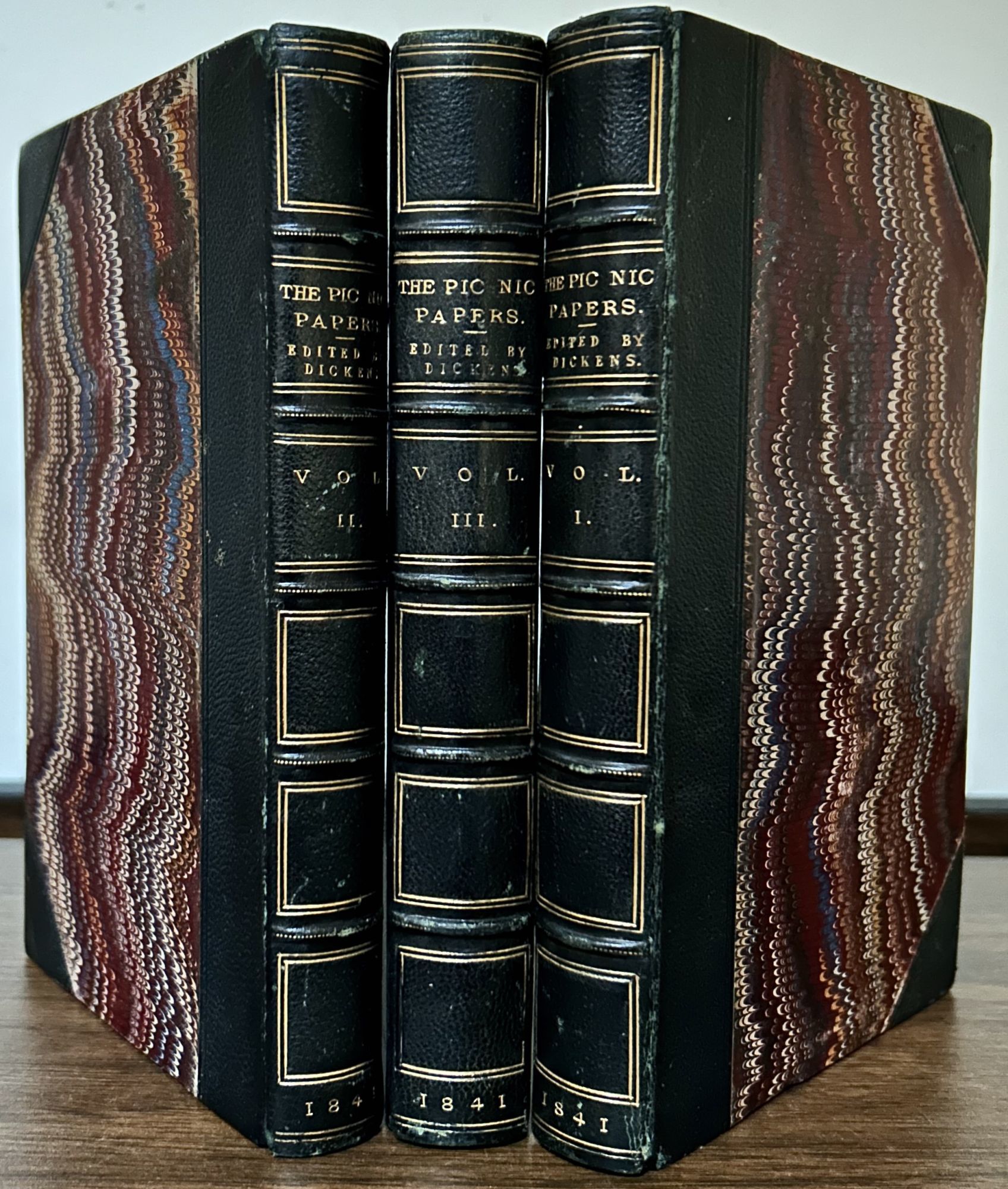 London: Henry Colburn, Publisher, 1841. First Edition, First Issue. Hardcover. Later three quarter black morocco, marbled boards and matching marbled endpapers. Near fine. Aeg. 323, 298, 378. 18.5 x 12 cm. Three frontispieces and eleven etched plates by George Cruikshank, Phiz and Robert Jacob Hammerton. Lacks publisher ads. First issue with the error "publisher young" in Dicken's introduction in volume one and imprint of Cox and Son on copyright in volume I. Dickens edited the first two volumes, wrote the introduction and was responsible for The Lamplighter's Story. Interior and plates bright and fresh with scribbling circles on each title page in an effort to hide a previous signature.