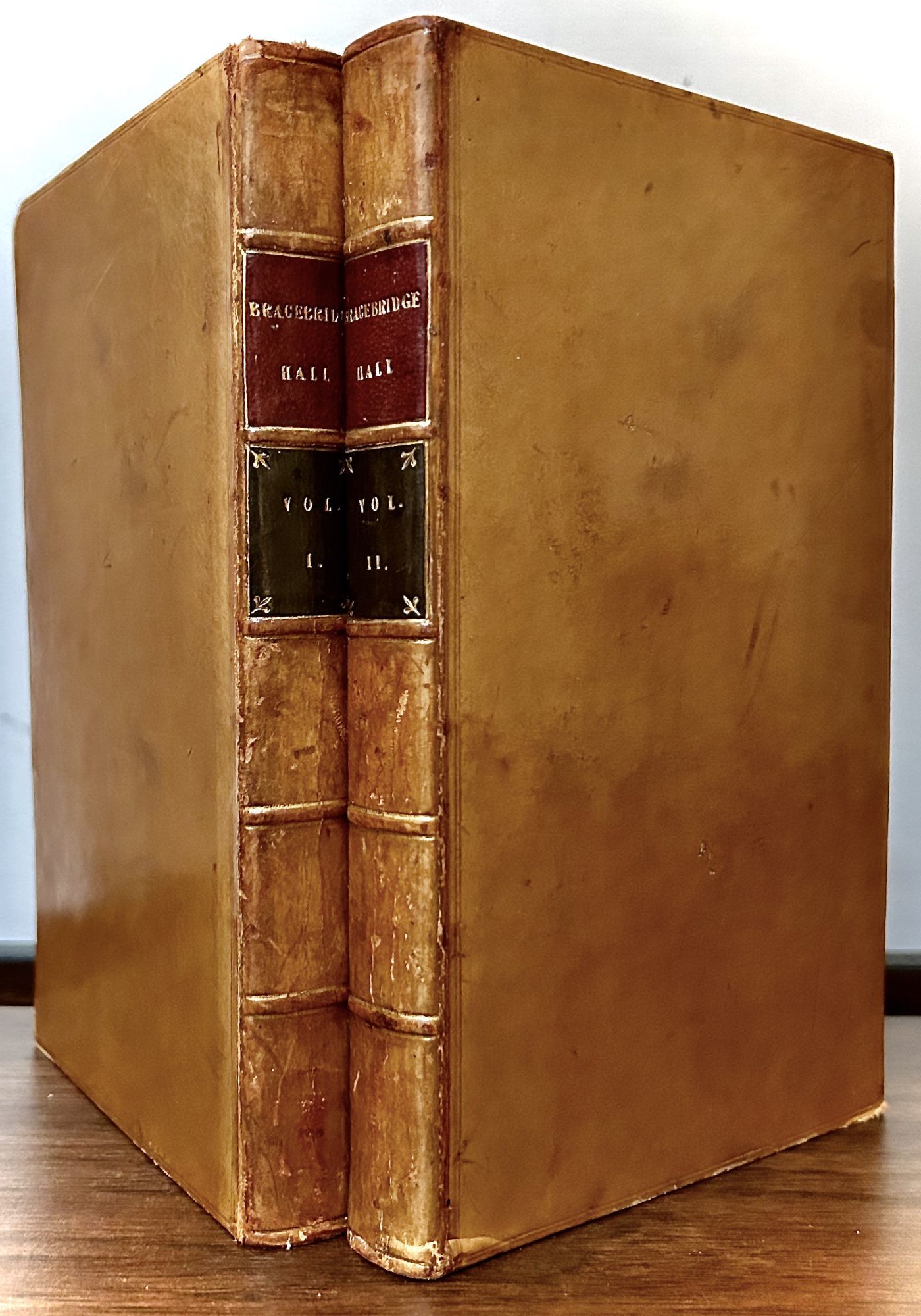 London: John Murray, 1822. First English Edition. Hardcover. Contemporary polished brown calf. Near fine. 2 Vols. 393, 404 pages. 22 x 23.5 cm. Second printing Vol. II ending on p.404. A series of character sketches by Irving related to members of the Bracebridge family whom Washington once visited -- basically, character sketches of family members. Bound by Carss of Glasgow with bookplates of Robert Day, Myrtle House Cork. Text fresh, clean and bright. Raised bands, spine labels in red and black printed in gilt, and all the edges have been glazed.