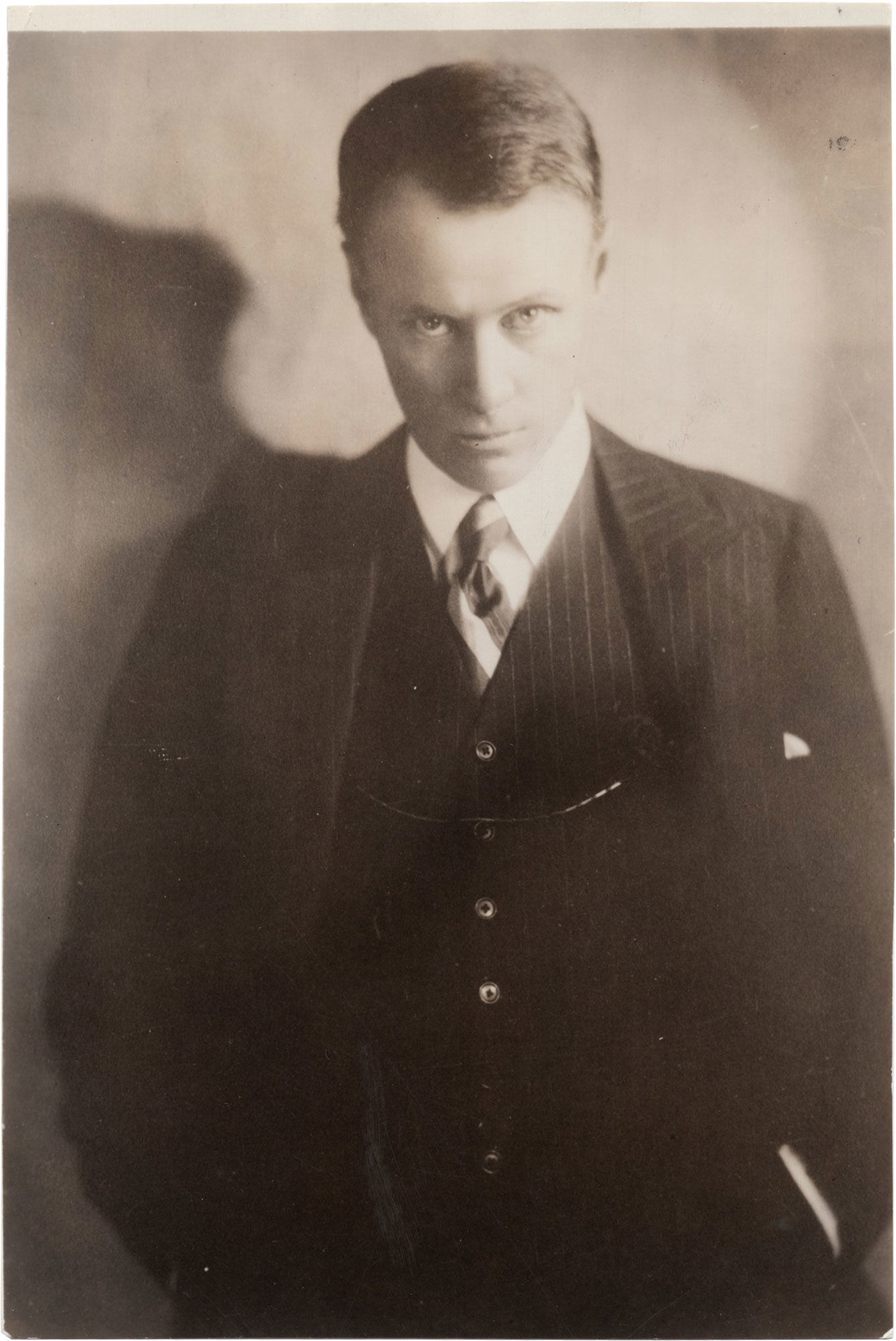 Stockholm: Svenska Dagbladet, 1926. Vintage borderless photograph of author Sinclair Lewis, circa 1926. Printed mimeo snipe affixed to the verso, along with the stamps of Svenska Dagbladets.