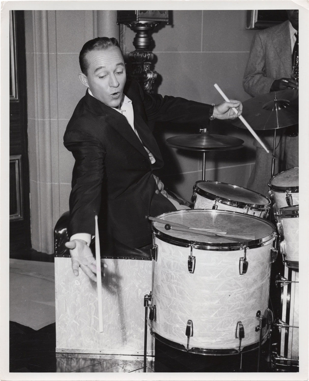 Beverly Hills, CA: Metro-Goldwyn-Mayer [MGM], 1956. Vintage candid photograph of actor Bing Crosby attempting to play the drums on the set of the 1956 musical film. Mimeo snipe on the verso.