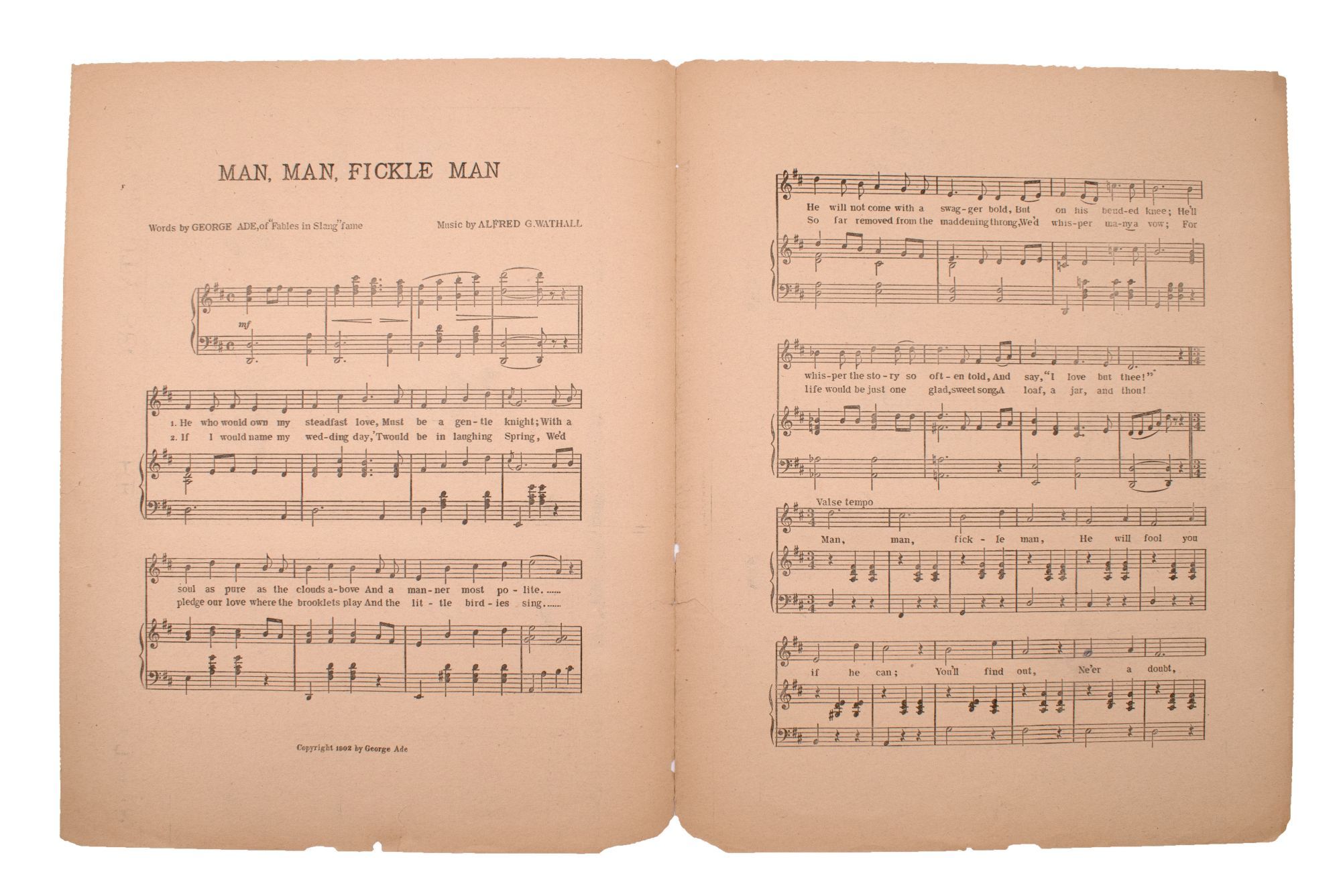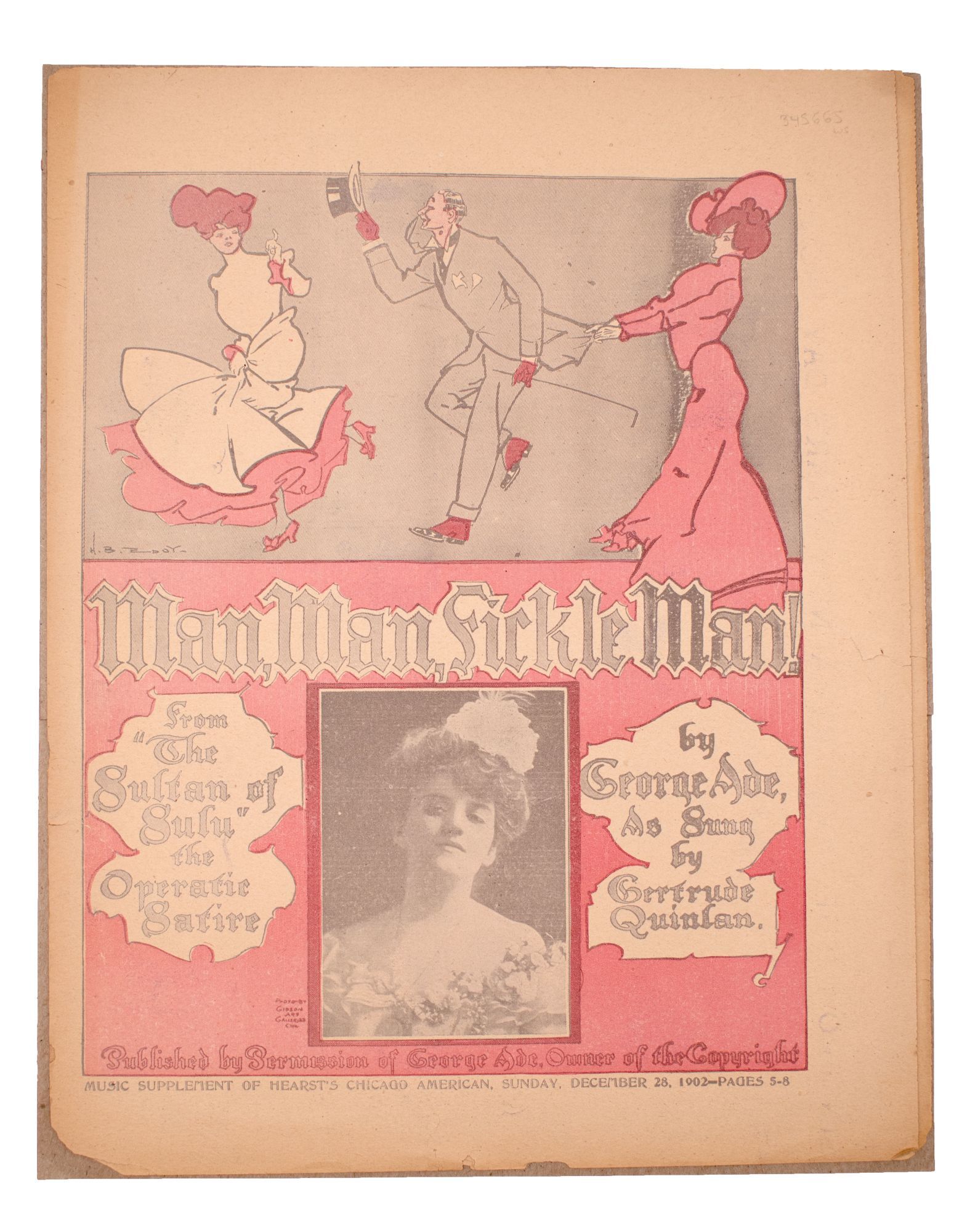 New York: Published by Permission of George Ade [as] Music Supplement of Hearst's Chicago American, 1902. First edition; sheet music. Single leaf, folded. 4to. Illustrated wrap folded to make [4] pages; acidic text is tanned, few tears, thin chipping at base of spine, else a very good copy of a fragile publication. First edition; sheet music. Single leaf, folded. 4to. This imprint unrecorded by OCLC (which locates a single holding with a "New York American and Journal" imprint) [South Florida].