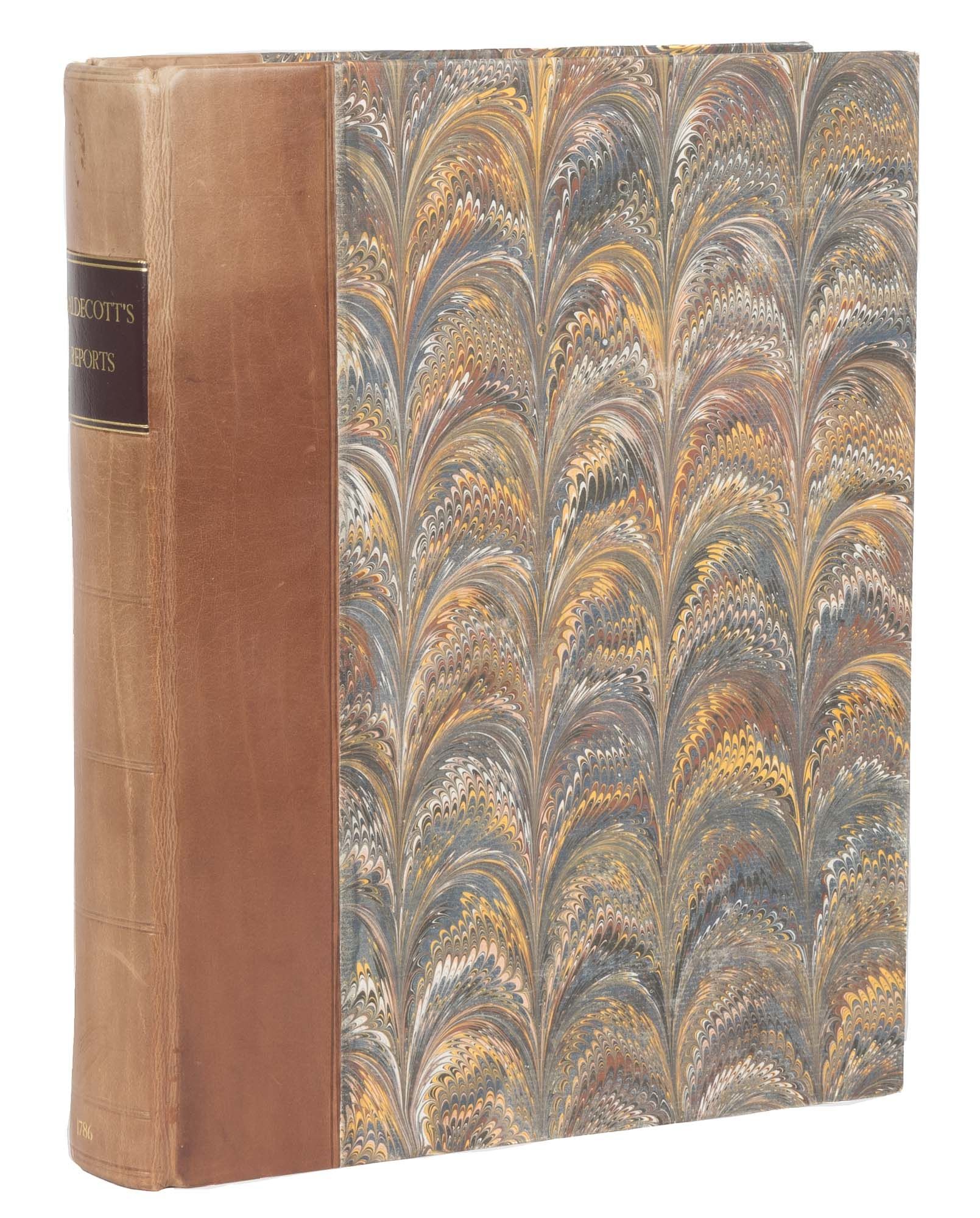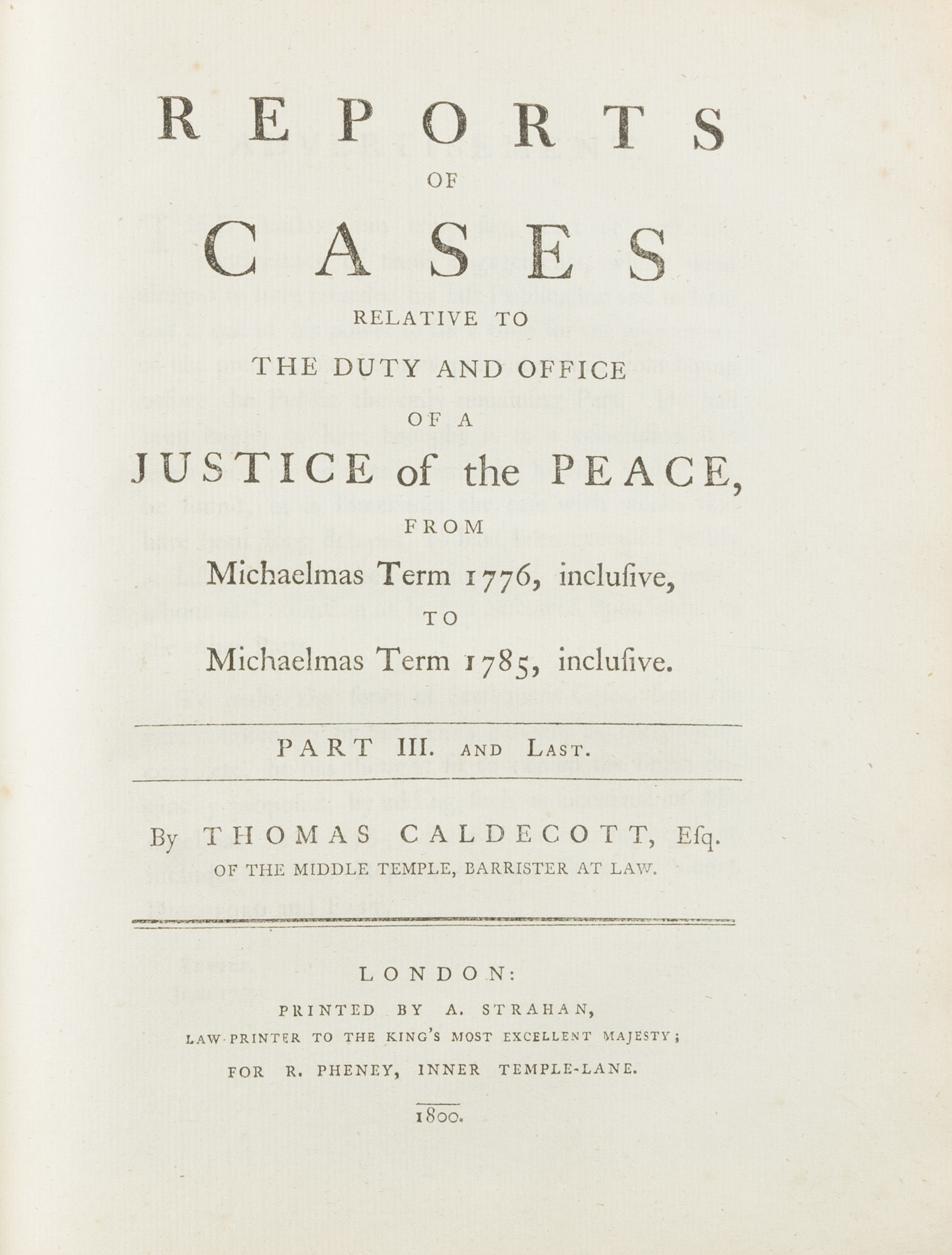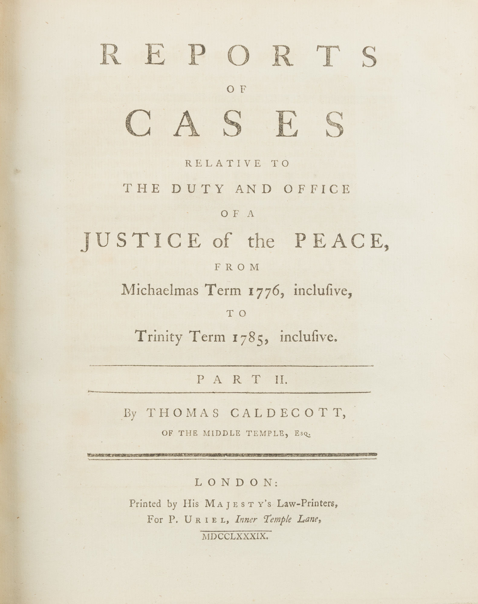 1776. Settlement Cases Relating to Justices of the Peace Caldecott, Thomas [1744-1833]. Reports of Cases Relative to the Duty and Office of a Justice of the Peace, From Michaelmas Term 1776, Inclusive, to Michaelmas Term 1785, Inclusive. London: Printed by His Majesty's Law Printers, For P. Uriel, 1786-1797. [viii], 166, [2]; [viii], 167-388, [2]; [vi], 389-593, [3] pp. Three parts, each with title page and individual pagination. Quarto (10-1/2" x 8-1/2'). Recent period-style calf, endpapers renewed. Light fading to spine, minor wear to spine ends. Moderate toning to interior, light foxing in a few places, negligible faint dampstaining to preliminaries, library marking to verso of title page, small library stamp to following leaf. $450. * Only edition. Bridgeman says Caldecott was "peculiarly conversant" with settlement cases. His collection of reports was produced as a continuation of Sir James Burrow's Decisions of the Court of King's Bench, Upon Settlement-Cases, which covered the years 1732 to 1776. Several cases reported by Caldecott were decided by Mansfield. Bridgeman cited in Marvin, Legal Bibliography 170. English Short-Title Catalogue T95280.