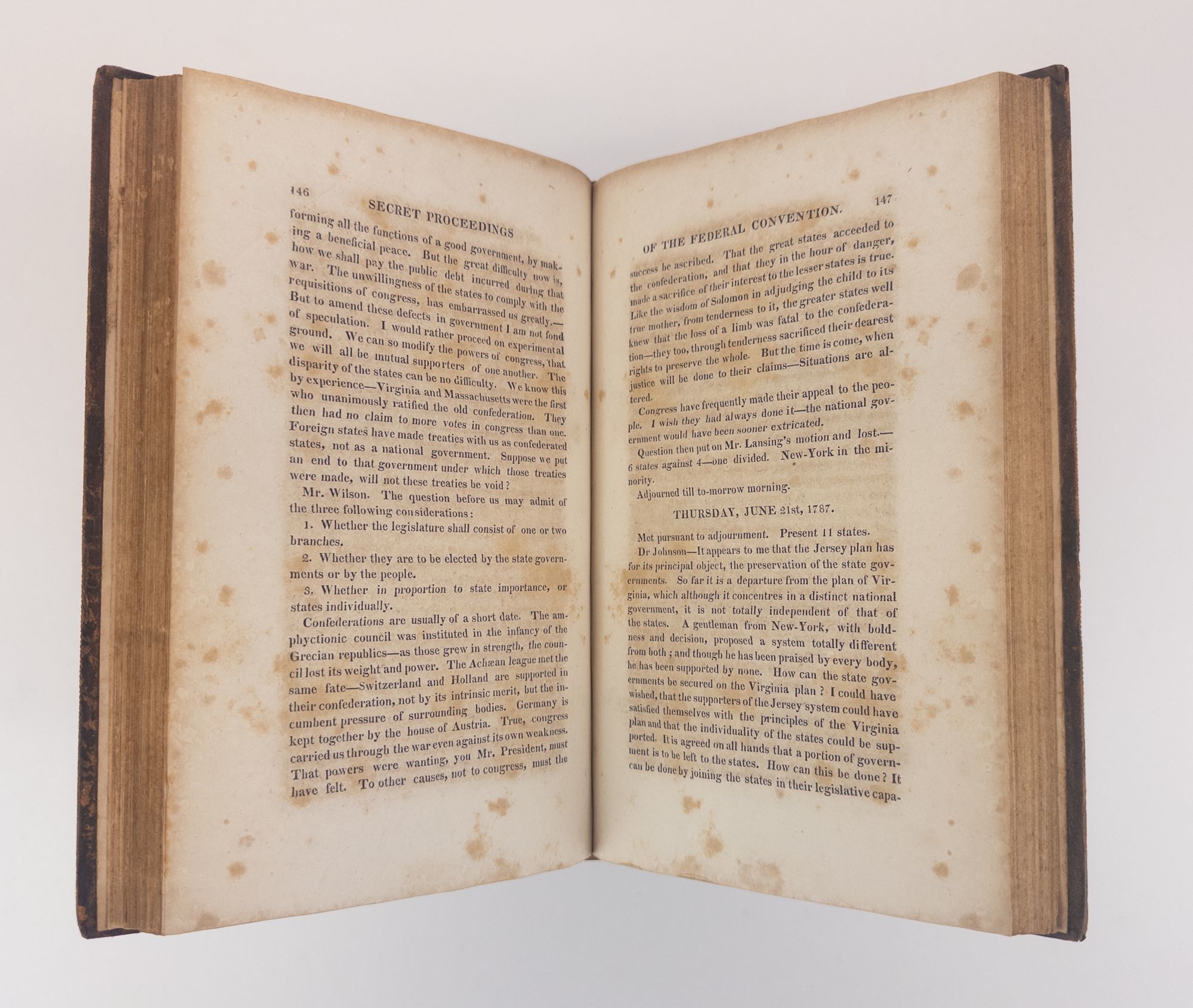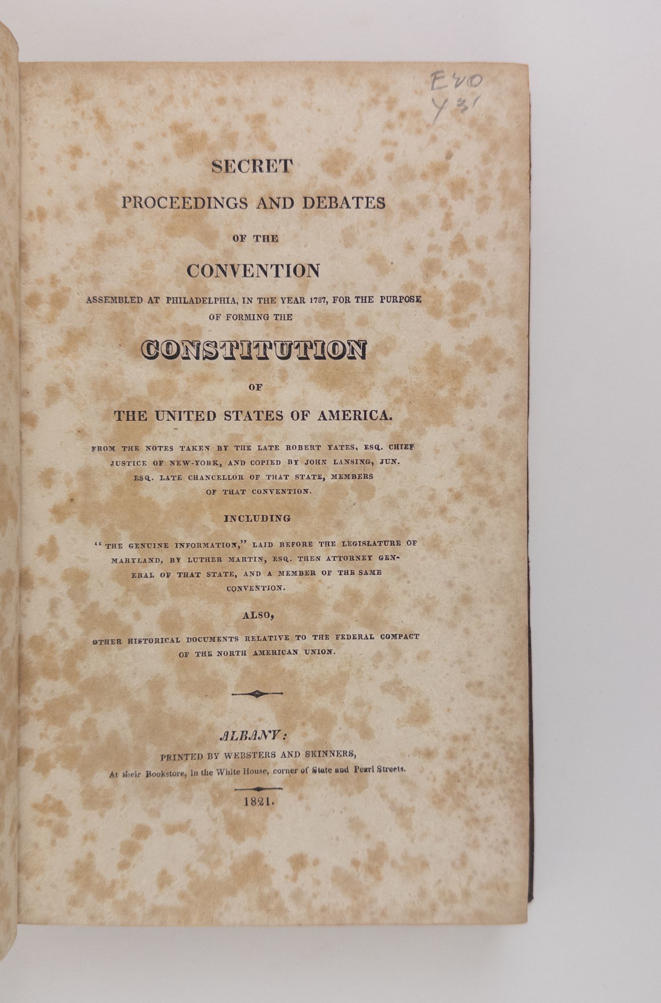 SECRET PROCEEDINGS AND DEBATES OF THE CONVENTION ASSEMBLED AT PHILADELPHIA, IN THE YEAR 1787, FOR THE PURPOSE OF FORMING THE CONSTITUTION OF THE UNITED STATES OF AMERICA. FROM THE NOTES TAKEN BY THE LATE ROBERT TATES, ESQ. CHIEF JUSTICE OF NEW YORK, AND COPIED BY JOHN LANSING, JUN. ESQ. LATE CHANCELLOR OF THAT STAE, MEMBERS OF THAT CONVENTION. INCLUDING "THE GENUINE INFORMATION," LAID BEFORE THE LEGISLATURE OF MARYLAND, BY LUTHER MARTIN, ESQ. THEN ATTORNEY GENERAL OF THAT STATE, AND A MEMBER OF THE SAME CONVENTION. ALSO, OTHER HISTORICAL DOCUMENTS RELATIVE TO THE FEDERAL COMPACT OF THE NORTH AMERICAN UNION