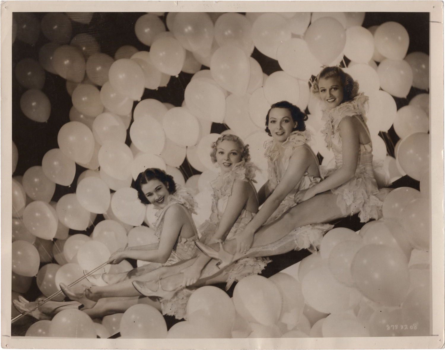 N.p.: France Presse, 1936. Vintage reference photograph from the 1936 film, showing actresses Diane Cook, Edna Callahan, Hester Deane, and Mary Jane Halsey in a sea of white balloons. Printed mimeo snipe affixed to the verso, along with the stamp of France Presse and Page Illustree.