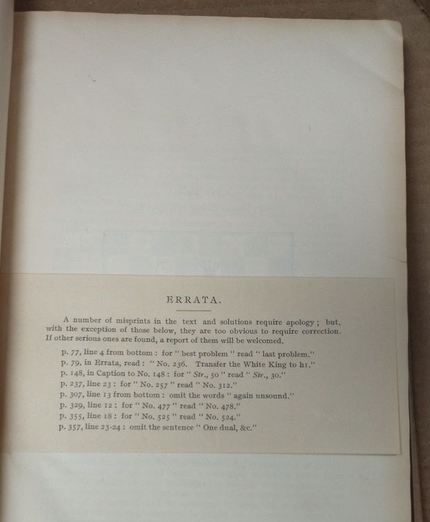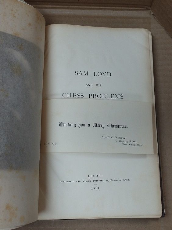 Leeds: Whitehead and Miller, Printers, 1913. Hardcover. Octavo; Fair+; Hardcover; Spine, tan with gold print; Mylar cover has edgewear with tear at top of spine; Boards in pink cloth with gold print, fraying to spine caps, fraying to bumped fore corners, toning to spine, toning overall front and rear; Text block has tanned endpapers, foxing on tissue guard over frontispiece, else clean and tight; Gift message slip tipped in at title page; Errata slip tipped-in at p. 6; "From Mrs. Addie J. Loyd ... Dec. 1913" penciled on front flyleaf; 471 pages, frontispiece (port.), illustrated (b&w chess diagrams).