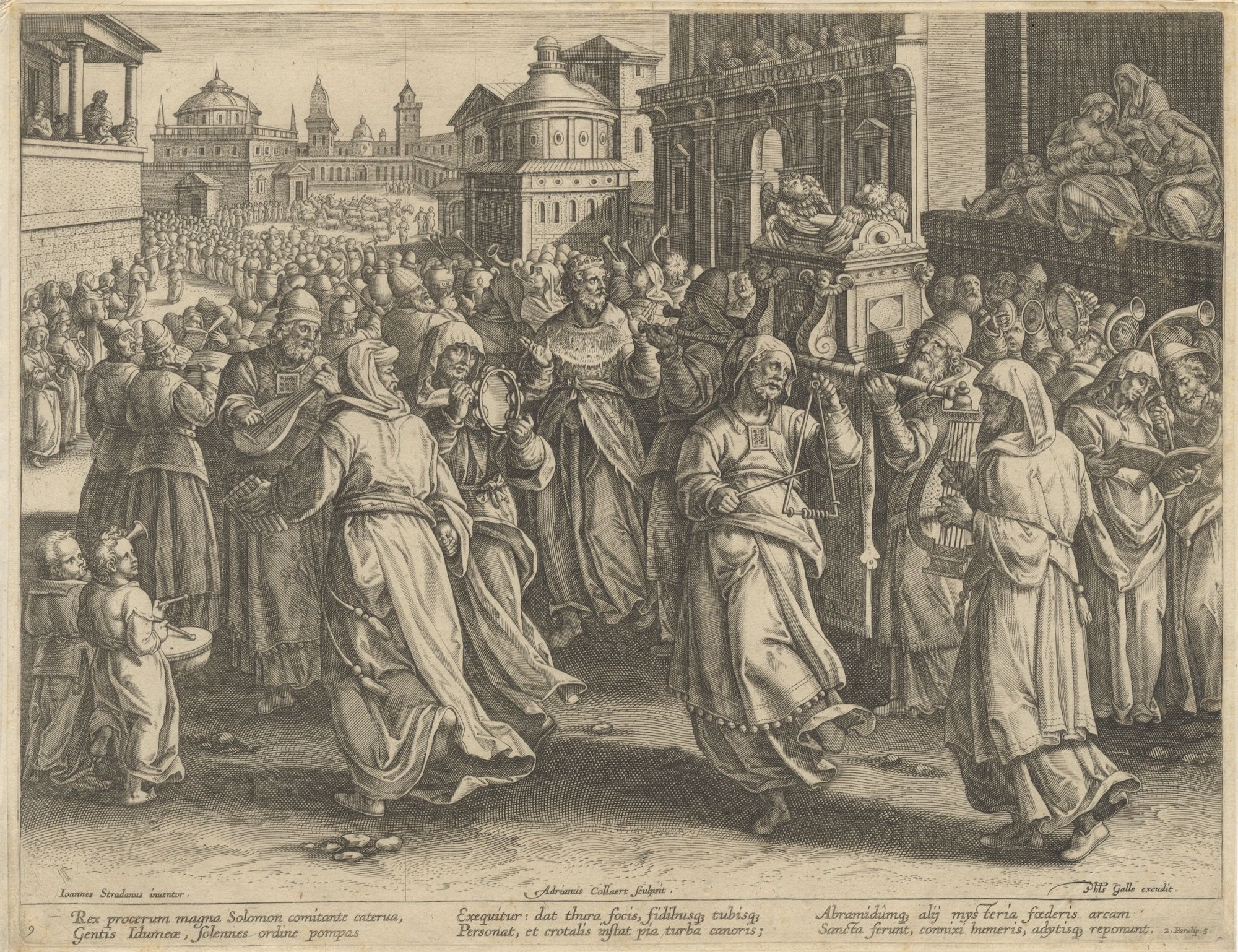 Antwerp: Philip Galle, 1590. Solomon takes the Tabernacle into the Temple, the Levites singing. 2 Chronicles v, 4-6. Plate 9.