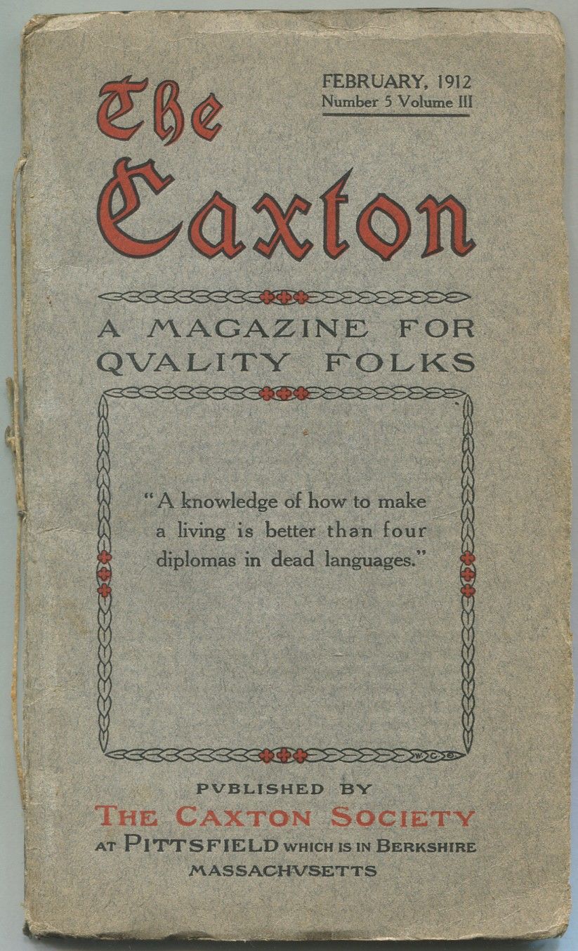 Berkshire, Massachusetts: The Caxton Society, 1912. Softcover. Very Good. Periodical. Octavo. 60pp. String-tied wrappers. Very good or better with date stamp on first page, typical wear to the yapped edges and glue remnant on the spine, suggest it was came from a bound volume.