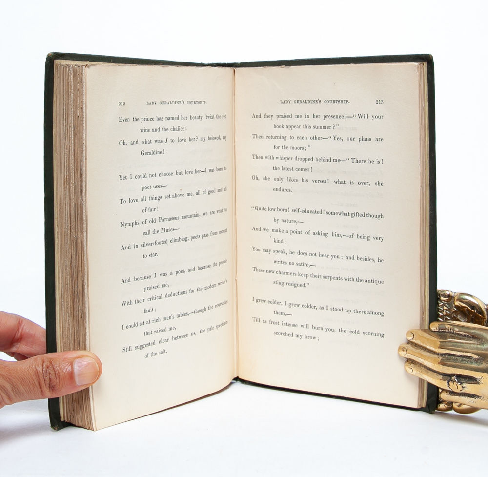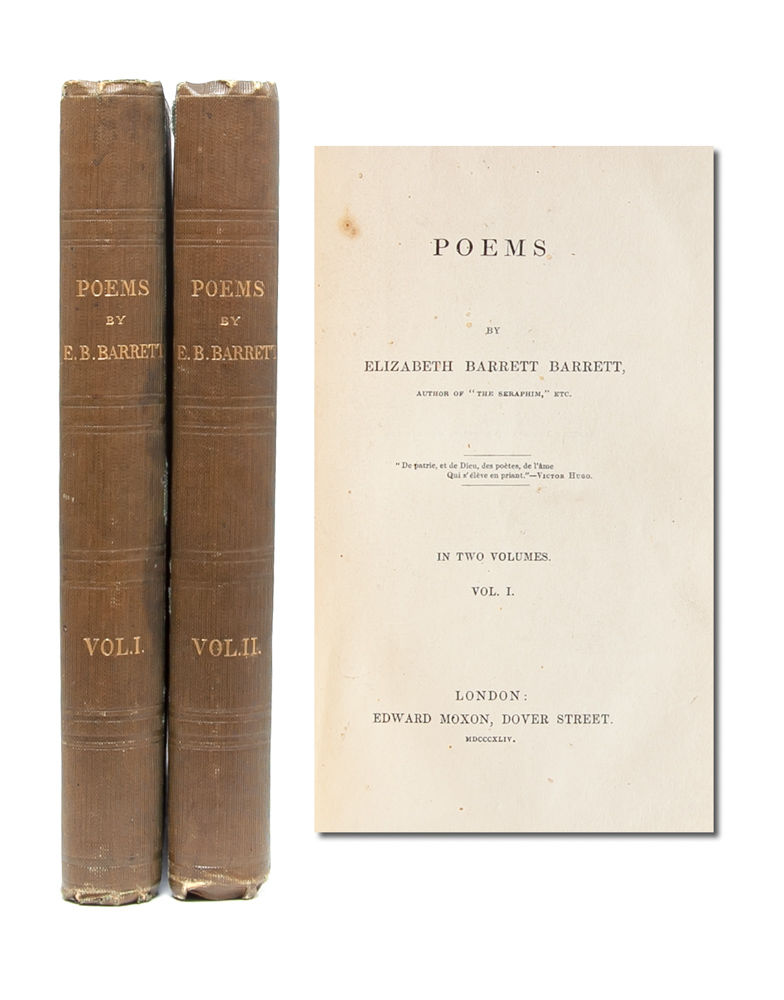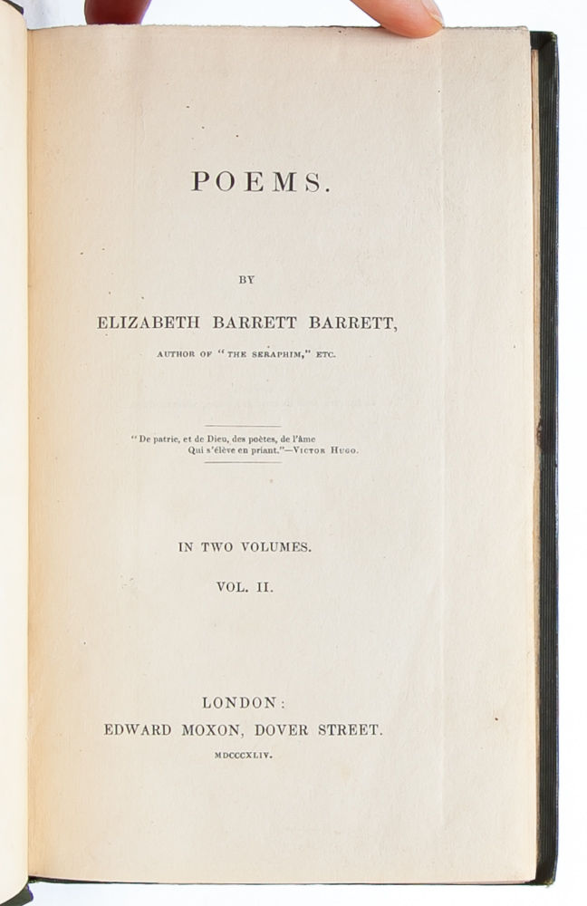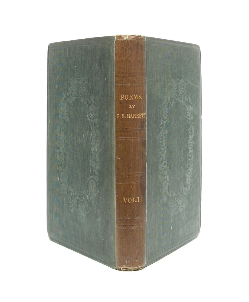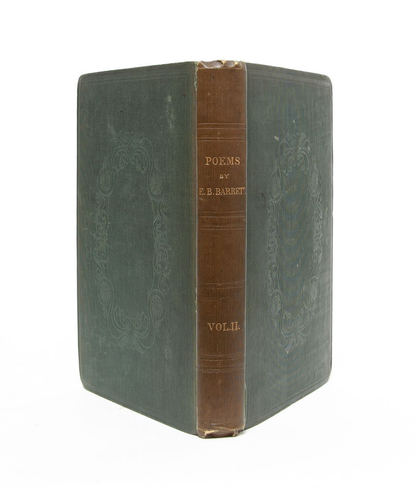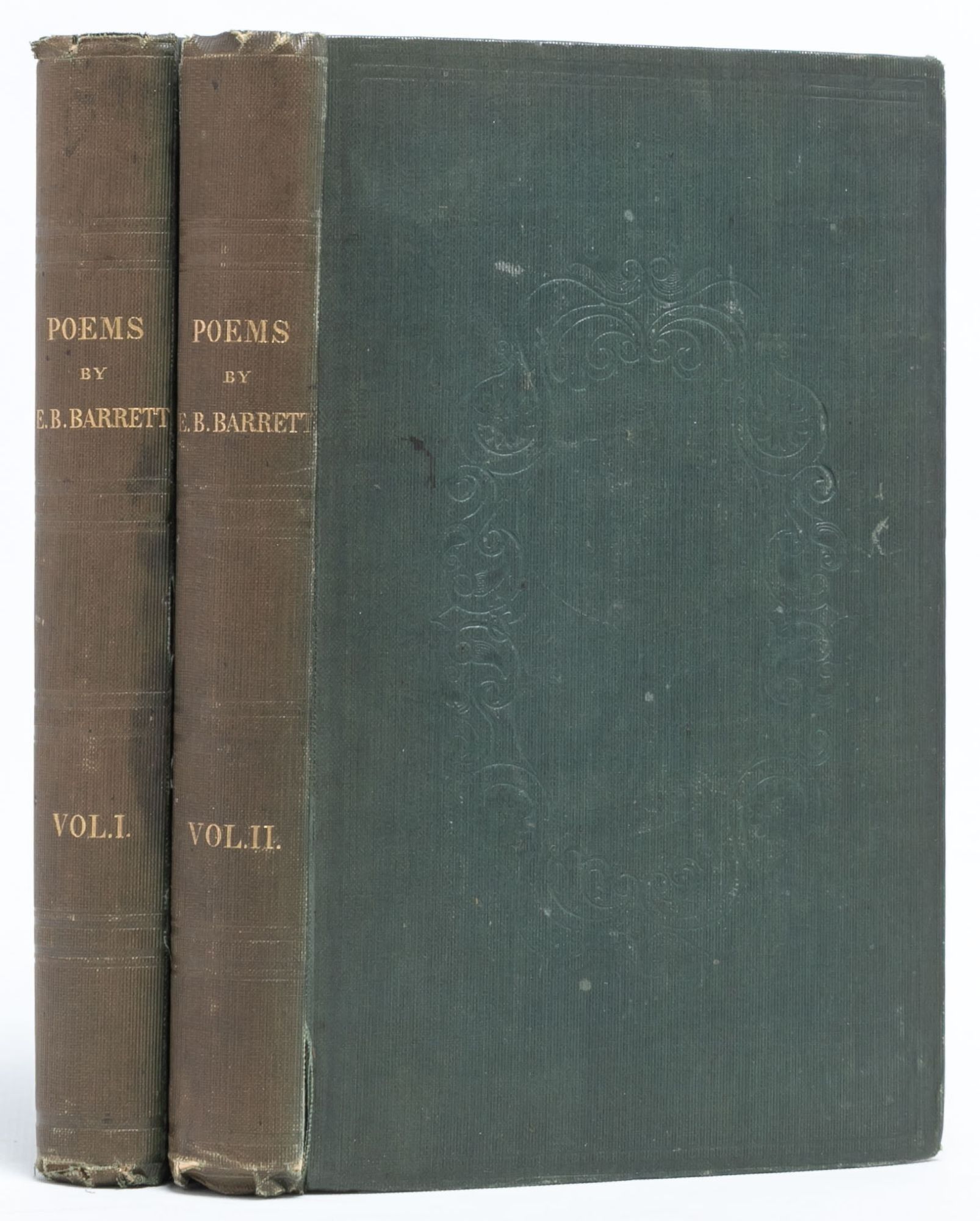 Praised by journalist Harriet Martineau as an "immense advance" in original poetry, Browning's two volume set was immensely popular immediately following its release. Browning increased her commitment to using literature to produce social change, composing works for this collection that were "sentimental yet politically-charged and heaving with genuine empathy" (British Library). Drawing attention to social inequity that resulted from English economic policy in pieces like The Cry of the Children, her poem The Runaway Slave at Pilgrim's Point further addressed the real life tragedies experienced by black women forced into the American slave trade. Other poems, including those in praise of George Sand, considered the challenges women writers confronted within a patriarchal culture. In this collection, Browning "anticipated Virginia Woolf's theory of the androgynous mind; the notion that the creative mind flourishes when a balance between the female/feminine and male/masculine is achieved. It entails being unconscious of, and thereby unrestrained by, biological sex" (British Library). Fine.