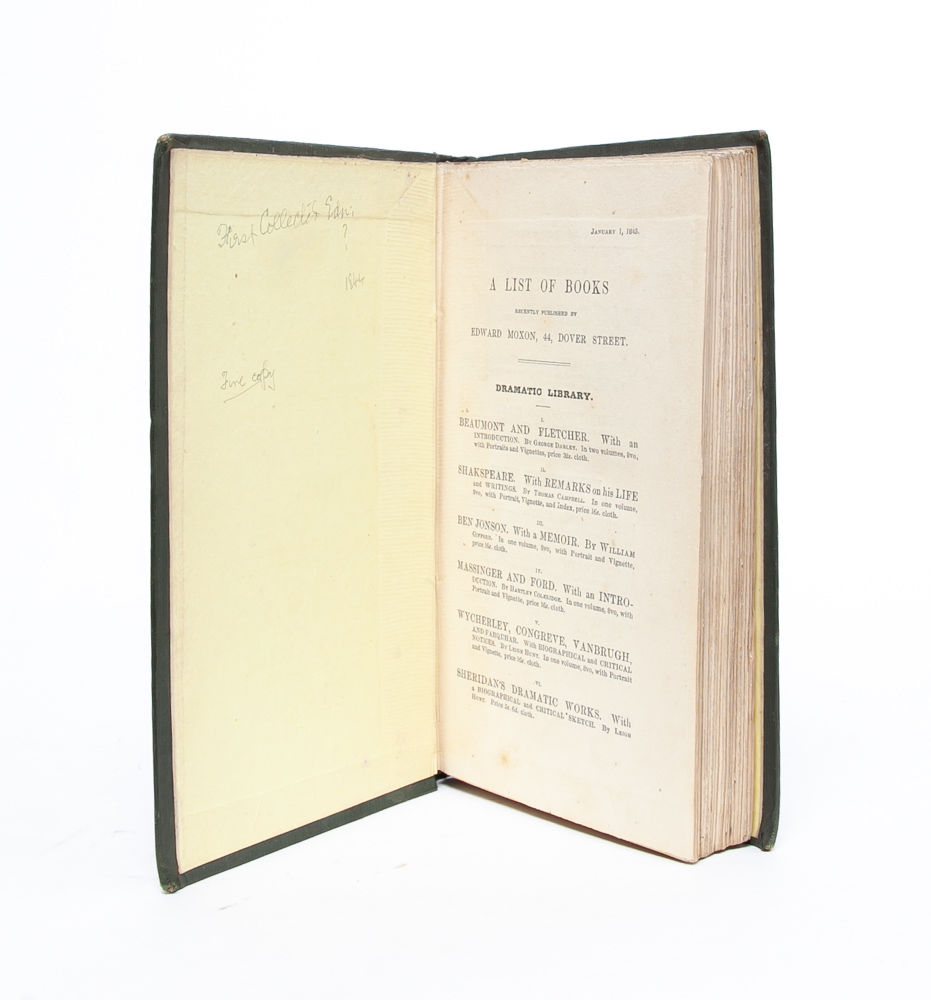 London: Edward Moxon, 1844. First edition. Fine. A Near Fine copy in the publisher's original cloth binding. Spines a bit toned, slight wear at the extremities and a short split in the cloth on the lower spine of volume 2. Internally clean and fresh, an excellent set overall. It appears that sheets were mostly selected and bound up at random. This copy with a publisher's catalogue tipped into vol. 1 dated Jan. 1845 and with the corrected reading of the lines on page 141 (2nd state). In vol. 2 pgs 160 and 163 are correctly numbered (1st state), but page 275 finishes with "The End" (2nd state).