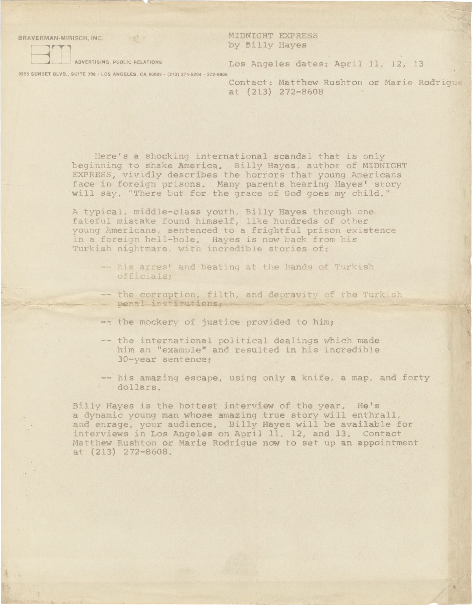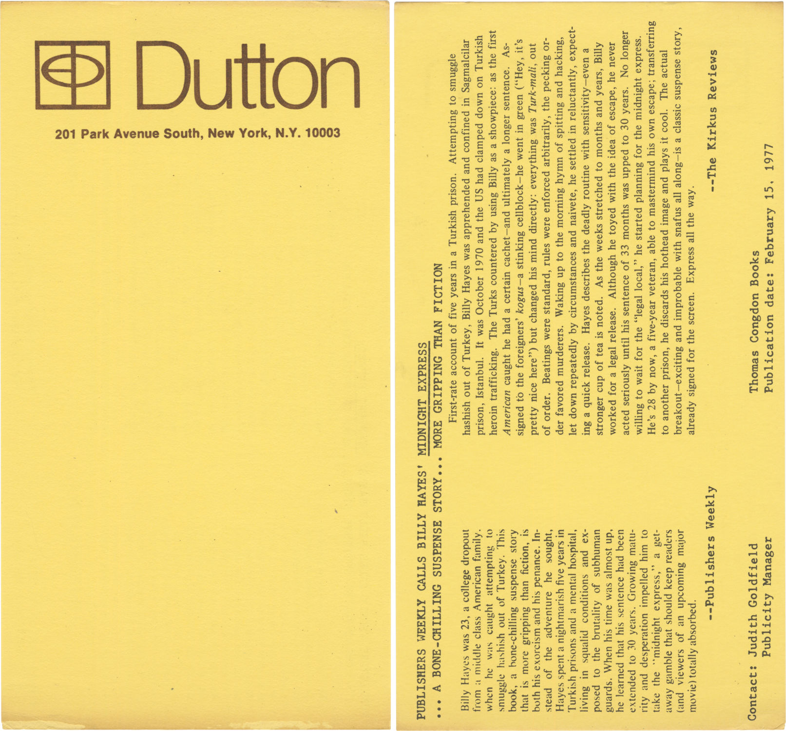 Basis for the 1978 film directed by Alan Parker, starring Brad Davis and Irene Miracle. A nonfiction account of Billy Hayes' experience in a Turkish prison after trying to smuggle hashish out of the country.