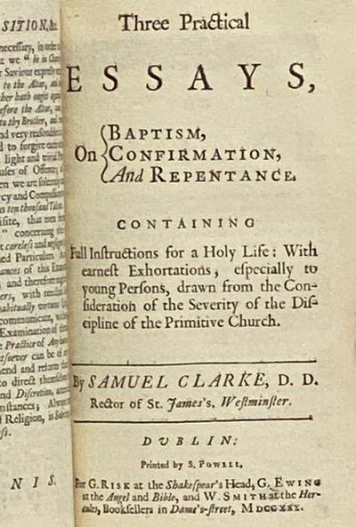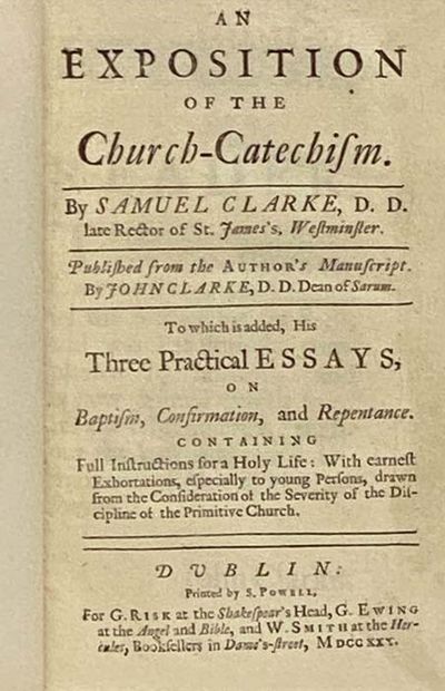 Dublin: S. Powell, for G. Risk at the Shakespear's Head, G. Ewing at the Angel and Bible, and W. Smith at the Hercules, Booksellers in Dame's-Street, 1730. First Irish Edition. Half-Leather. Near Fine/No Jacket. First Irish edition. Ink number stamp on page following title page of Exposition. Rebound by Green Dragon Bindery in half-leather with marbled boards, with their sticker on the rear endpaper. Two volumes bound in one. 172, 140 pp. ESTC T212209. Samuel Clarke was among those who delivered Boyle's Lectures. He was a friend of Isaac Newton, and translated Newton's Opticks, while defending him from the criticisms of Leibniz. The first of the two works included in this volume was published from the author's manuscript by John Clarke, D.D., Dean of Sarum, and is the first Irish edition of the work. The second work comprises three essays written by S. Clarke, which had previously been published in Ireland, but appear together with the Exposition here for the first time.