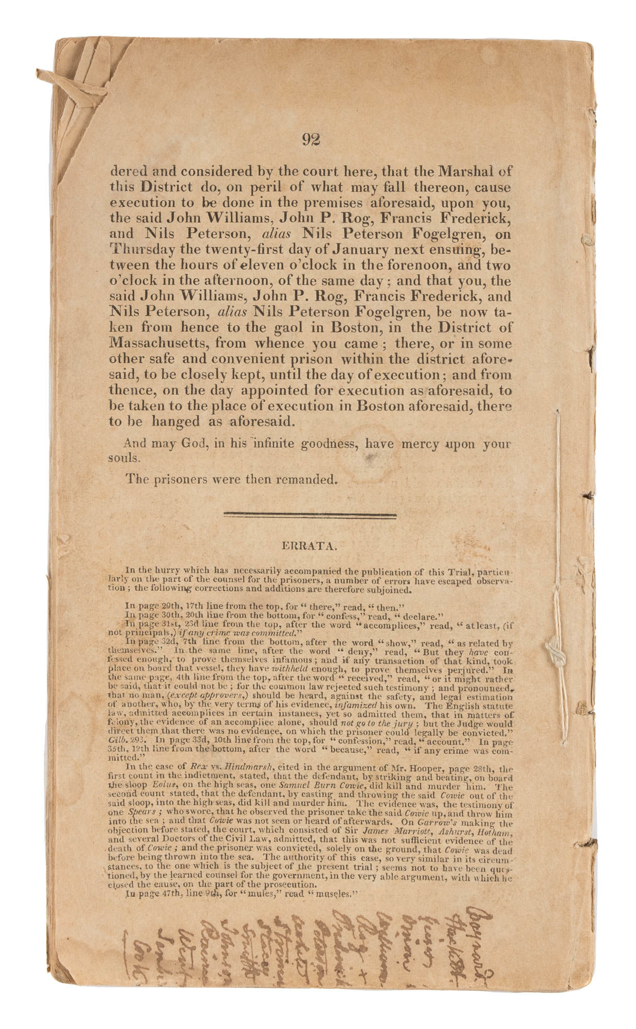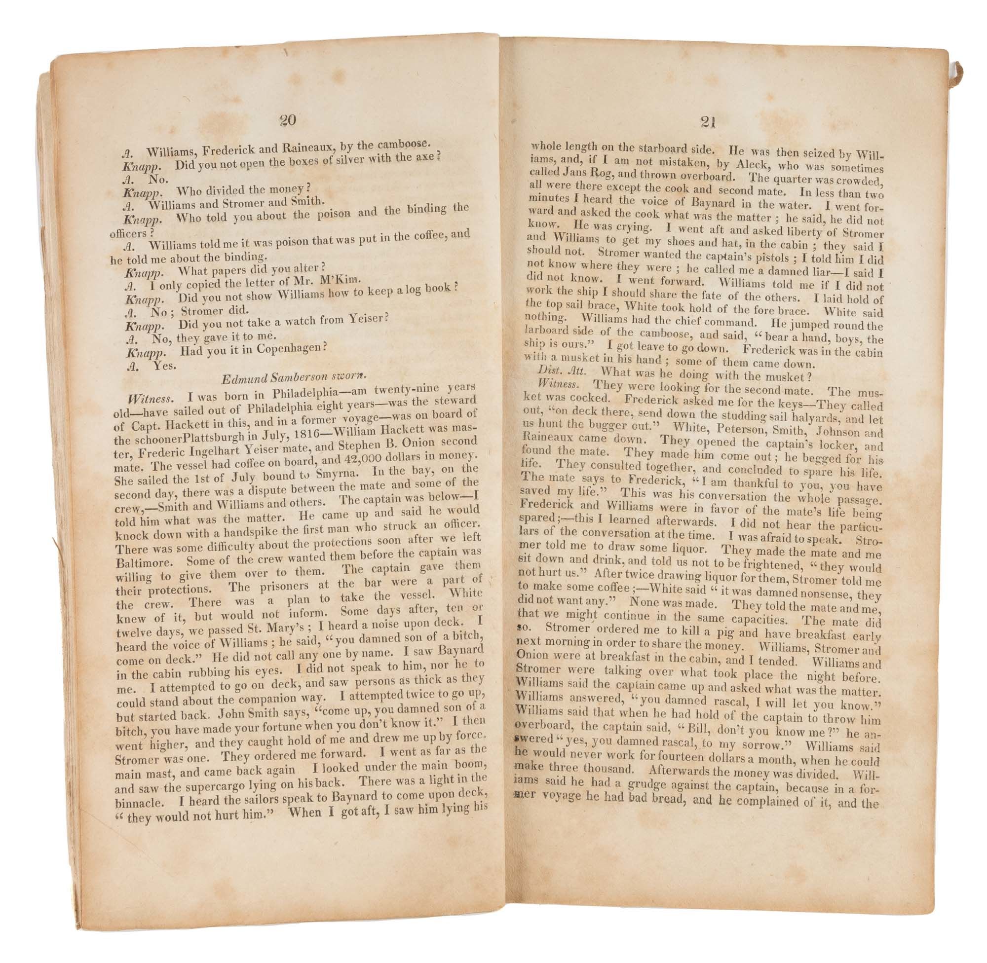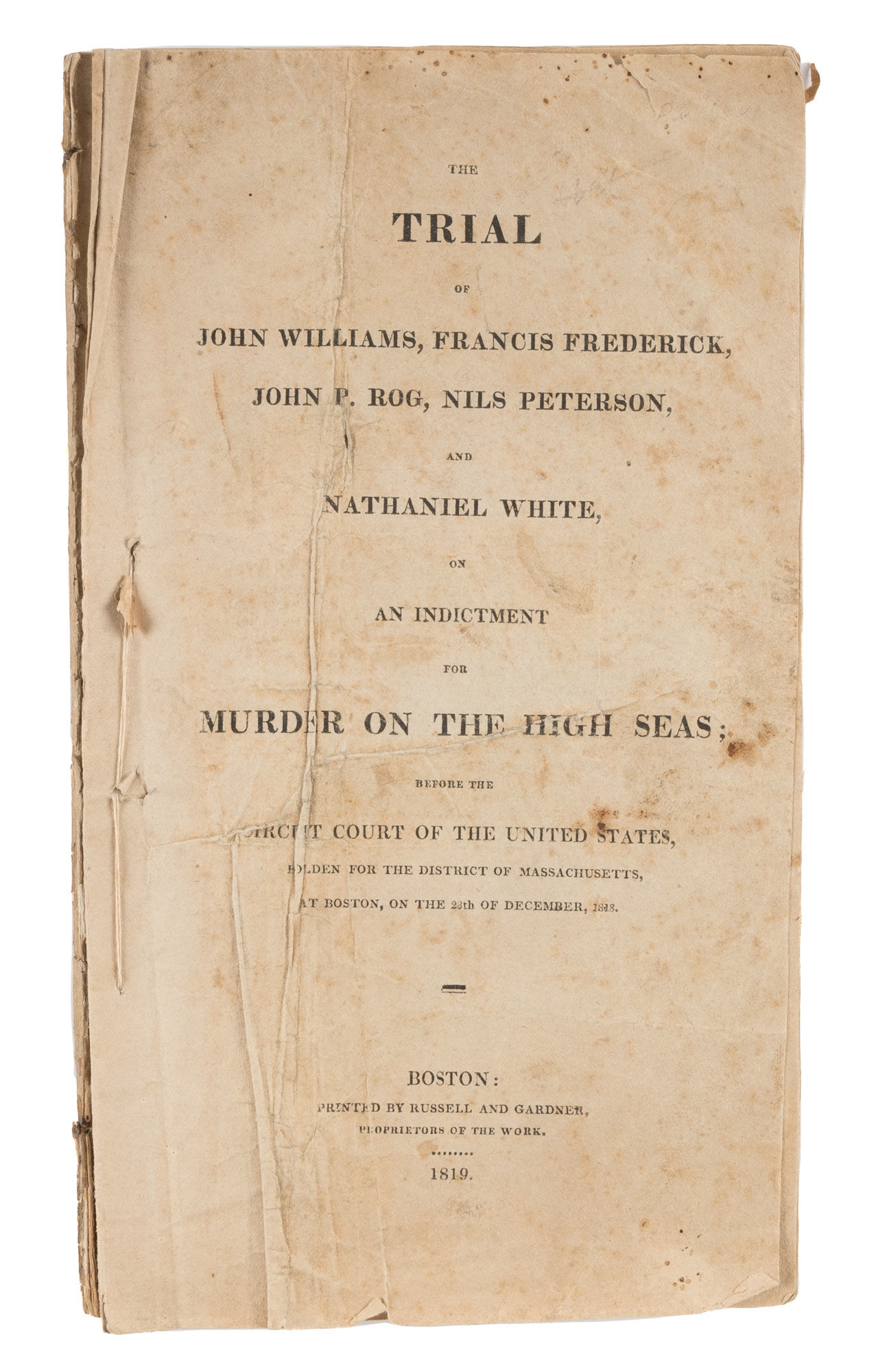 1819. Boston: Russell & Gardner, 1819. 92 pp. Boston: Russell & Gardner, 1819. 92 pp. Mutiny, Murder and Piracy: McDade 1103 [Trials]. Williams, John [1789-1819], Primary Defendant. The Trial of John Williams, Francis Frederick, John P. Rog, Nils Peterson, And Nathaniel White, On an Indictment for Murder on the High Seas; Before the Circuit Court of the United States, Holden for the District of Massachusetts, At Boston, On the 29th of December, 1818. Boston: Printed by Russell and Gardner, 1819. 92 pp. Octavo (9-1/2" x 5-1/2"; 24.1 x 14 cm). Stab-stitched pamphlet, untrimmed edges. Moderate edgewear, moderate toning and light foxing to text, title page wrinkled. Interesting listing of 17 names, presumably the crew, at the bottom of the last page. $1,500. * Only edition of an original account of American piracy. The defendants were accused of mutiny aboard the schooner "Plattsburgh" off the Georgia coast in 1816, and of the murder of the supercargo, Thomas Bayard, during the mutiny. It was a bloody scene, rehearsed in great detail in the 92 pages of this pamphlet. There was $40,000 aboard, so the mutiny was piratically motivated. The villains split up the money, sailed to Denmark and were arrested in Copenhagen where the mate, a hostage of sorts, blew the whistle on them. The case was heard before Joseph Story in his capacity as the Judge of the U.S. Circuit Court for the District of Massachusetts. The jury found all except Nathaniel White guilty of murder and piracy, and they were hanged in January 1820. It made quite a splash in its day, and several sensational narratives besides this one were published. Cohen, Bibliography of Early American Law 13248. McDade, The Annals of Murder 1103.